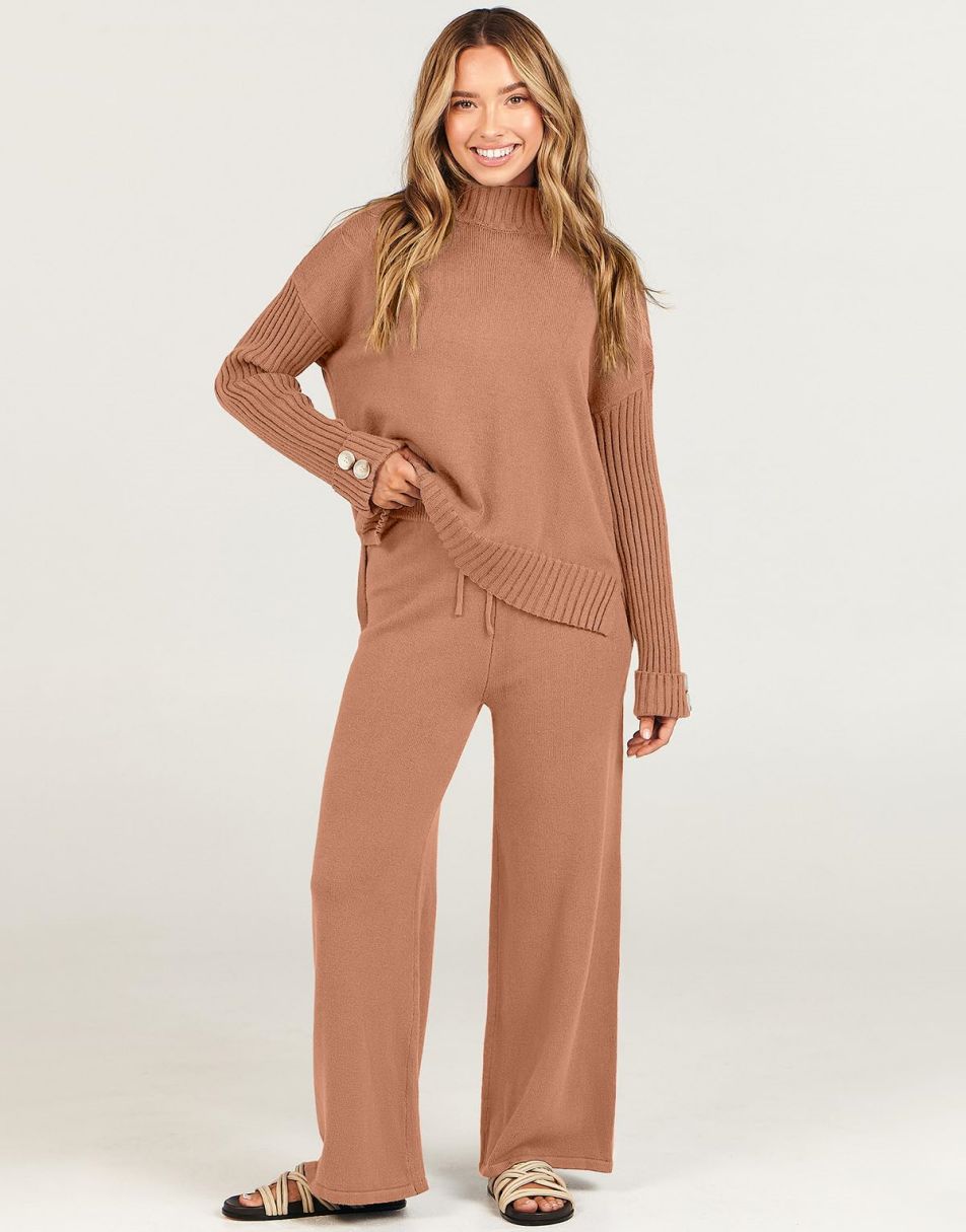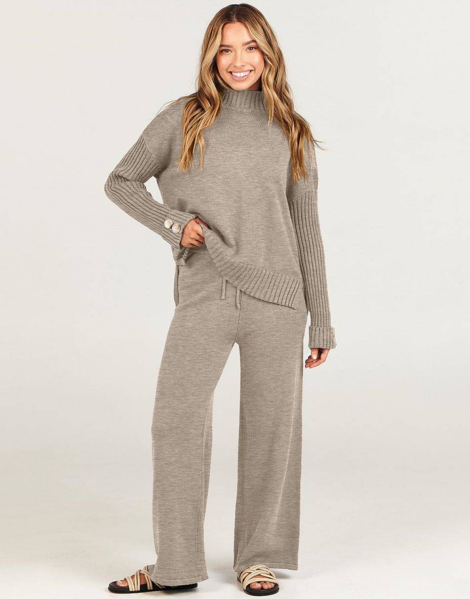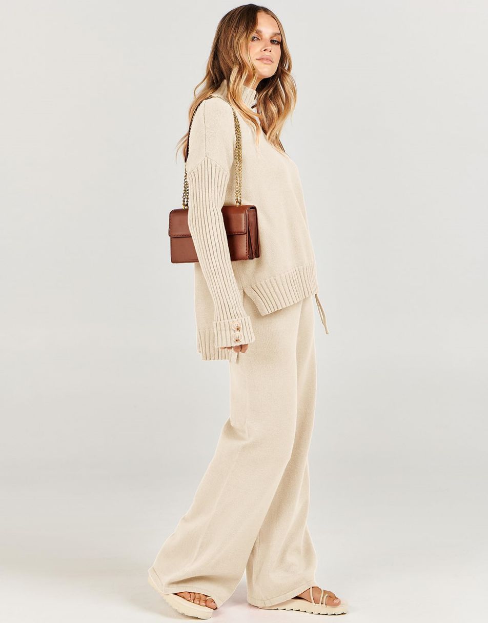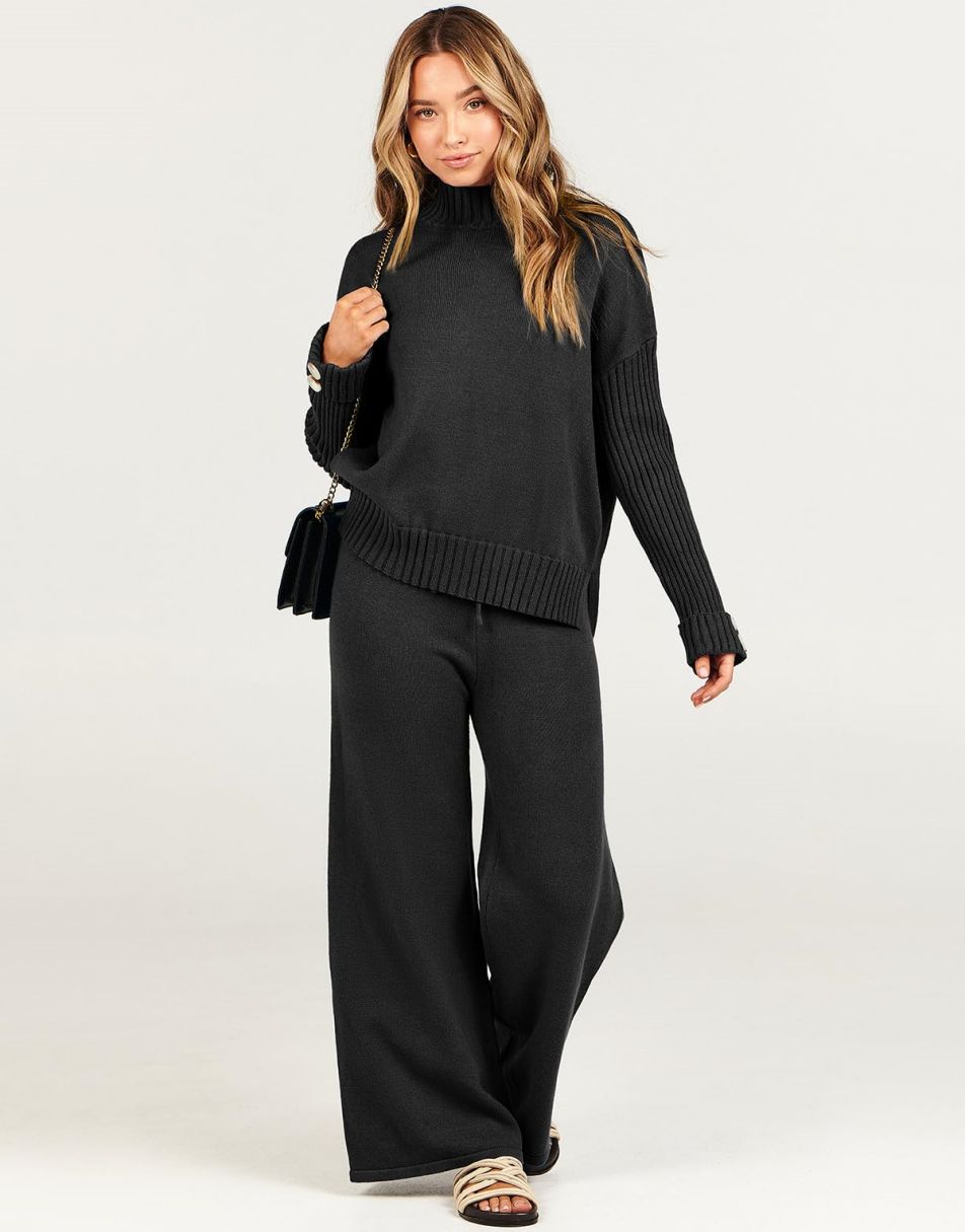 - Fabric - Perfect in a so soft knit fabrication, this two piece matching set is a cozy instant outfit. Slouchy, relaxed fit with wide-leg pants.