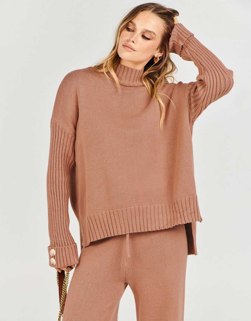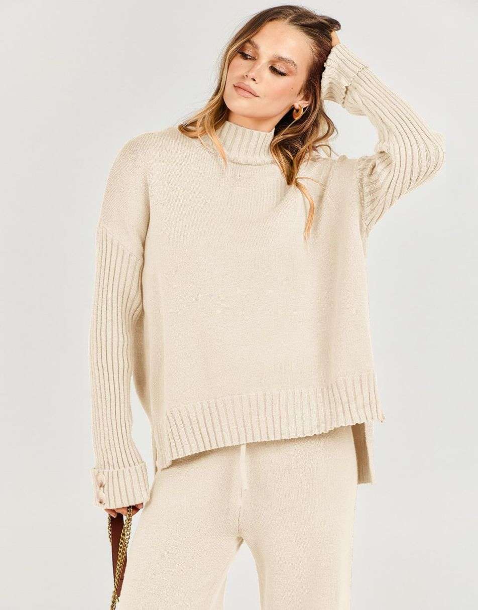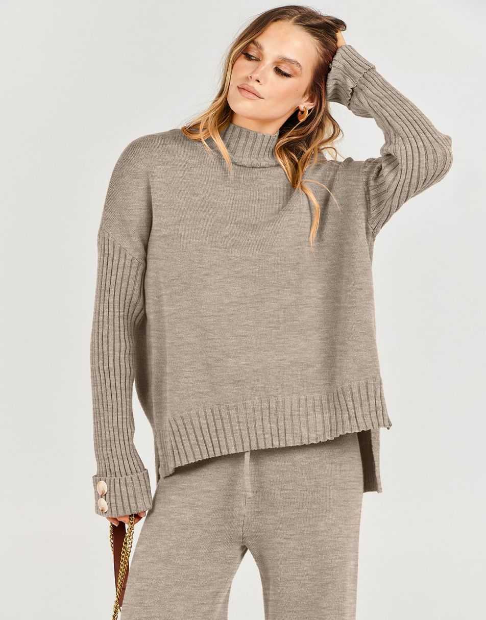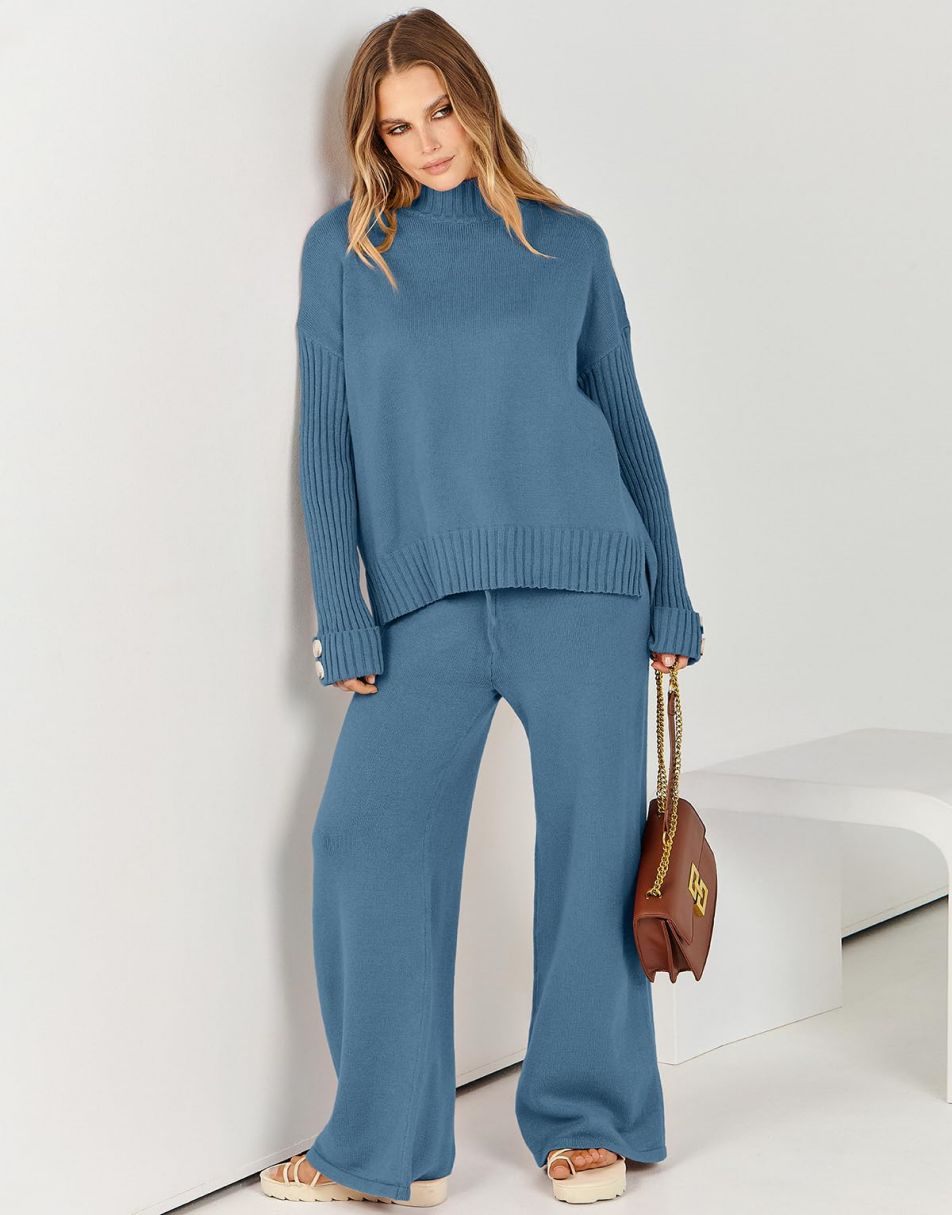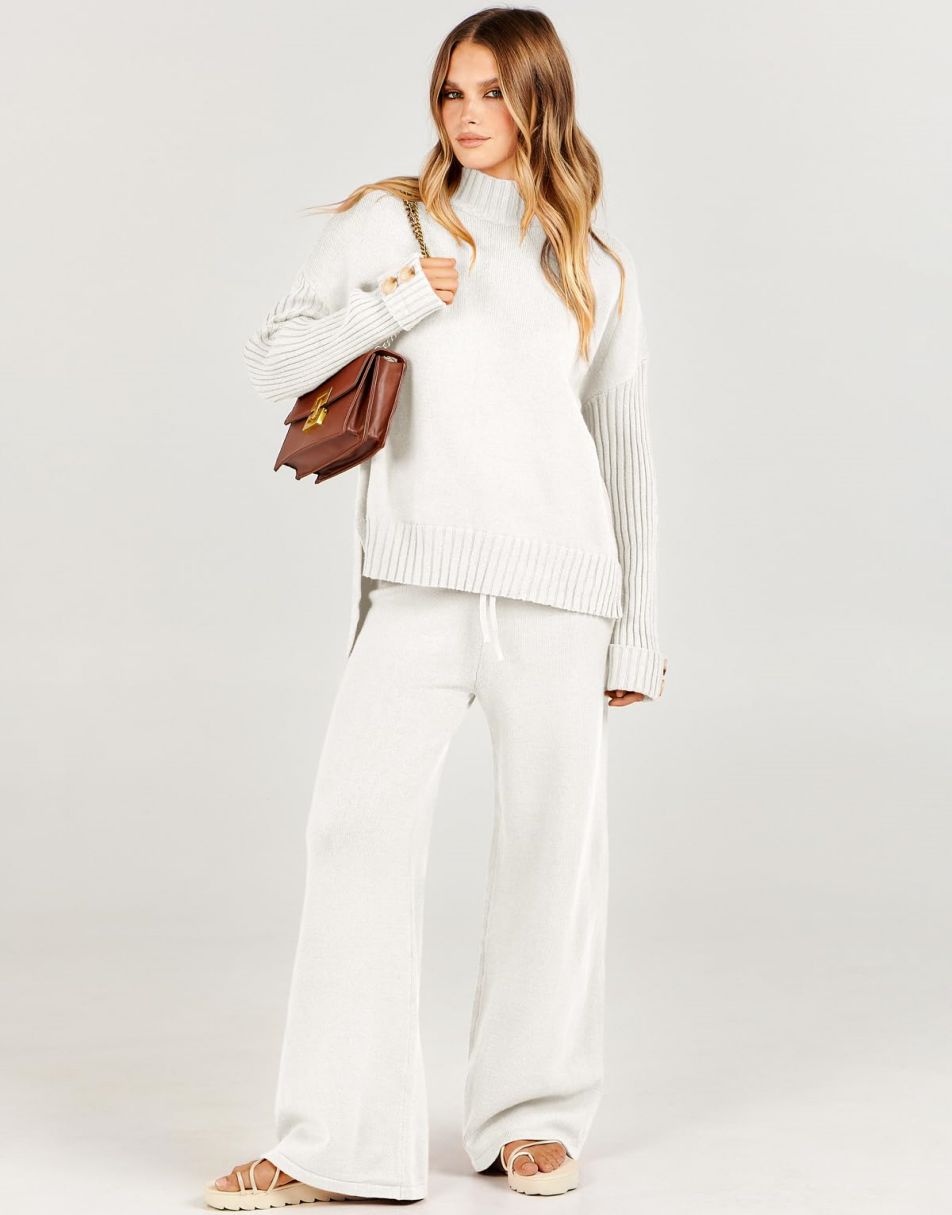 - Fabric - Perfect in a so soft knit fabrication, this two piece matching set is a cozy instant outfit. Slouchy, relaxed fit with wide-leg pants.