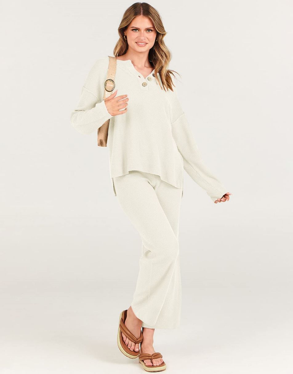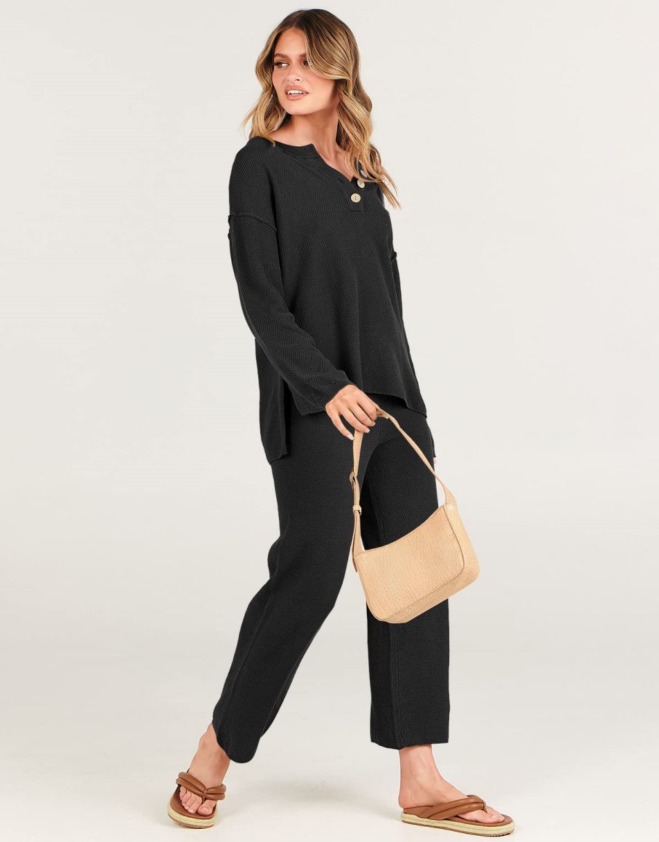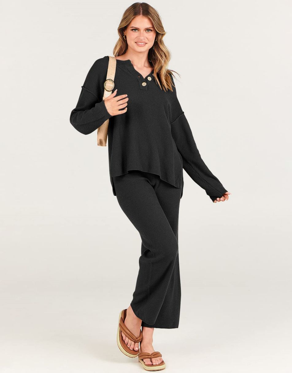 • Design -Top: crew neck, button design, oversized loose, side slit, dropped raglan sleeves; Pants: Elastic waistband, high-rise design, pull-on style. Worn as a set or separately to run errands or wear boots and wear it to dinner, it is so versatile you can wear it anyway you want.