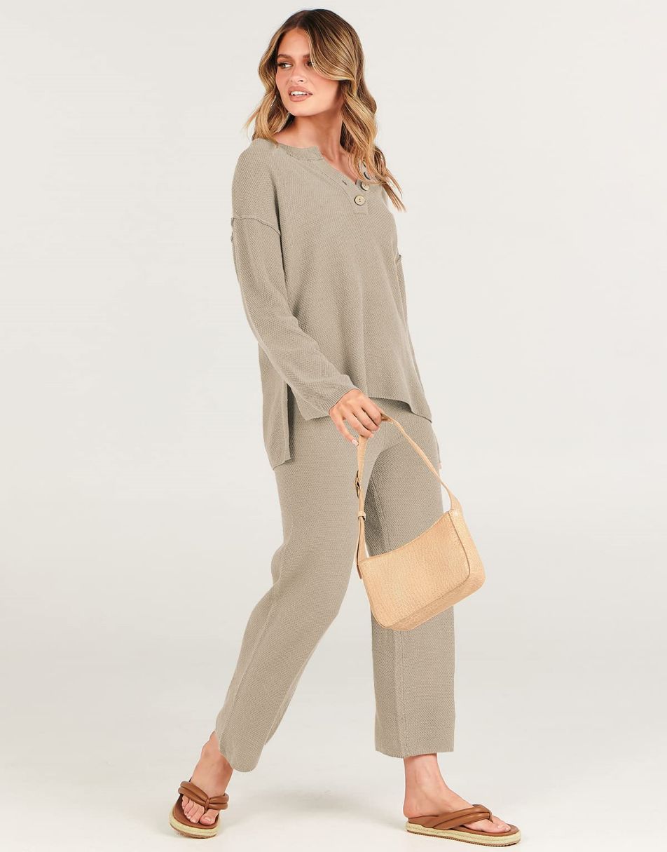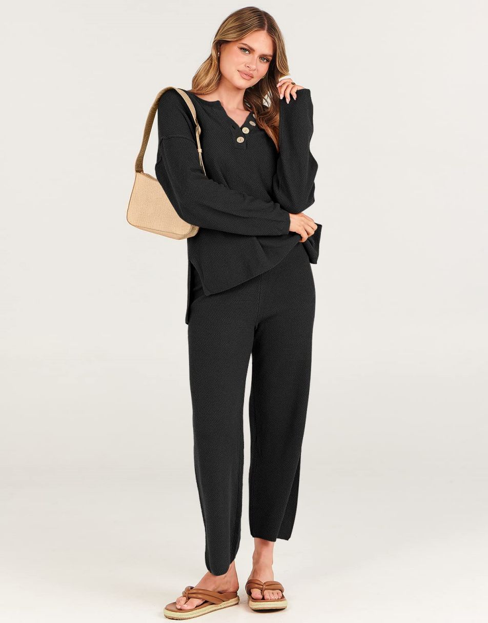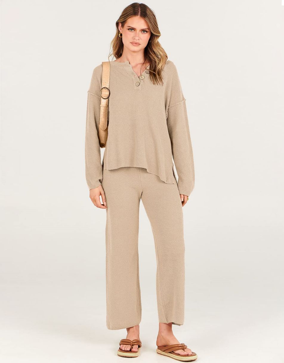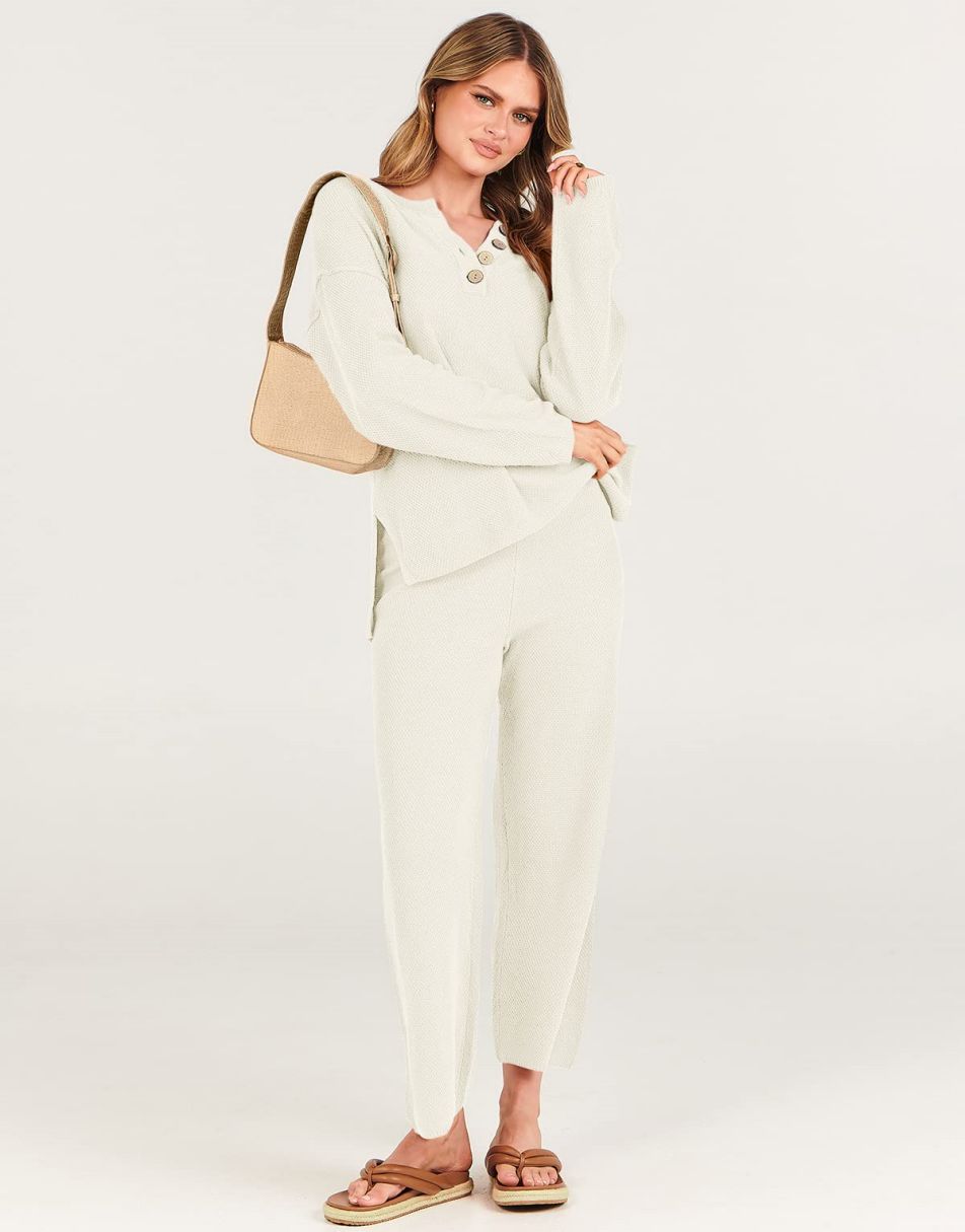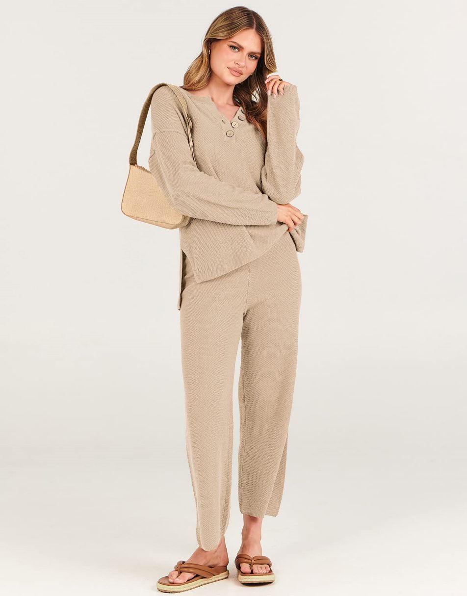 • Design -Top: crew neck, button design, oversized loose, side slit, dropped raglan sleeves; Pants: Elastic waistband, high-rise design, pull-on style. Worn as a set or separately to run errands or wear boots and wear it to dinner, it is so versatile you can wear it anyway you want.
