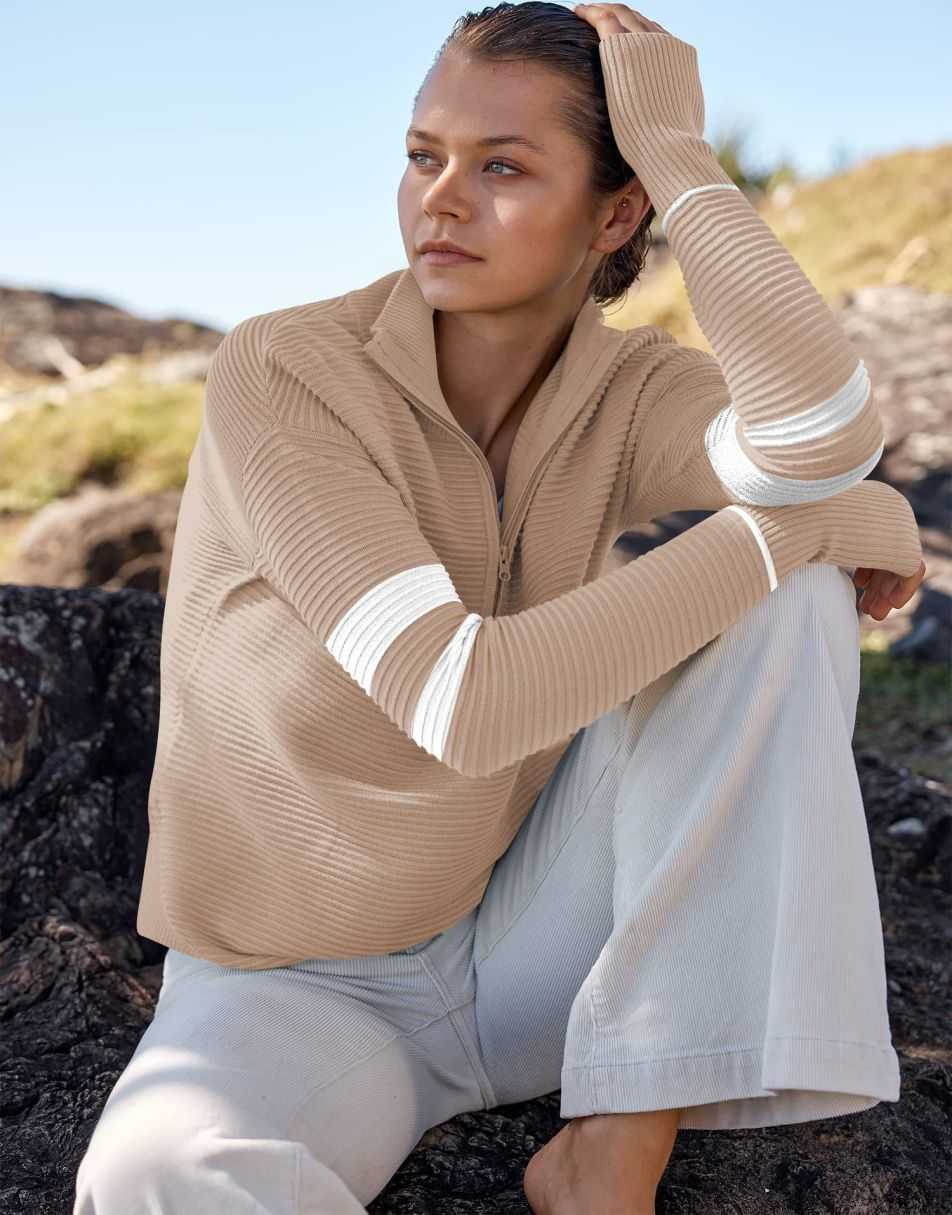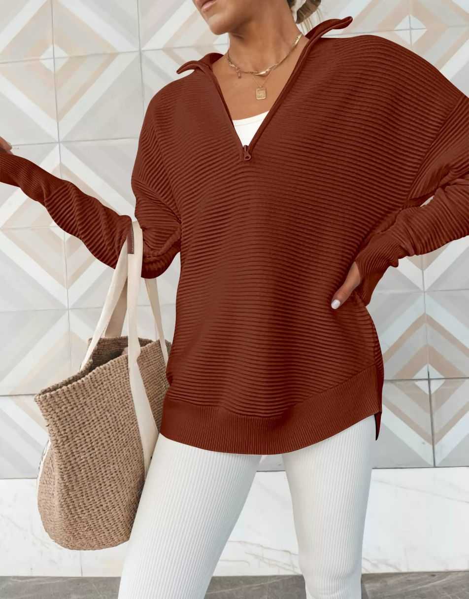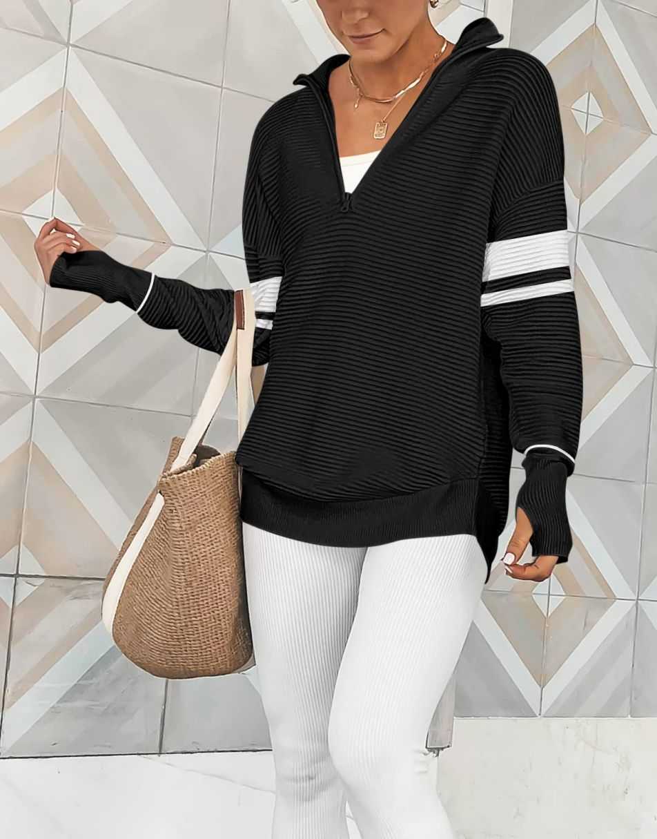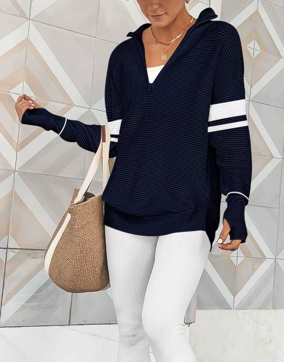 • Match - This Knit Sweater is so preppy and pretty! Designed with a zipper neckline and an loose fit. Styled with the Striped Beanie,Hoop Earrings, Simple Bracelet and Faux Bootie for a fahsion early fall look锛�