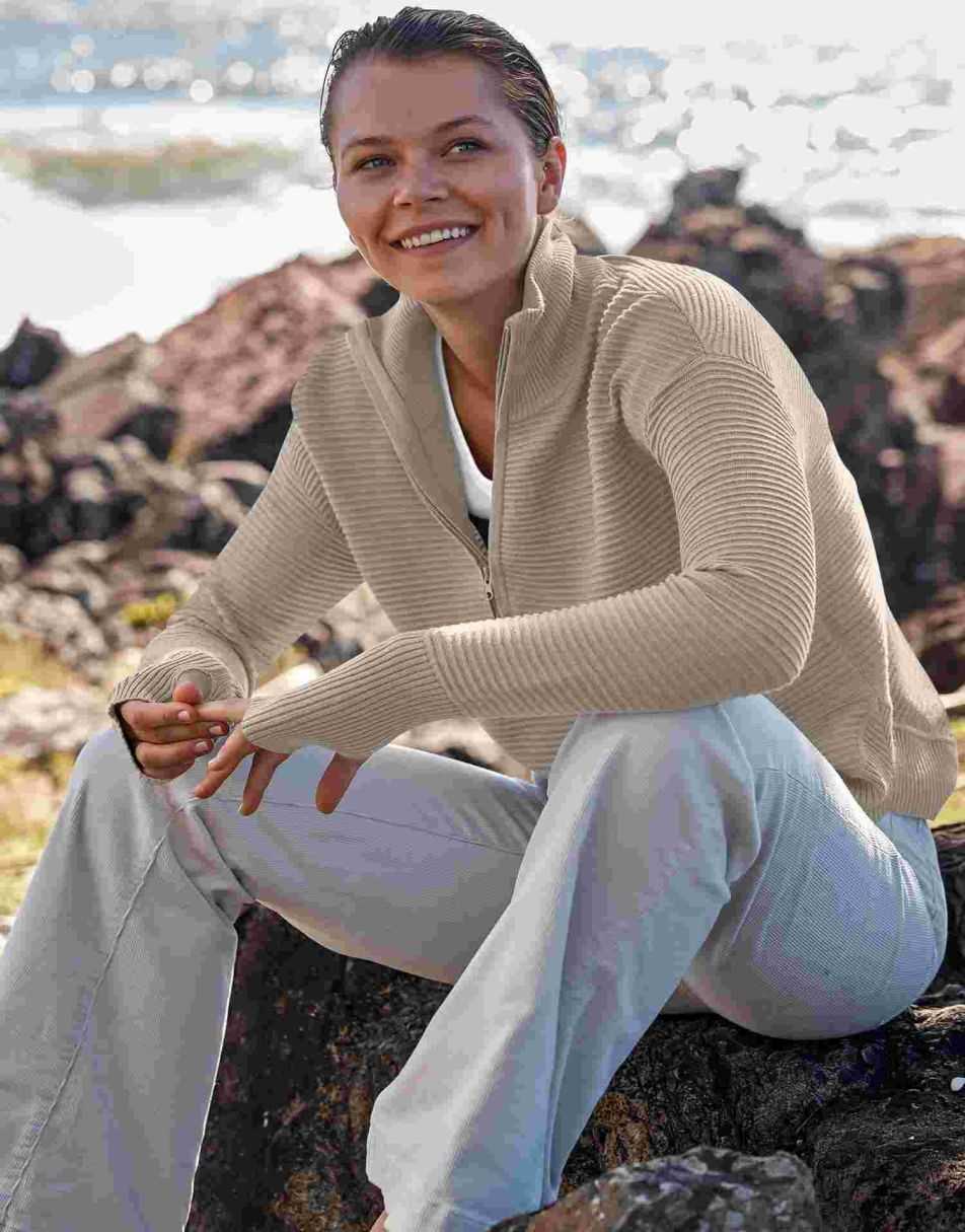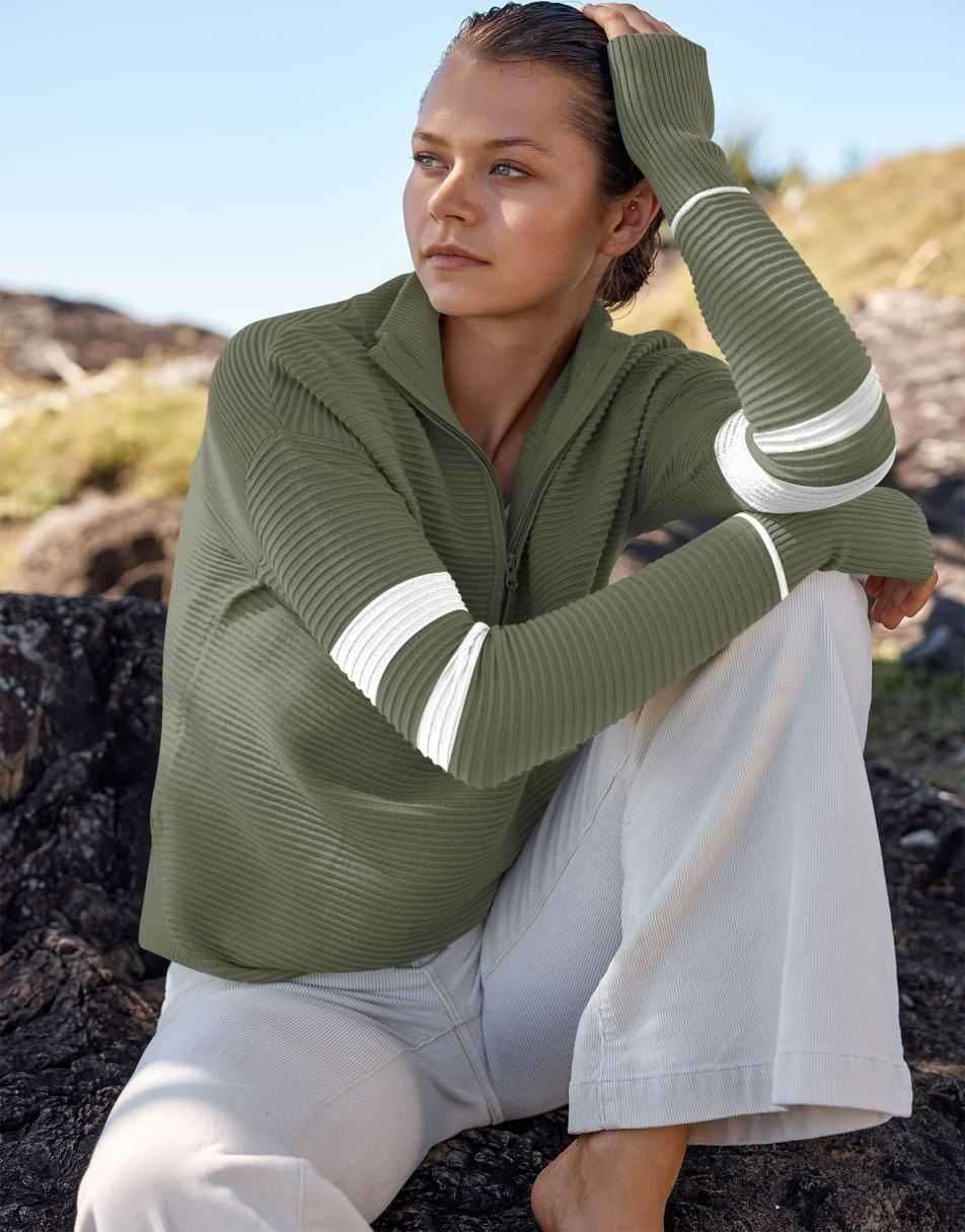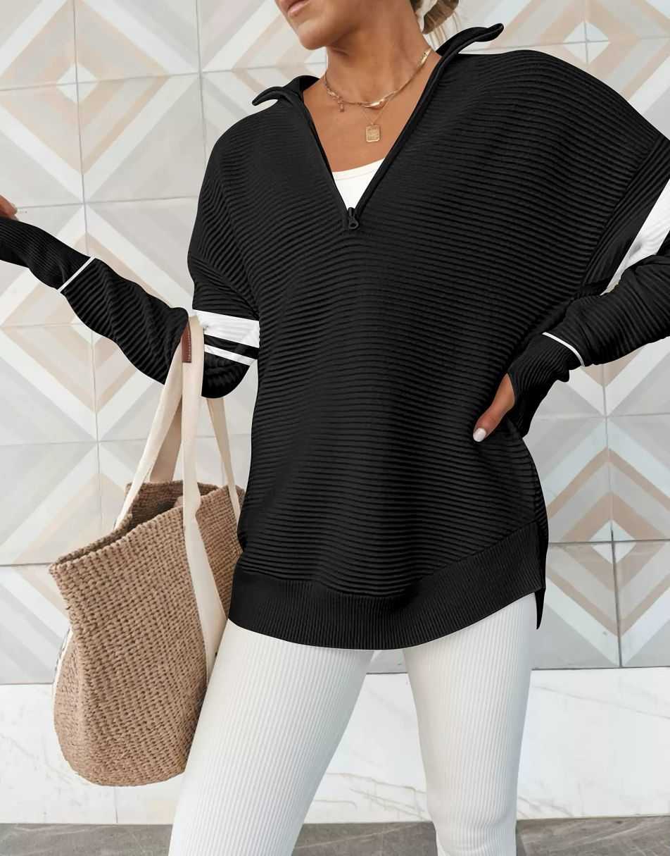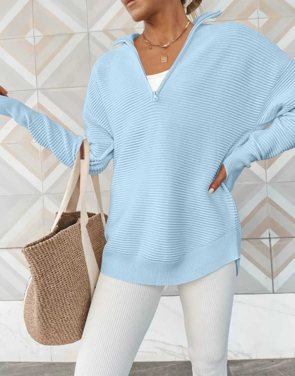 • Match - This Knit Sweater is so preppy and pretty! Designed with a zipper neckline and an loose fit. Styled with the Striped Beanie,Hoop Earrings, Simple Bracelet and Faux Bootie for a fahsion early fall look锛�