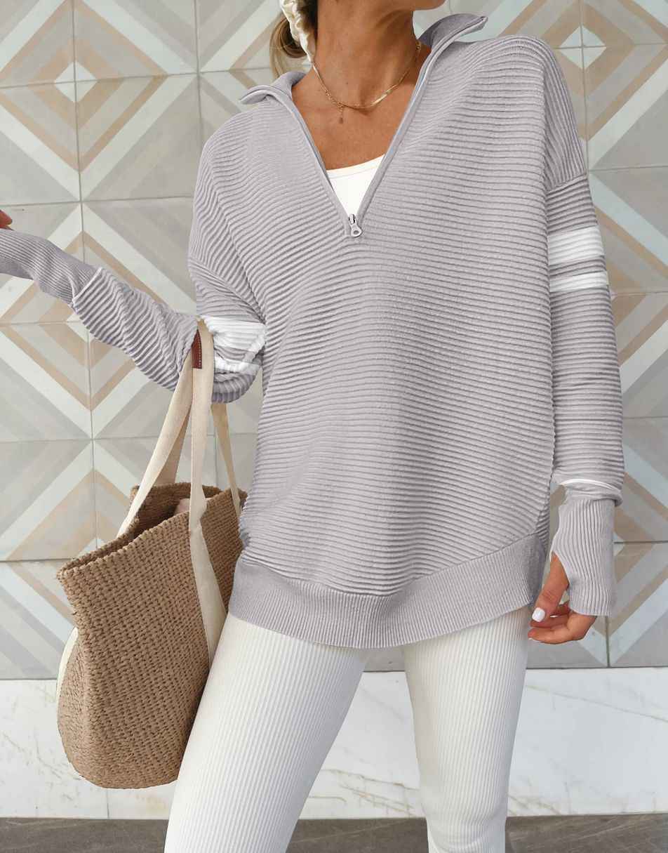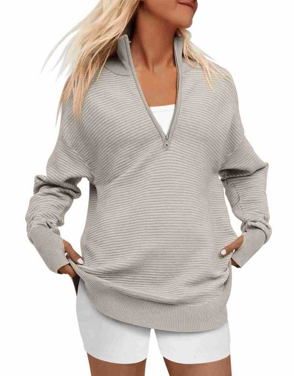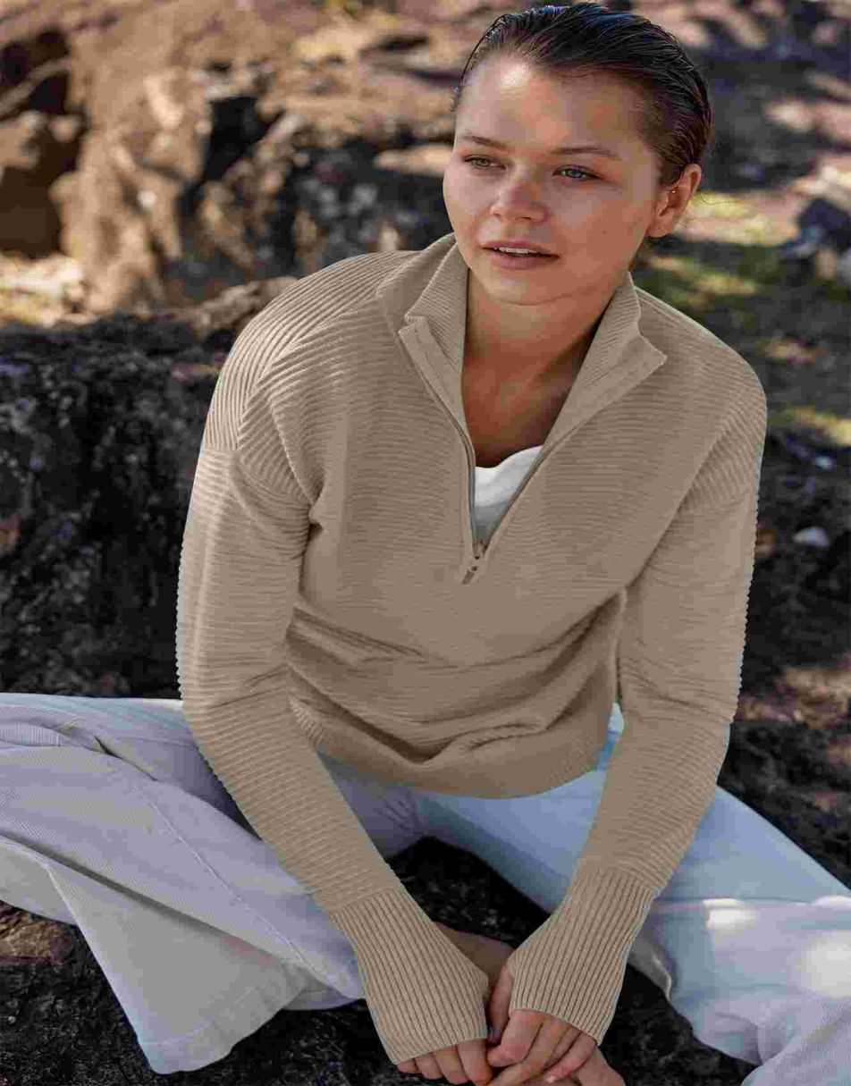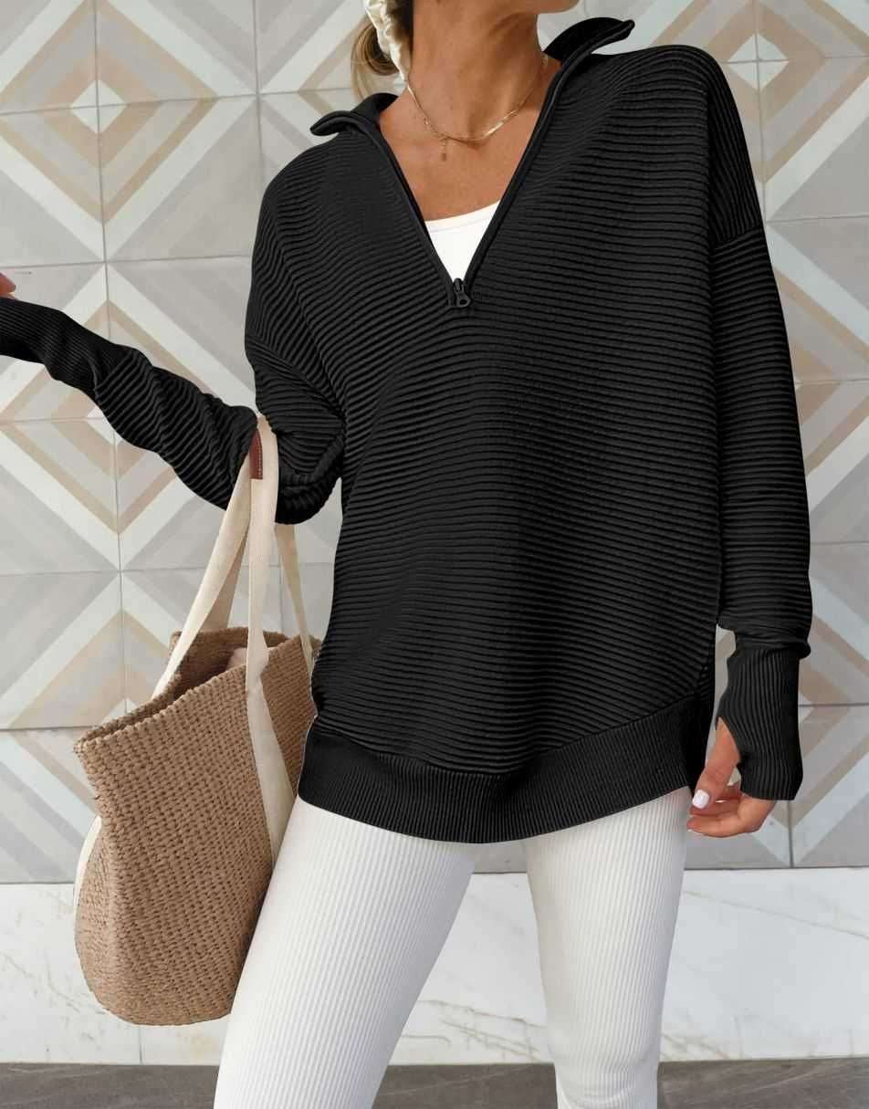 • Features - long sleeve with thumb hole detail锛�half zipper front锛�lapel collared v neck锛�ribbed knit fabrication锛�loose fit.