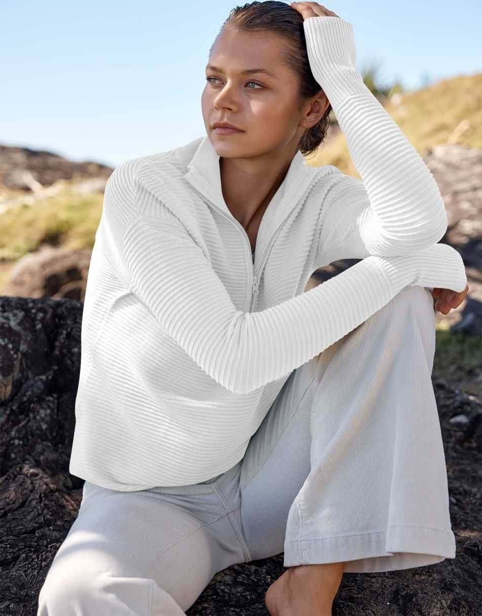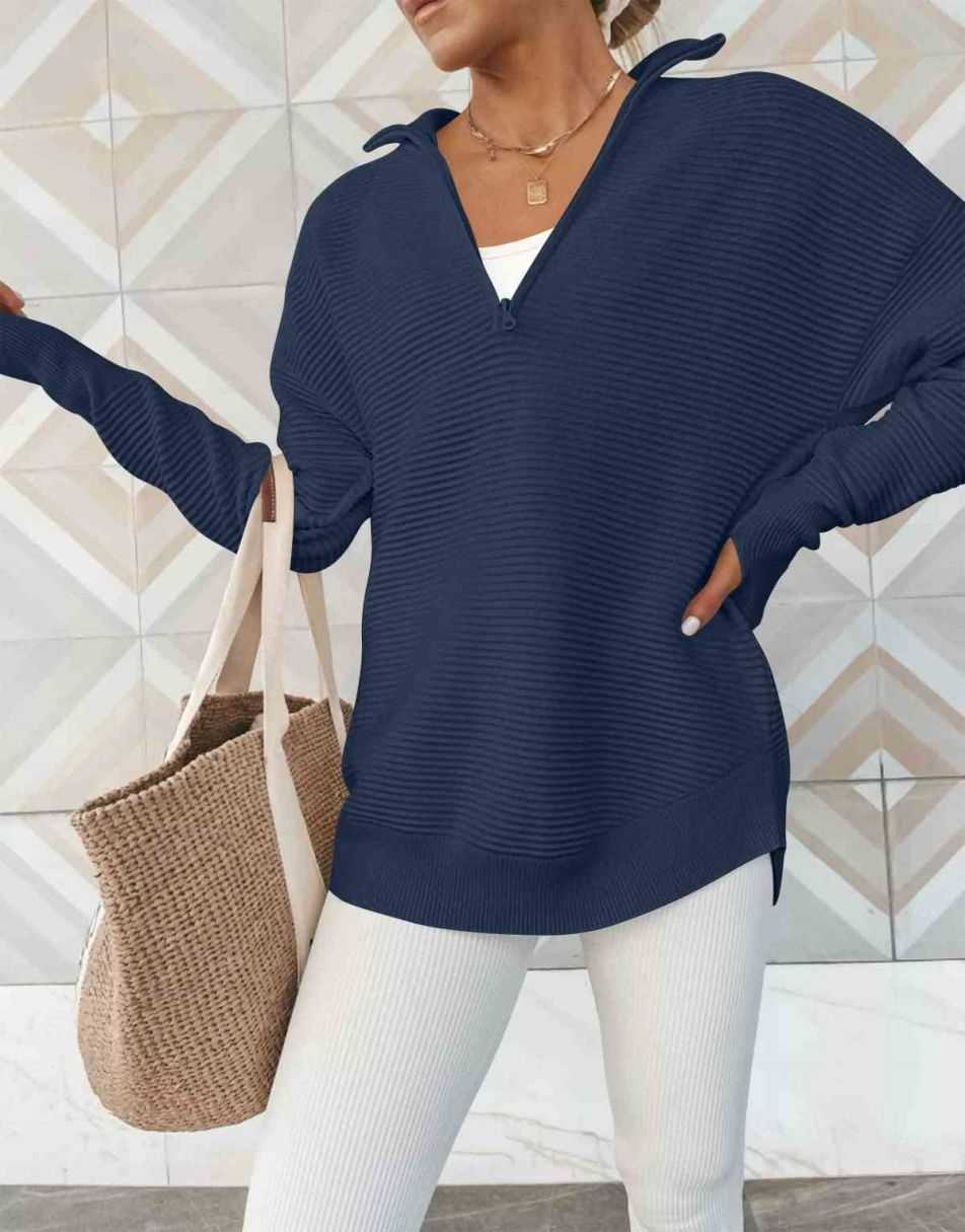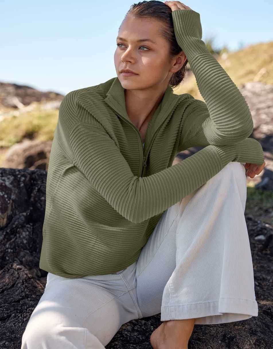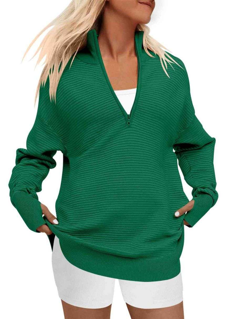 • Features - long sleeve with thumb hole detail锛�half zipper front锛�lapel collared v neck锛�ribbed knit fabrication锛�loose fit.