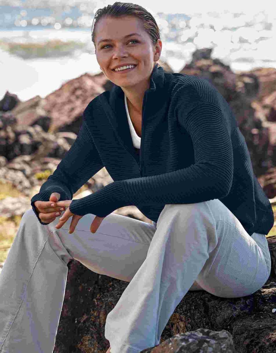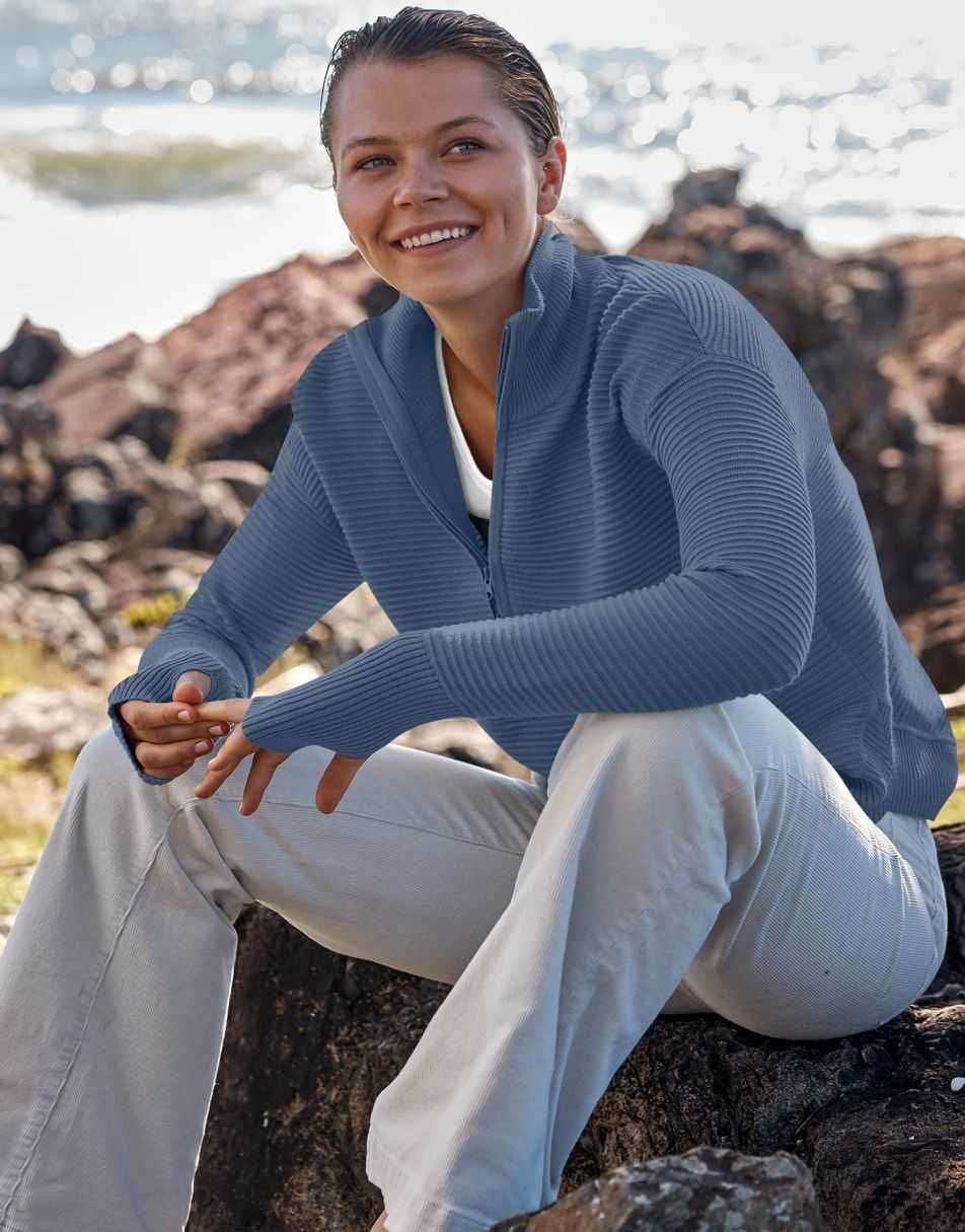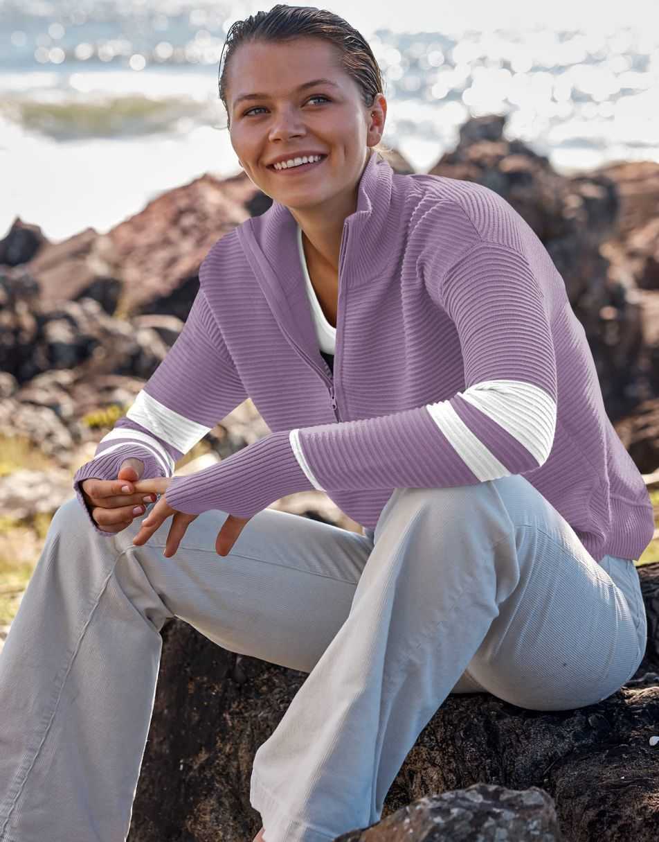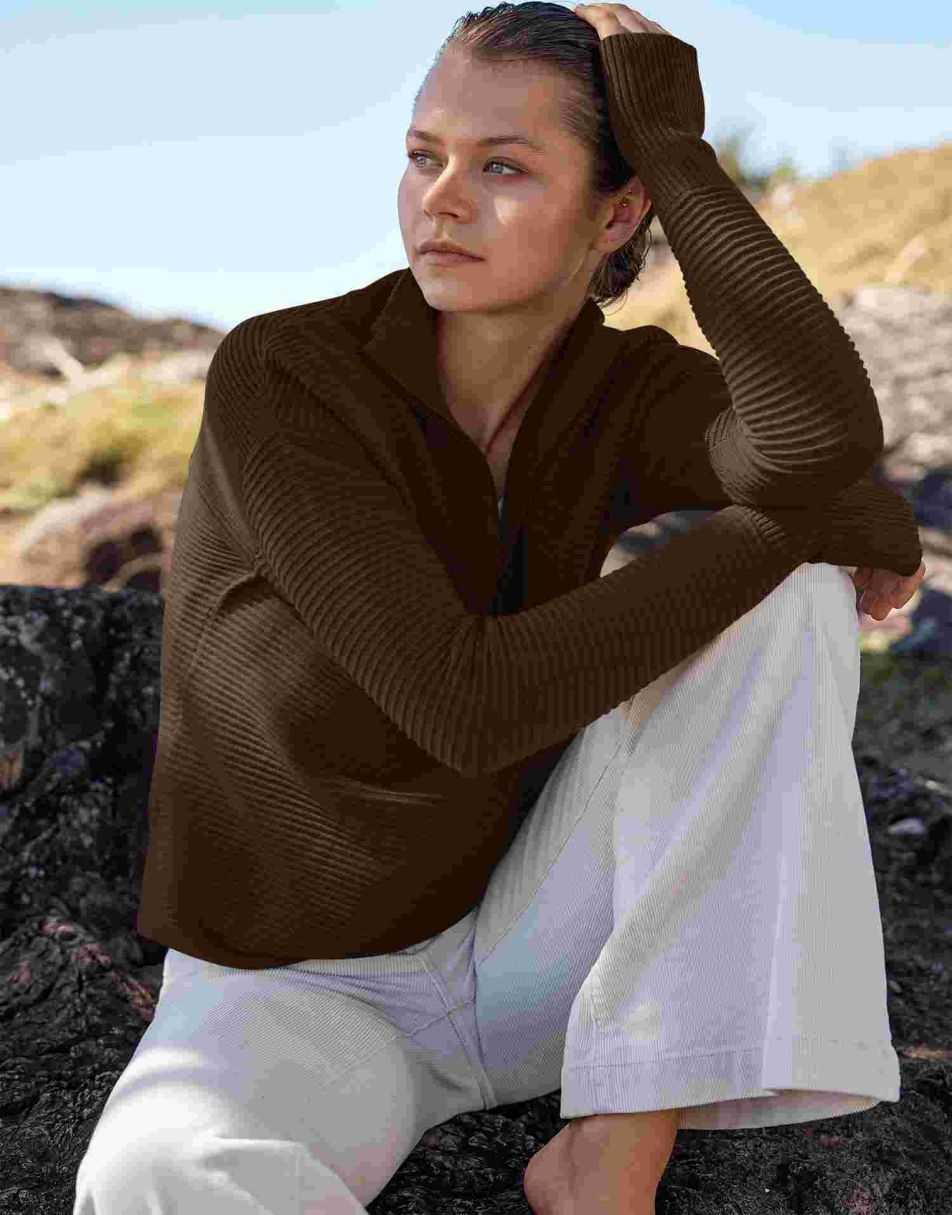 • Features - long sleeve with thumb hole detail锛�half zipper front锛�lapel collared v neck锛�ribbed knit fabrication锛�loose fit.