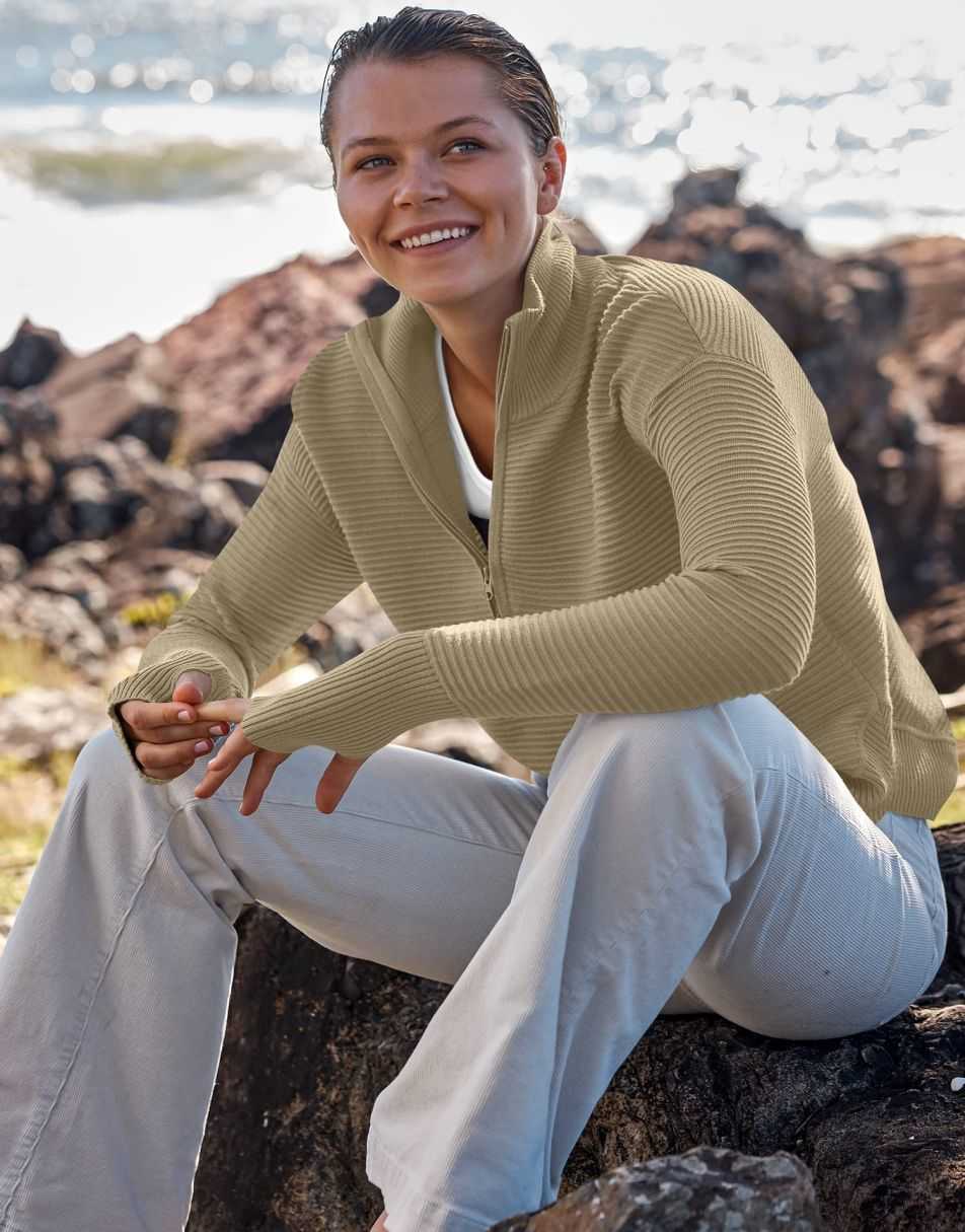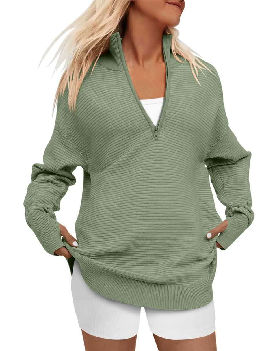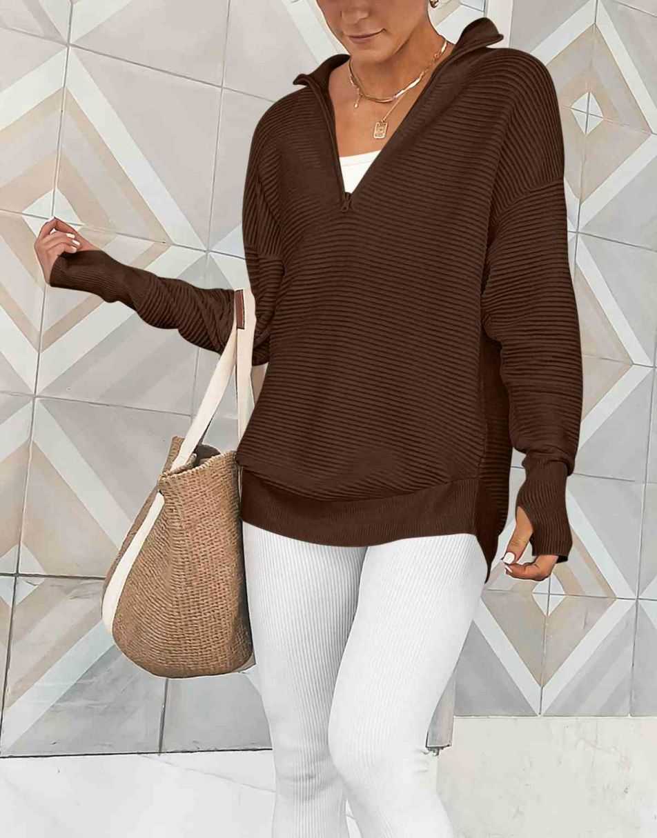 • ANRABESS Women's 2023 Fall Long Sleeve Half Zip V Neck Collared Casual Oversized Ribbed Knit Pullover Sweater Thumb Hole