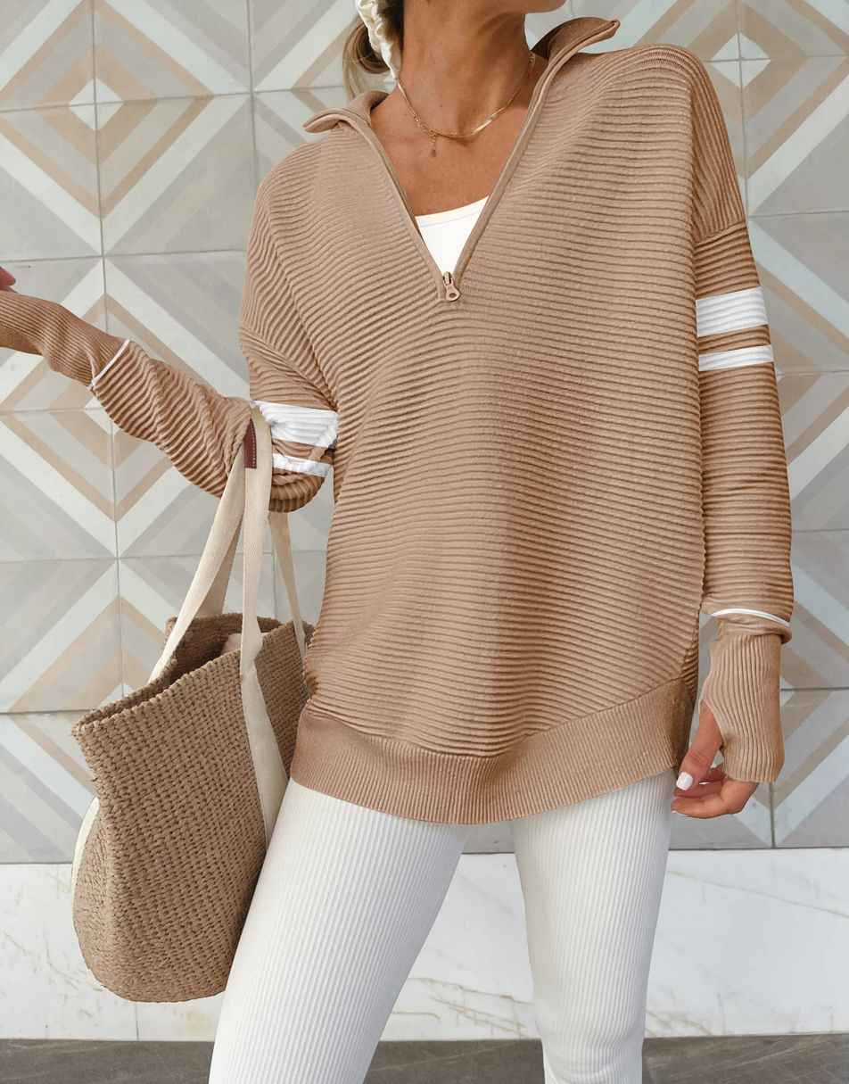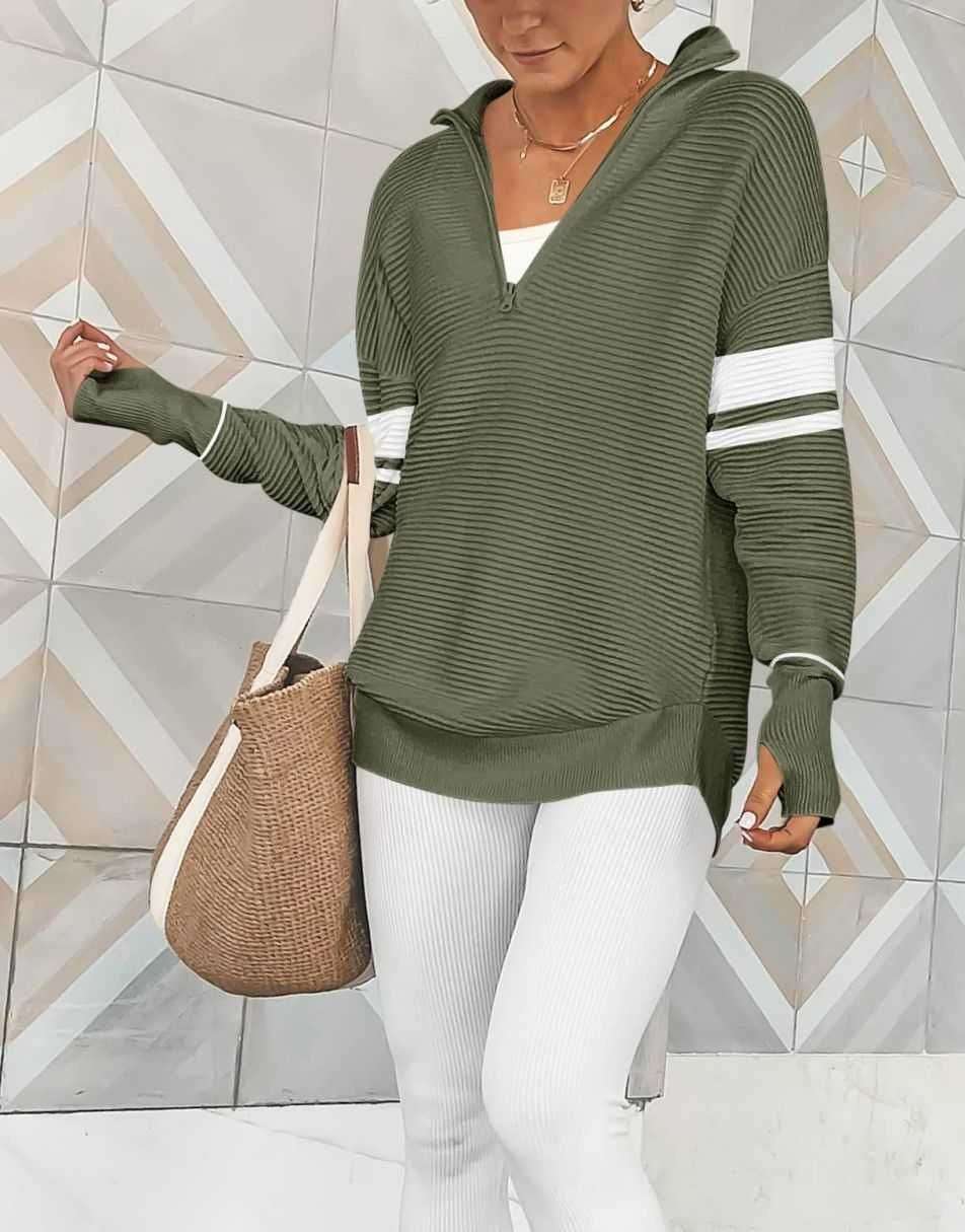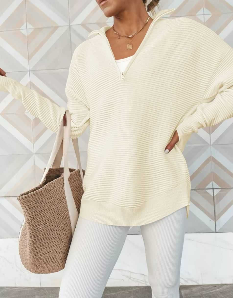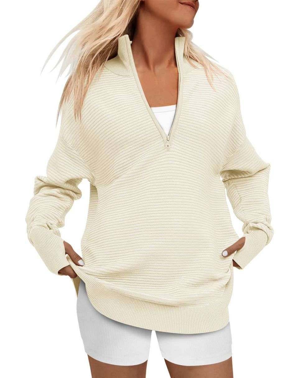 • Match - This Knit Sweater is so preppy and pretty! Designed with a zipper neckline and an loose fit. Styled with the Striped Beanie,Hoop Earrings, Simple Bracelet and Faux Bootie for a fahsion early fall look!