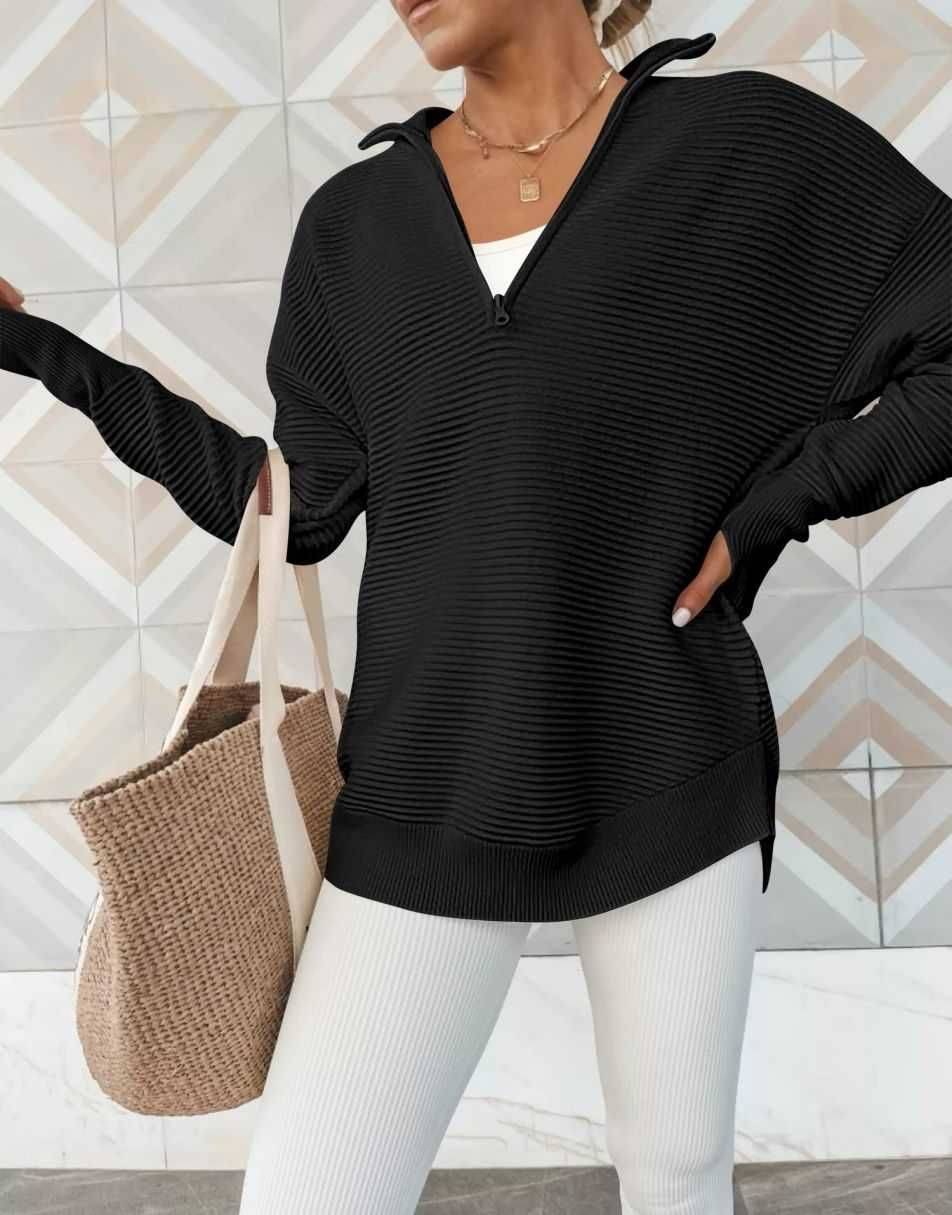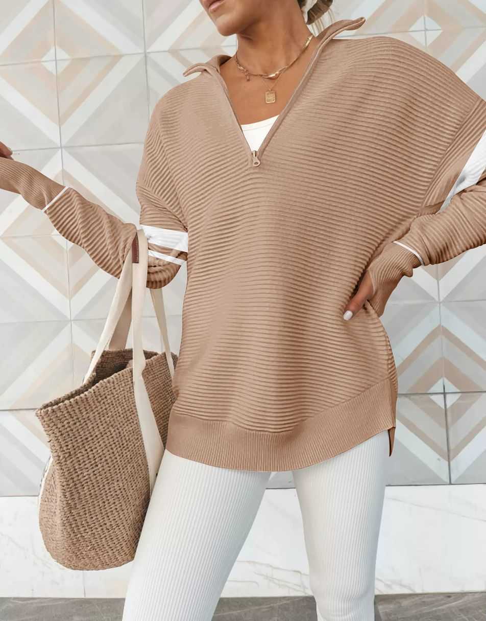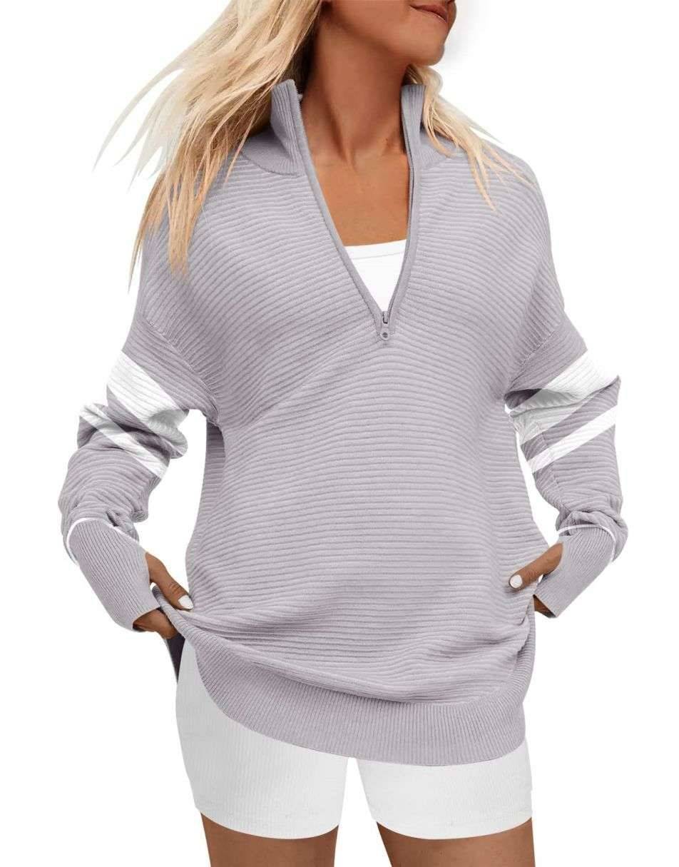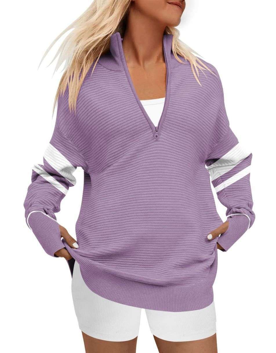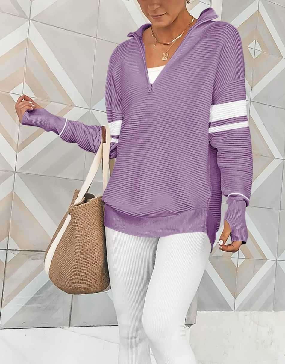 • Match - This Knit Sweater is so preppy and pretty! Designed with a zipper neckline and an loose fit. Styled with the Striped Beanie,Hoop Earrings, Simple Bracelet and Faux Bootie for a fahsion early fall look!
