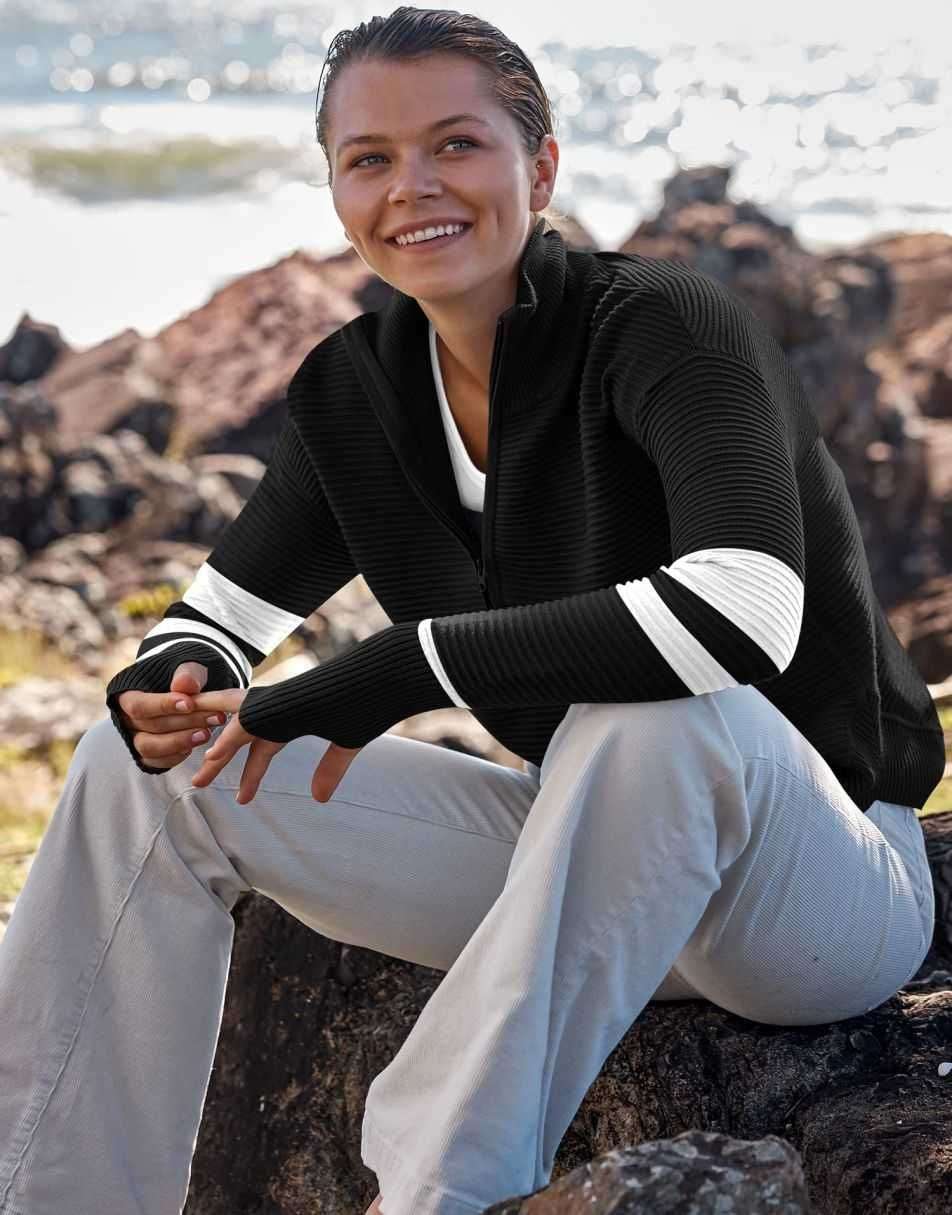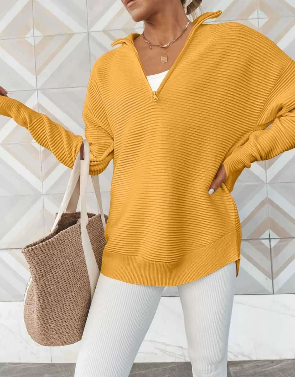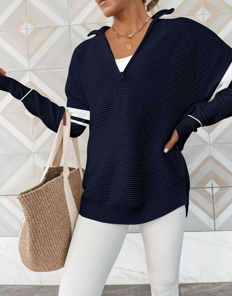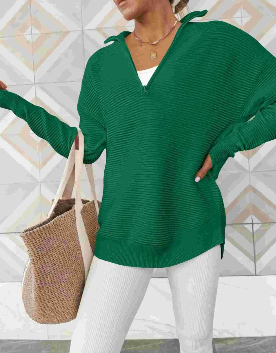 • Match - This Knit Sweater is so preppy and pretty! Designed with a zipper neckline and an loose fit. Styled with the Striped Beanie,Hoop Earrings, Simple Bracelet and Faux Bootie for a fahsion early fall look!