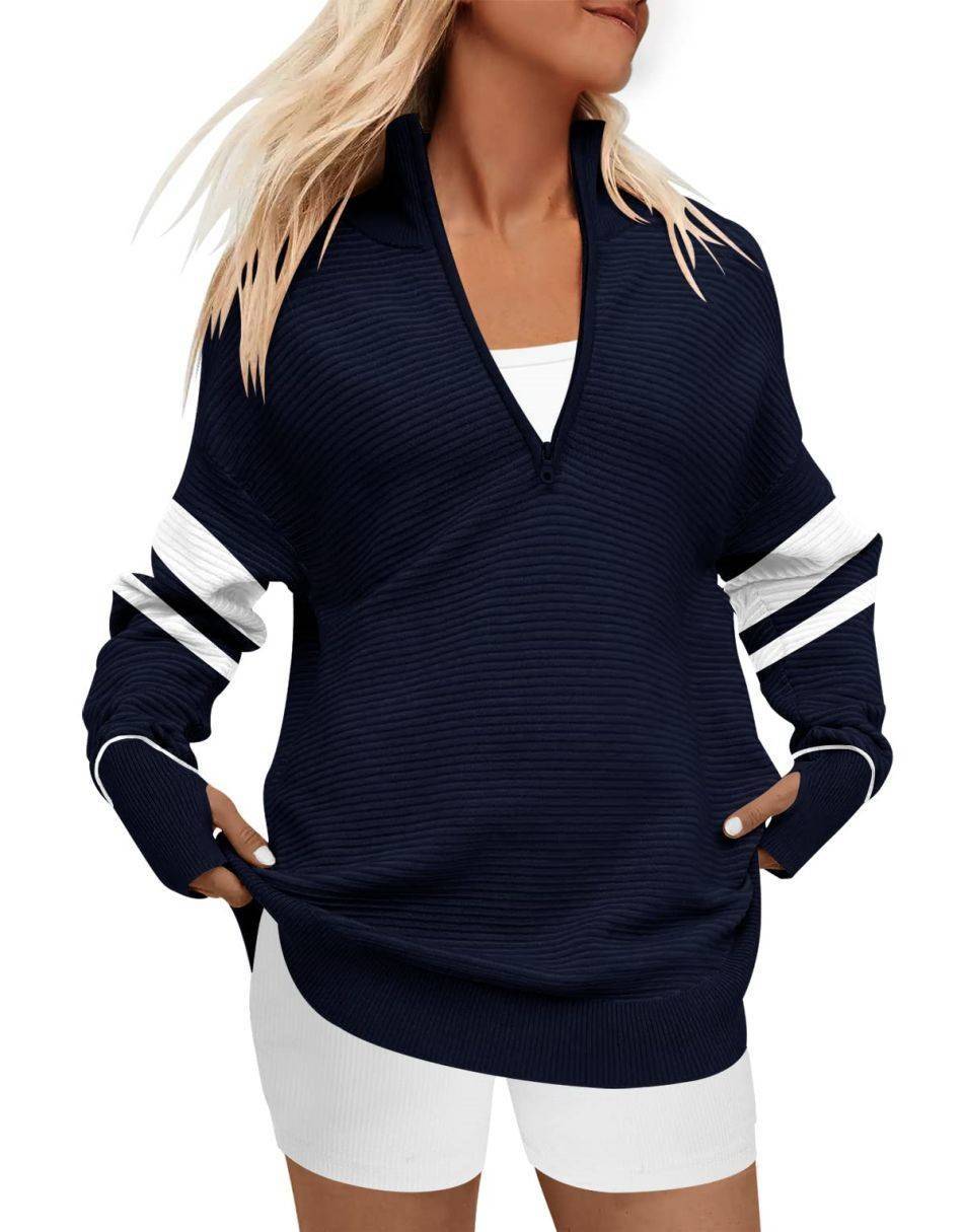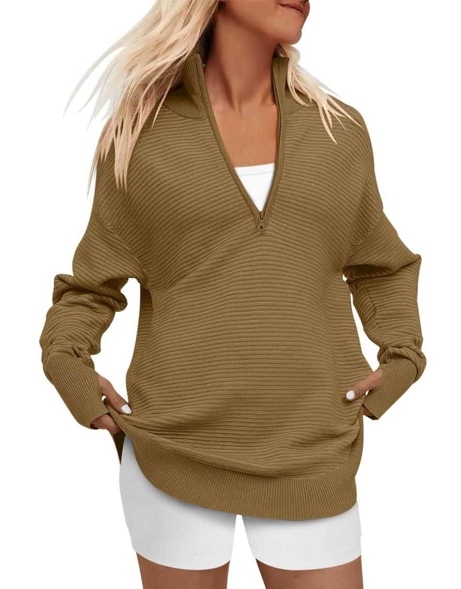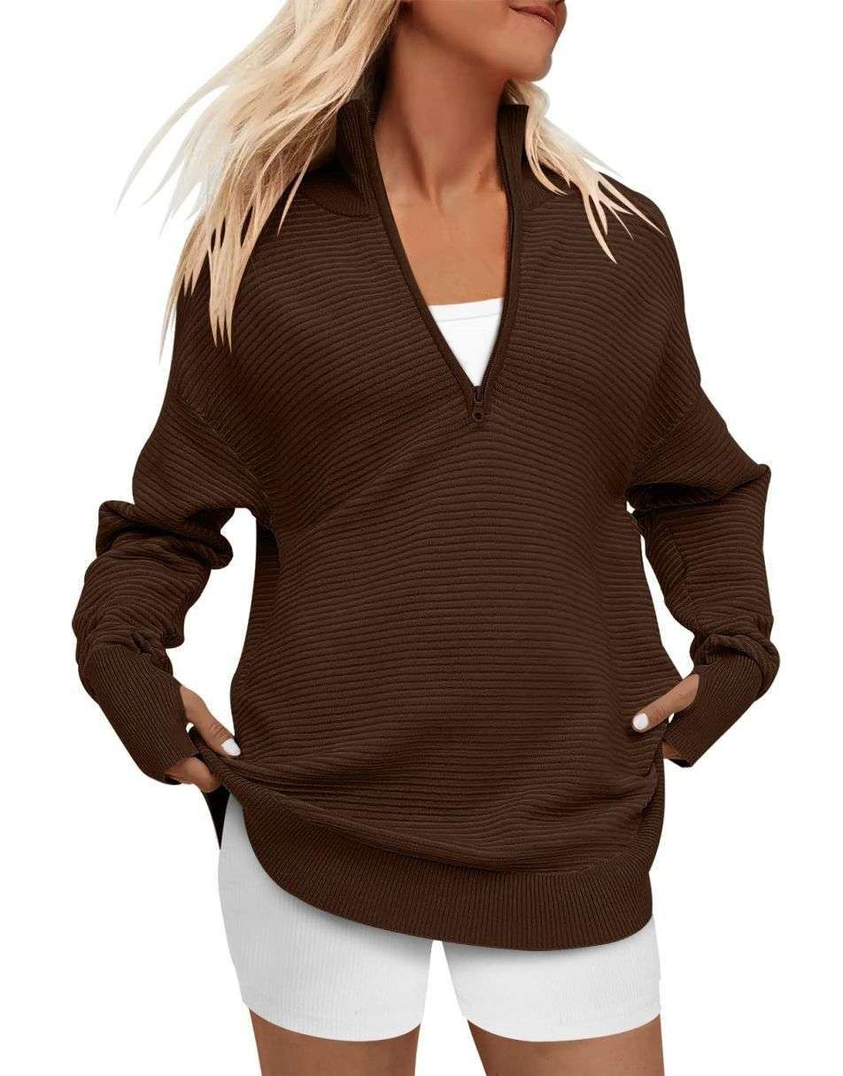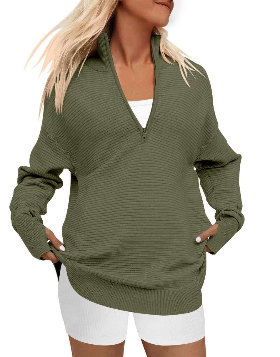 • ANRABESS Women's 2023 Fall Long Sleeve Half Zip V Neck Collared Casual Oversized Ribbed Knit Pullover Sweater Thumb Hole