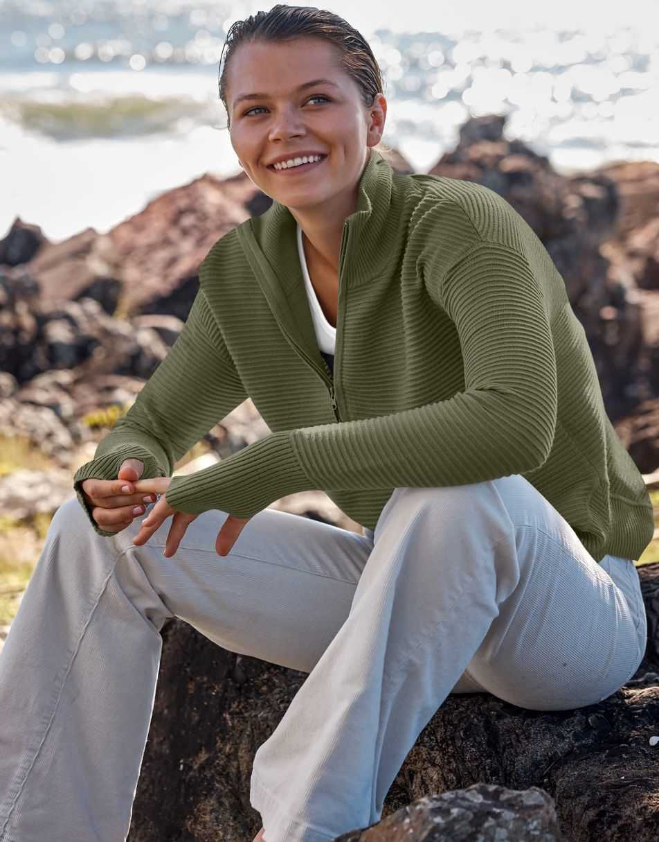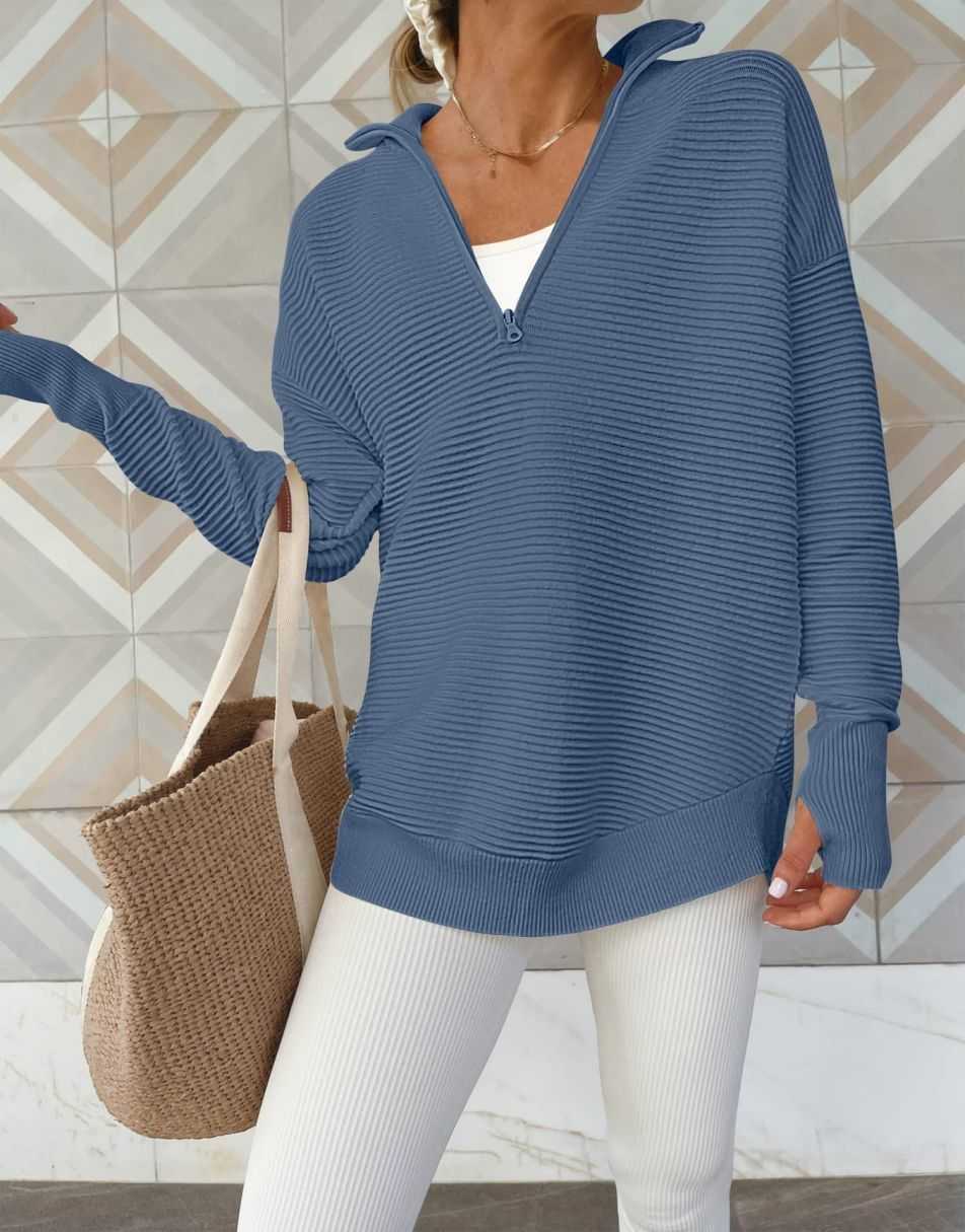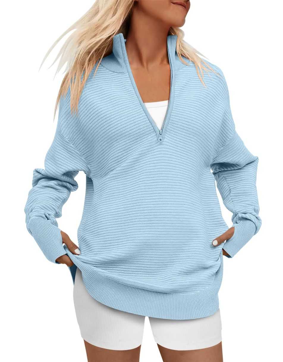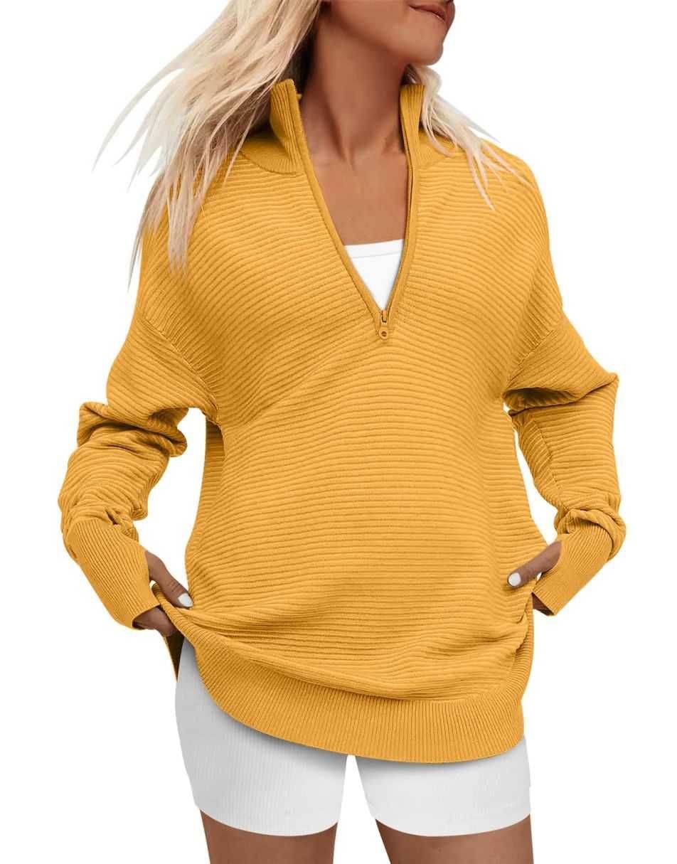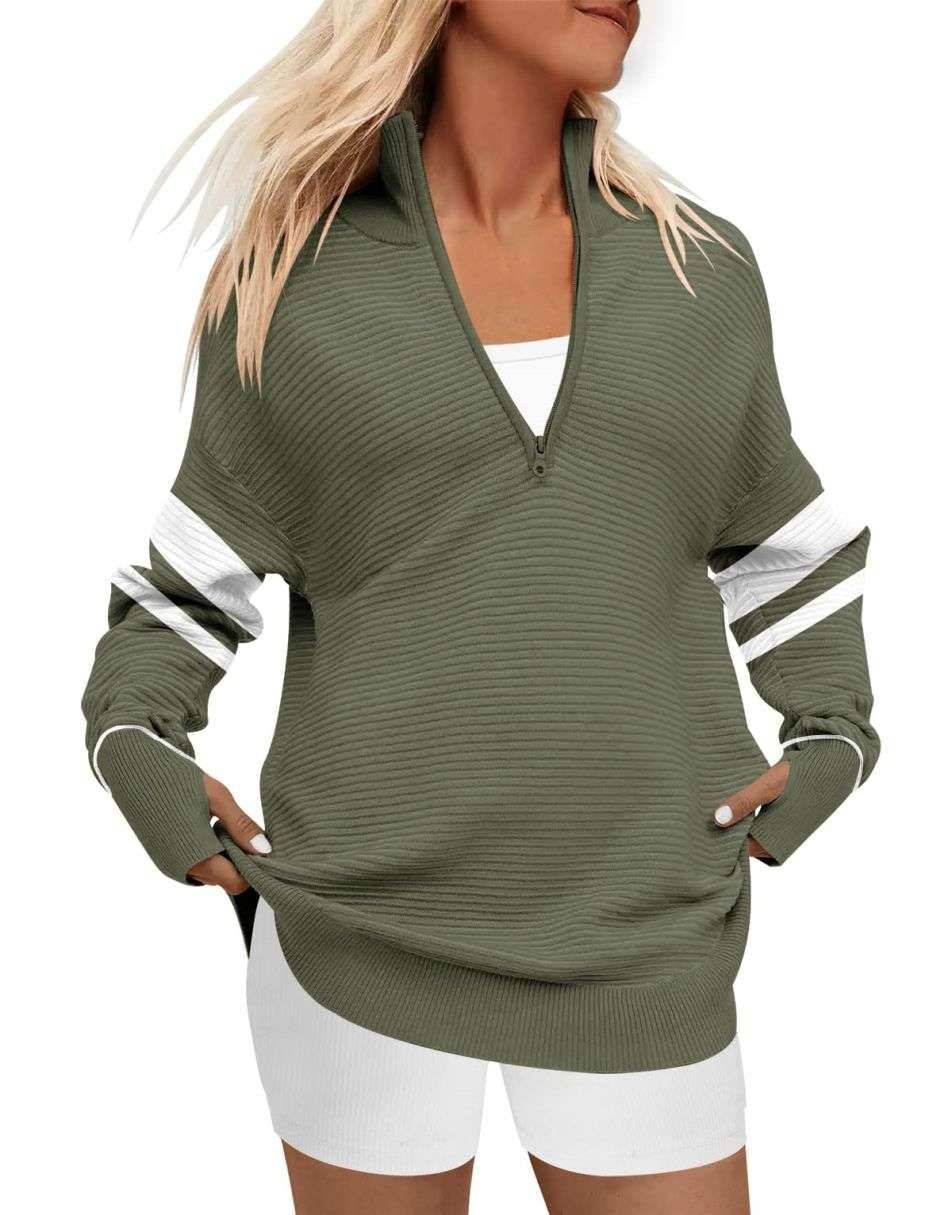 • ANRABESS Women's 2023 Fall Long Sleeve Half Zip V Neck Collared Casual Oversized Ribbed Knit Pullover Sweater Thumb Hole