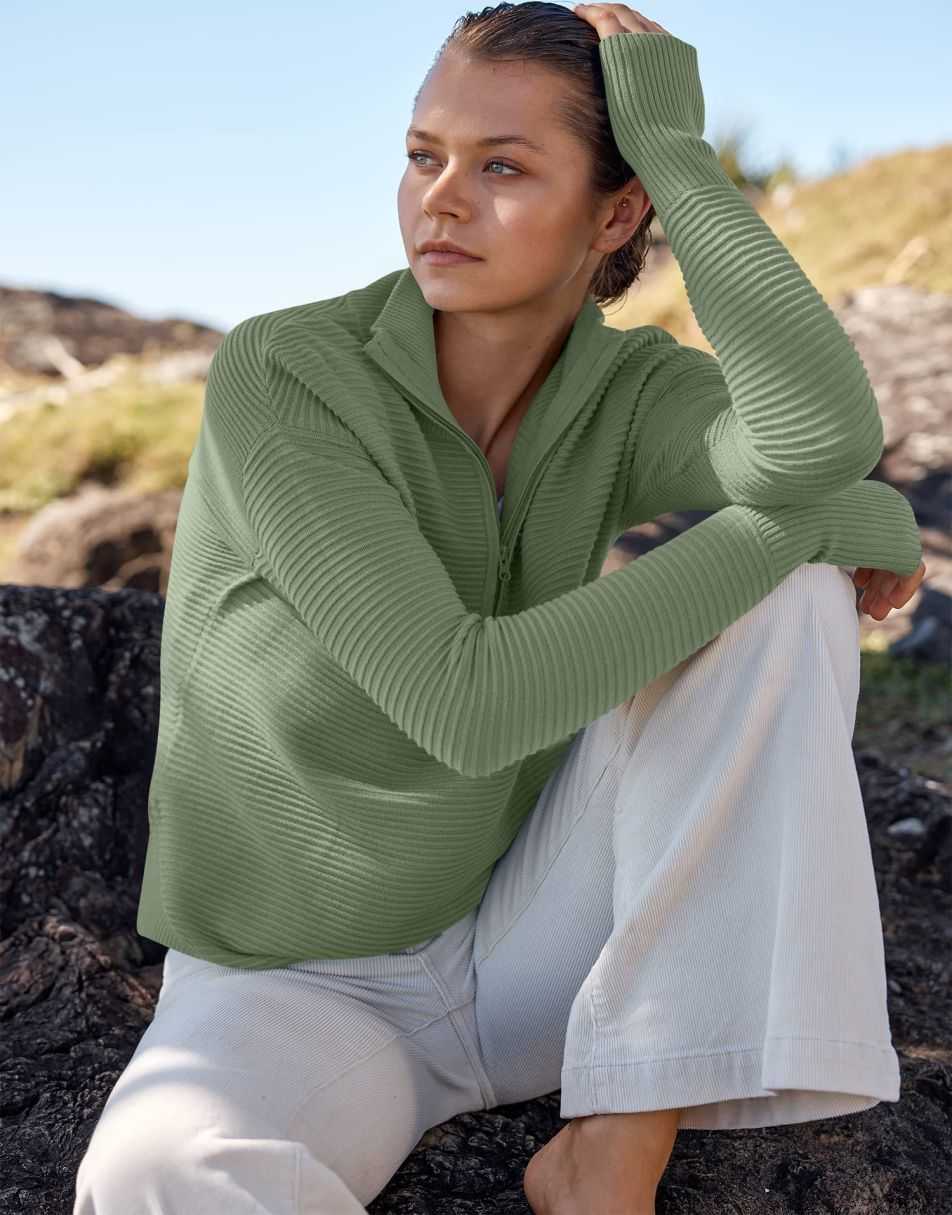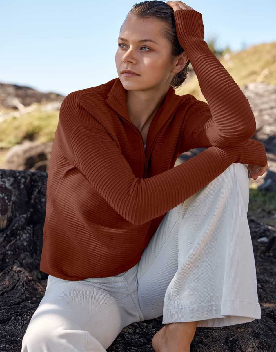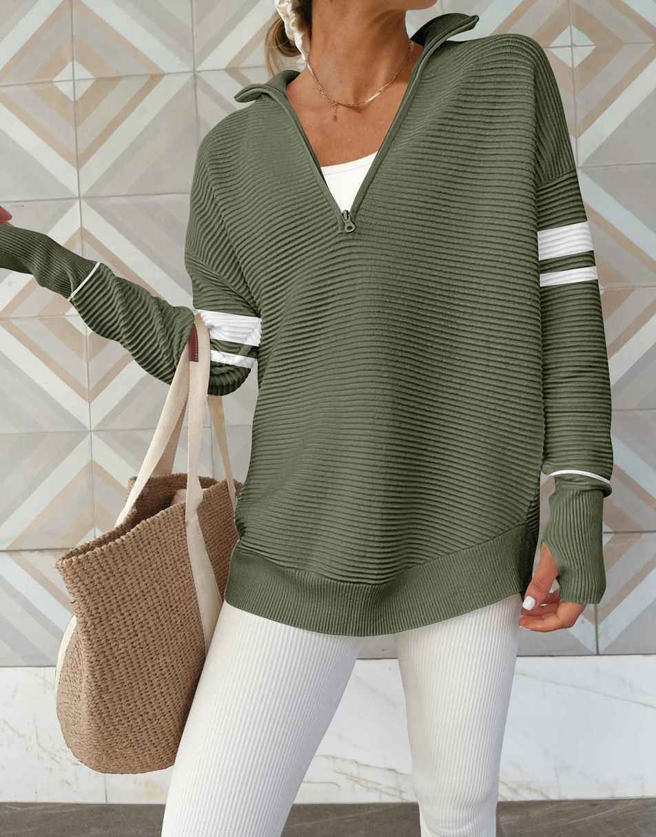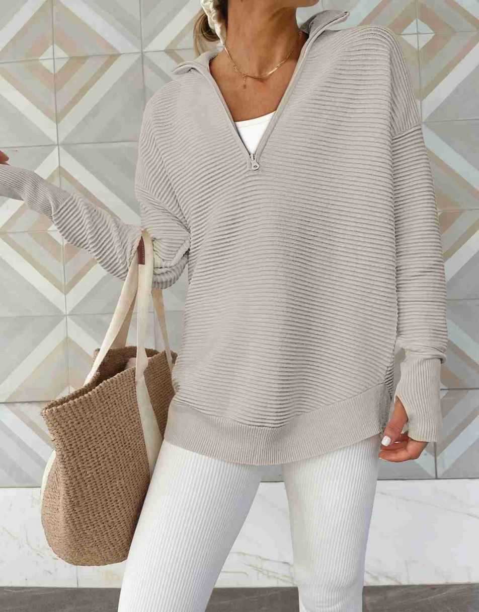 • Features - long sleeve with thumb hole detail,half zipper front,lapel collared v neck,ribbed knit fabrication,loose fit.