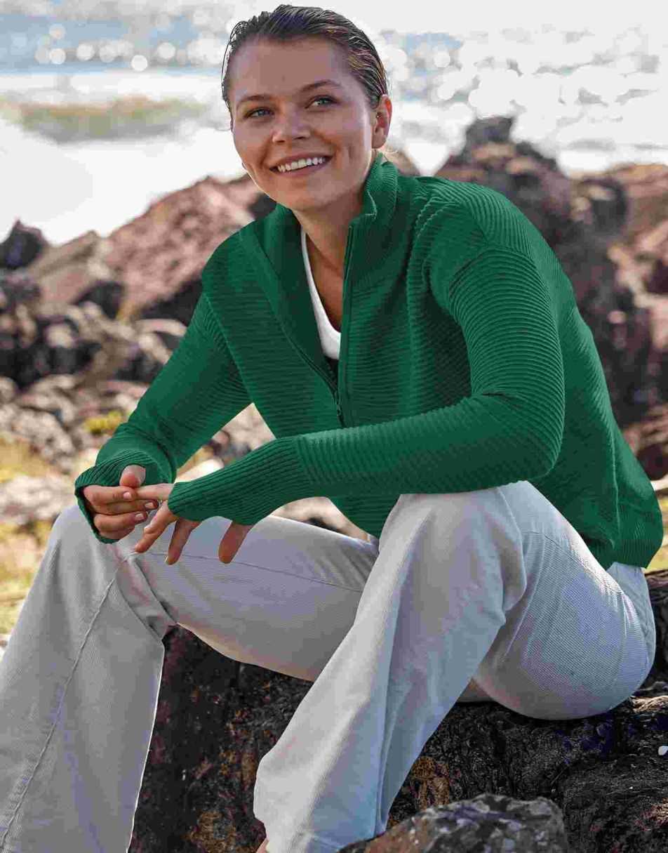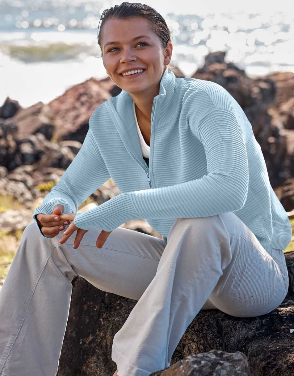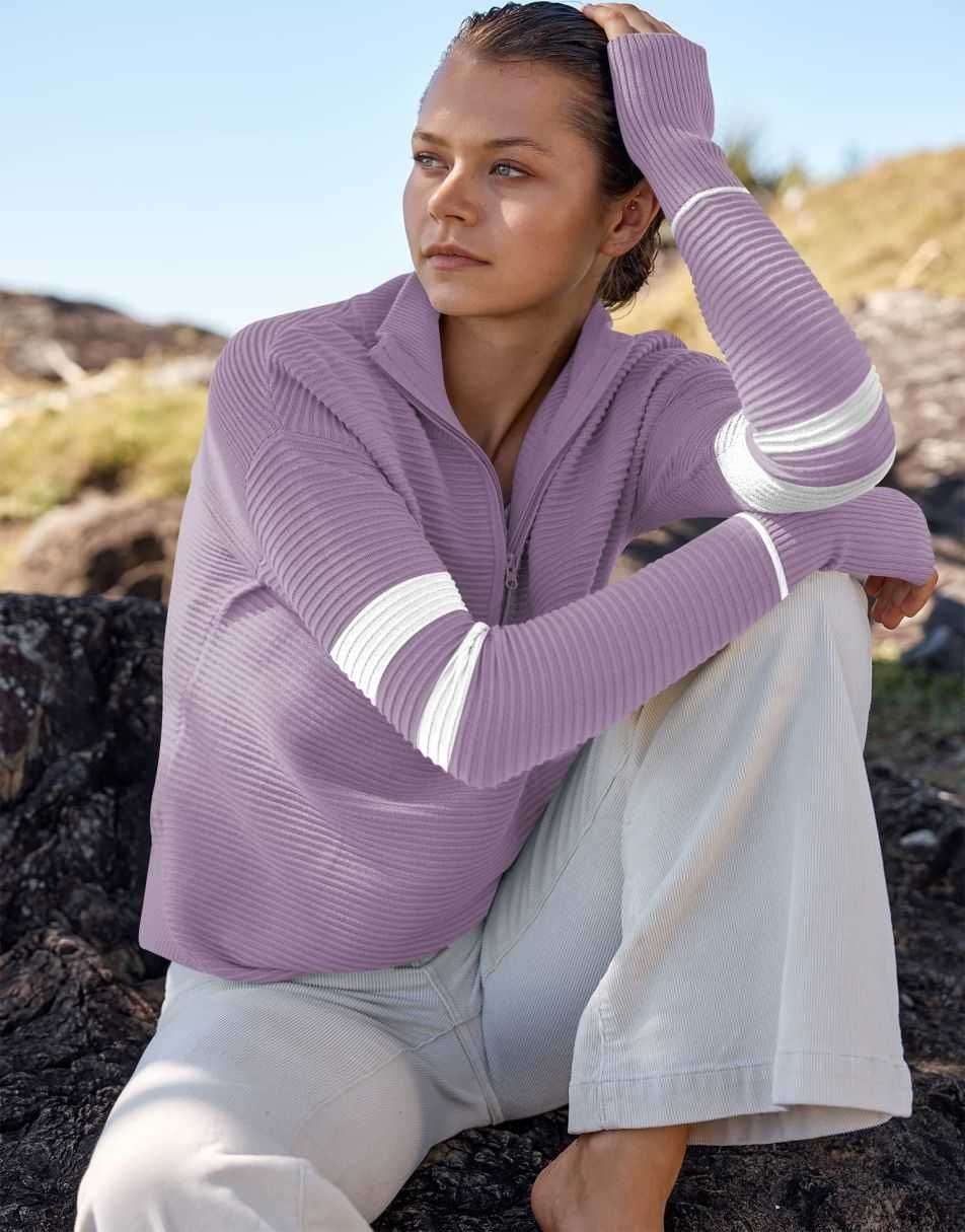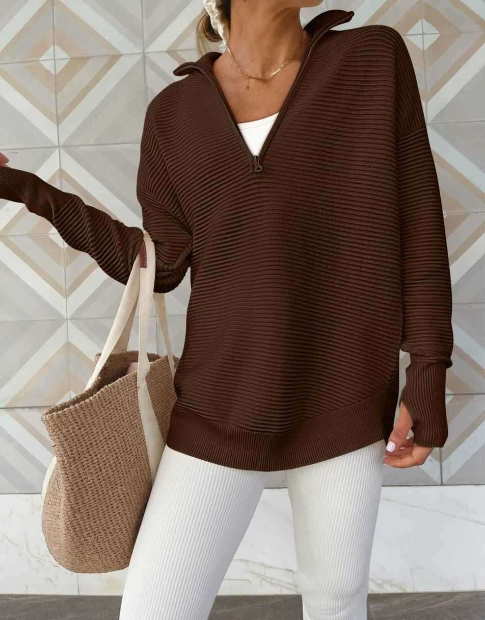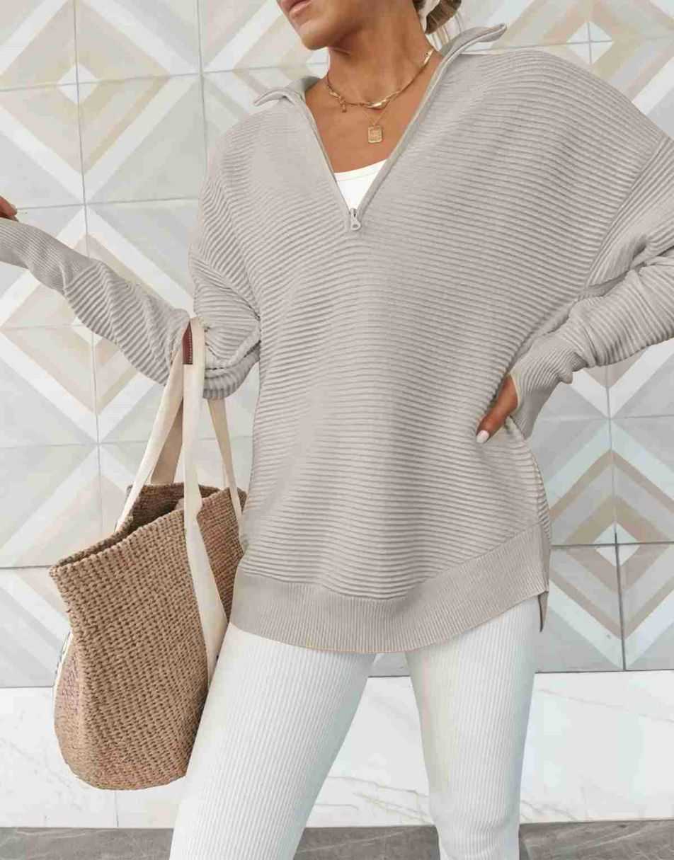 • Features - long sleeve with thumb hole detail,half zipper front,lapel collared v neck,ribbed knit fabrication,loose fit.