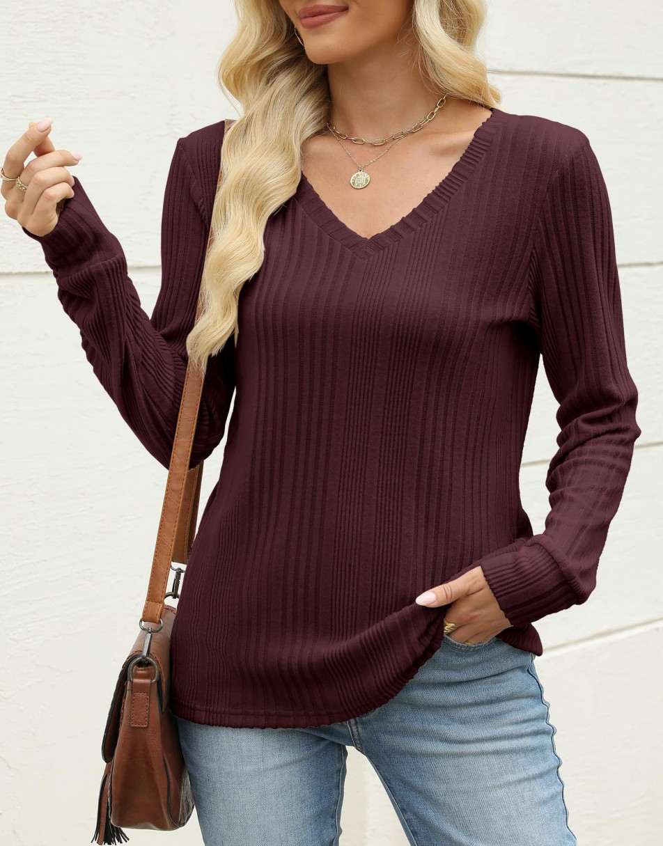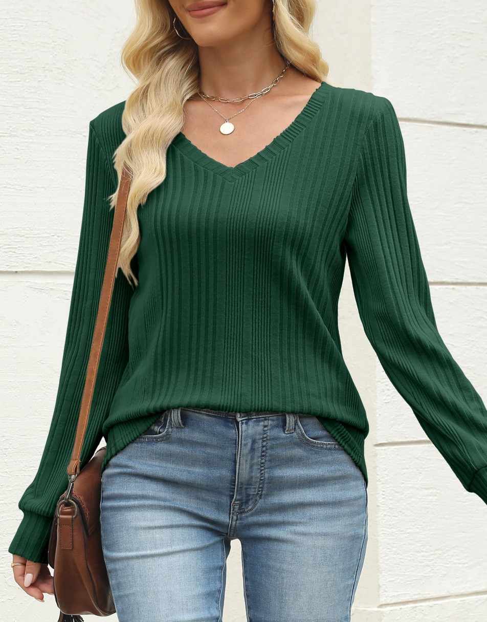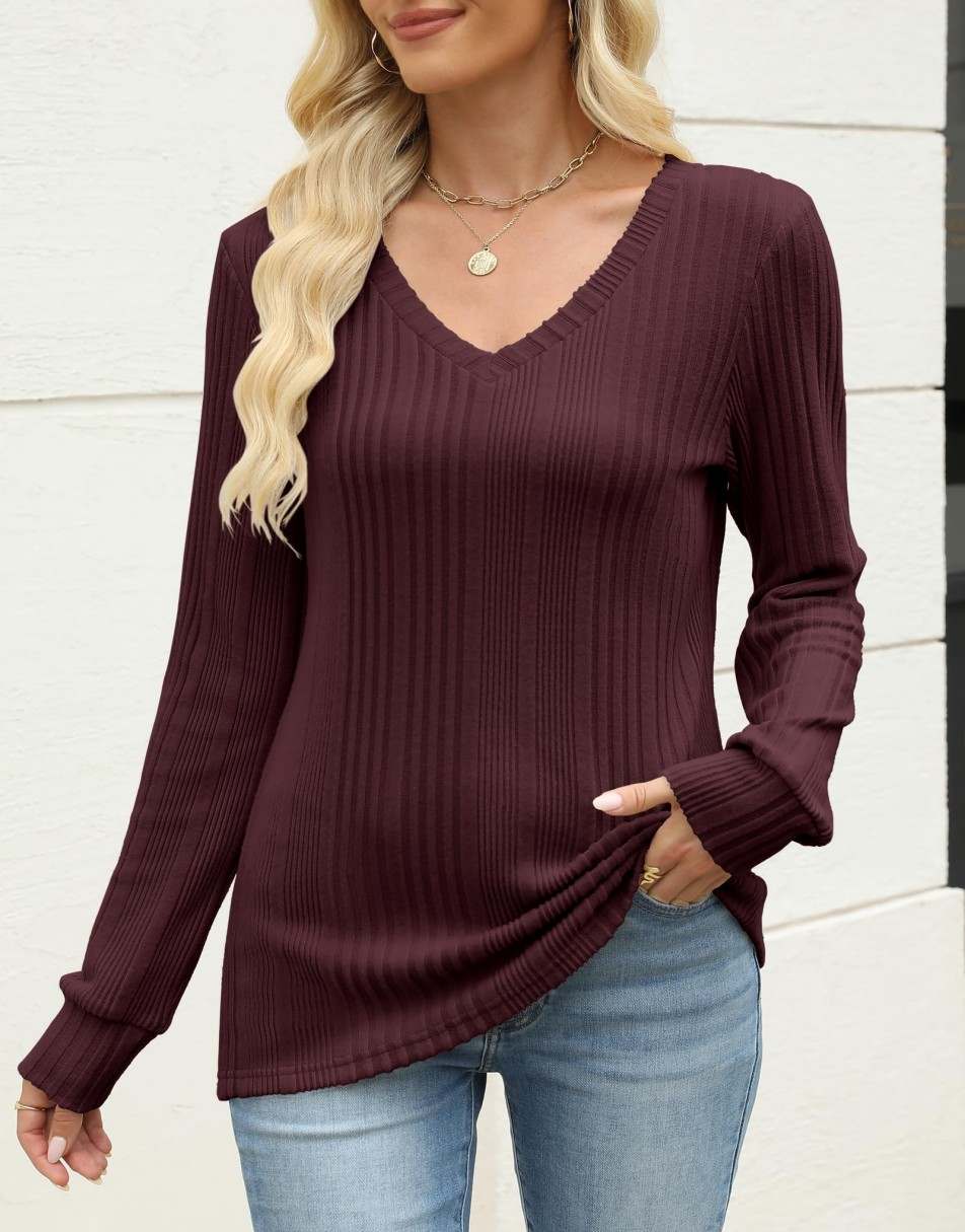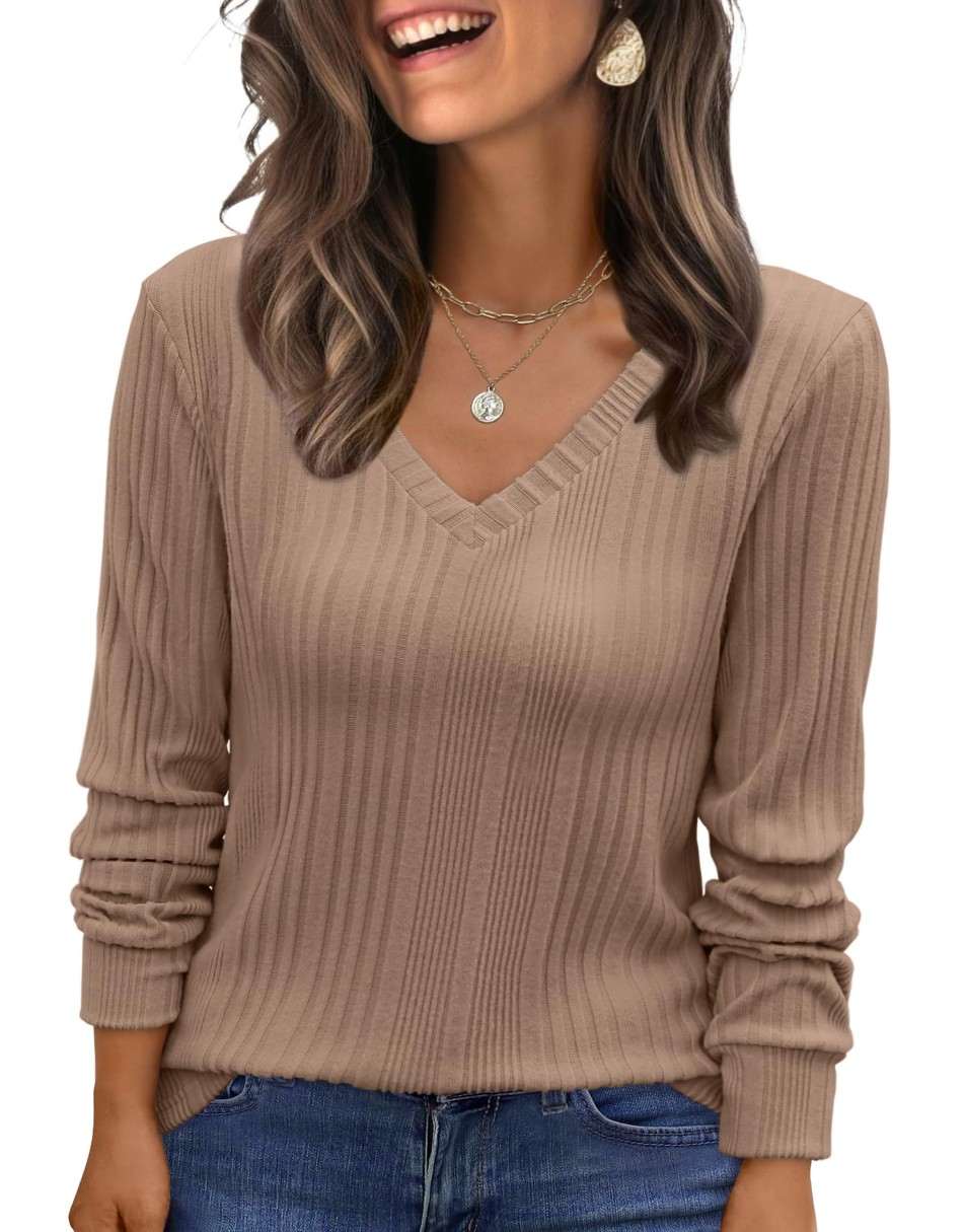 • ANRABESS Womens Long Sleeve Shirts V Neck Tunic Tops Ribbed Knit Lightweight Sweaters 2025 Fall Dressy Casual Blouses
