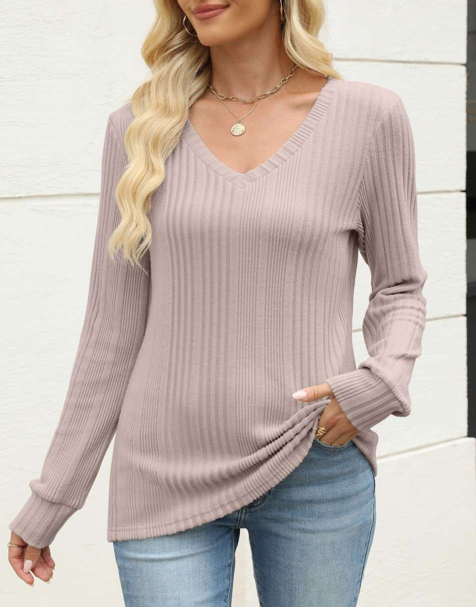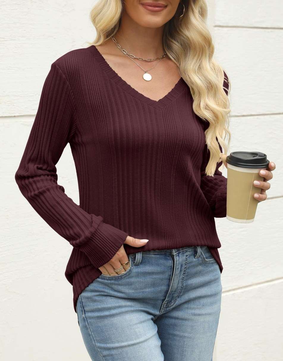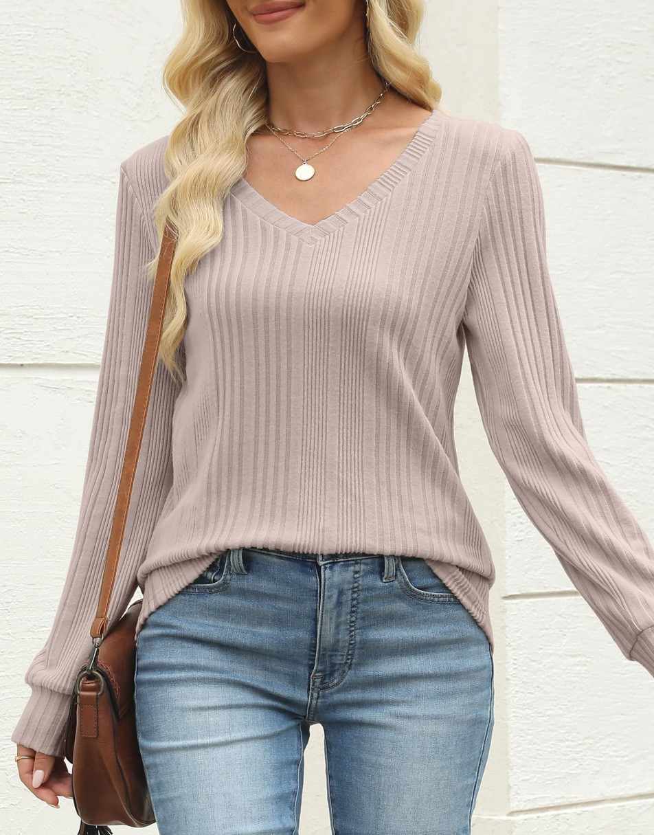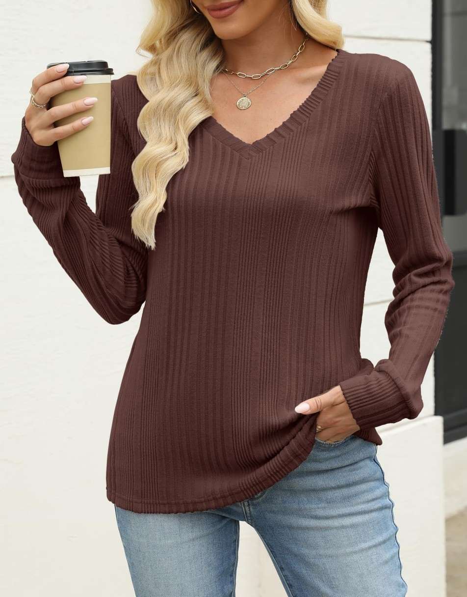 • ANRABESS Womens Long Sleeve Shirts V Neck Tunic Tops Ribbed Knit Lightweight Sweaters 2025 Fall Dressy Casual Blouses