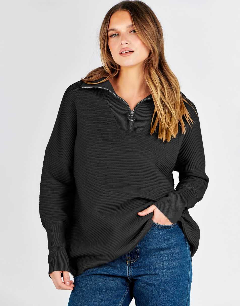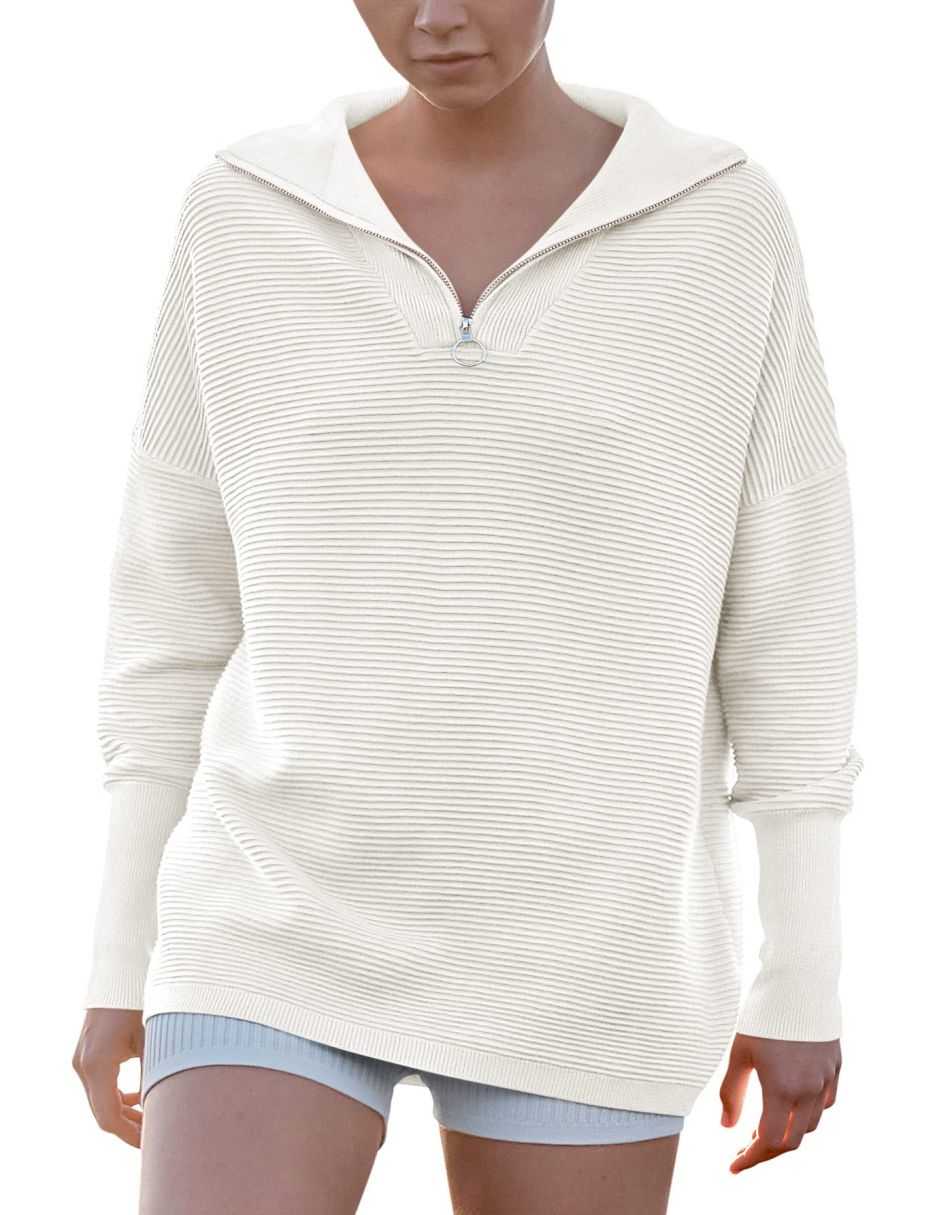 • ANRABESS Women's Oversized Sweater Quarter Zip V Neck Collared Ribbed Knit Pullover Tunic 2023 Y2K Fall Tops