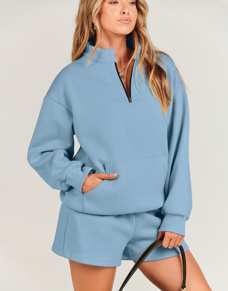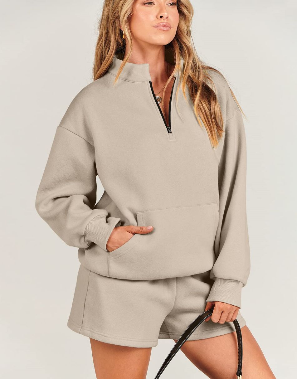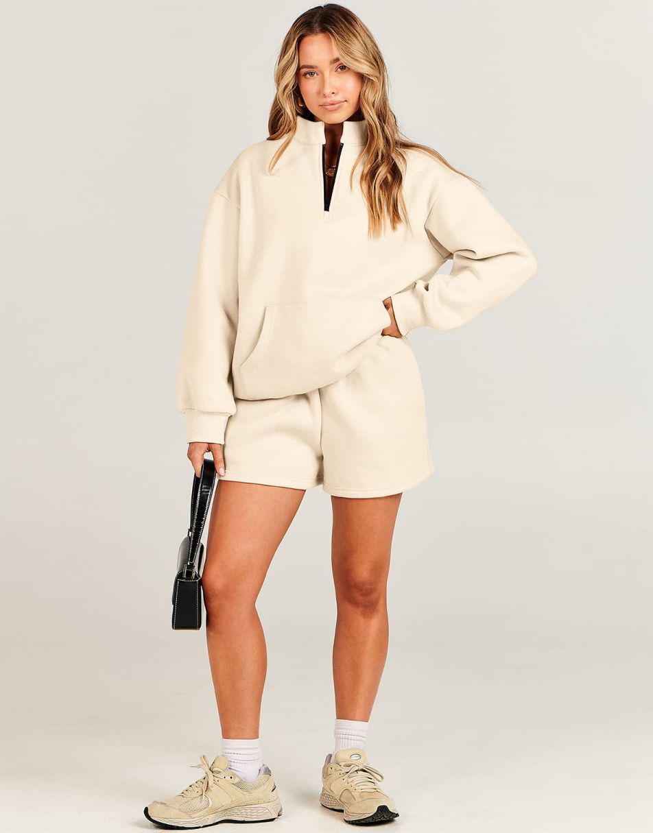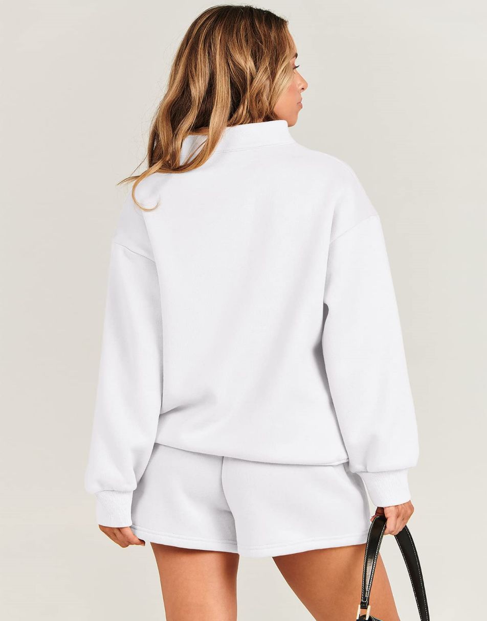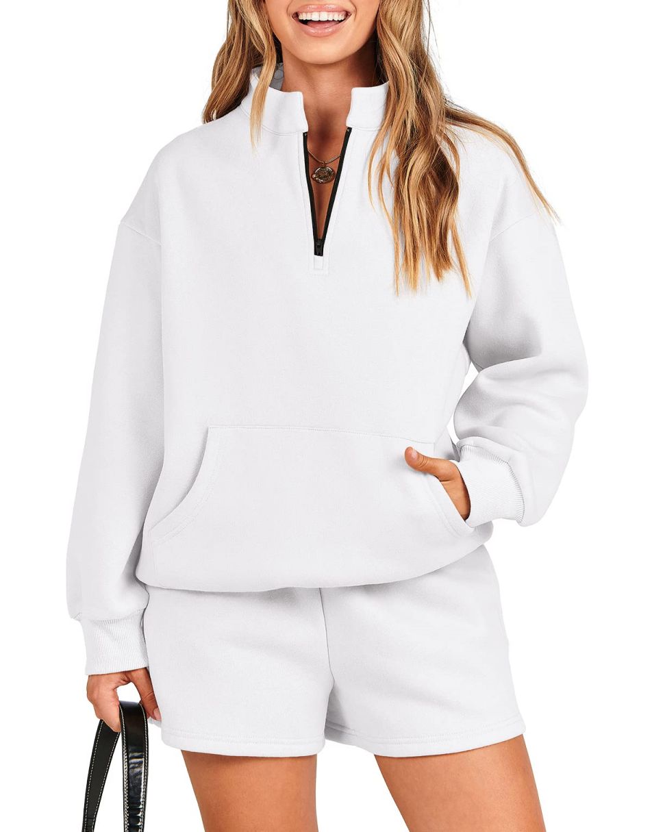 • Features - Long sleeve sweatshirt top and a high waist matching shorts, 1/4 zipped neckline, causal v-neck polo collared, ribbed cuffs, drop shoulder, and two side pockets on shorts. Super flattering and cozy while still looking cute and put together!