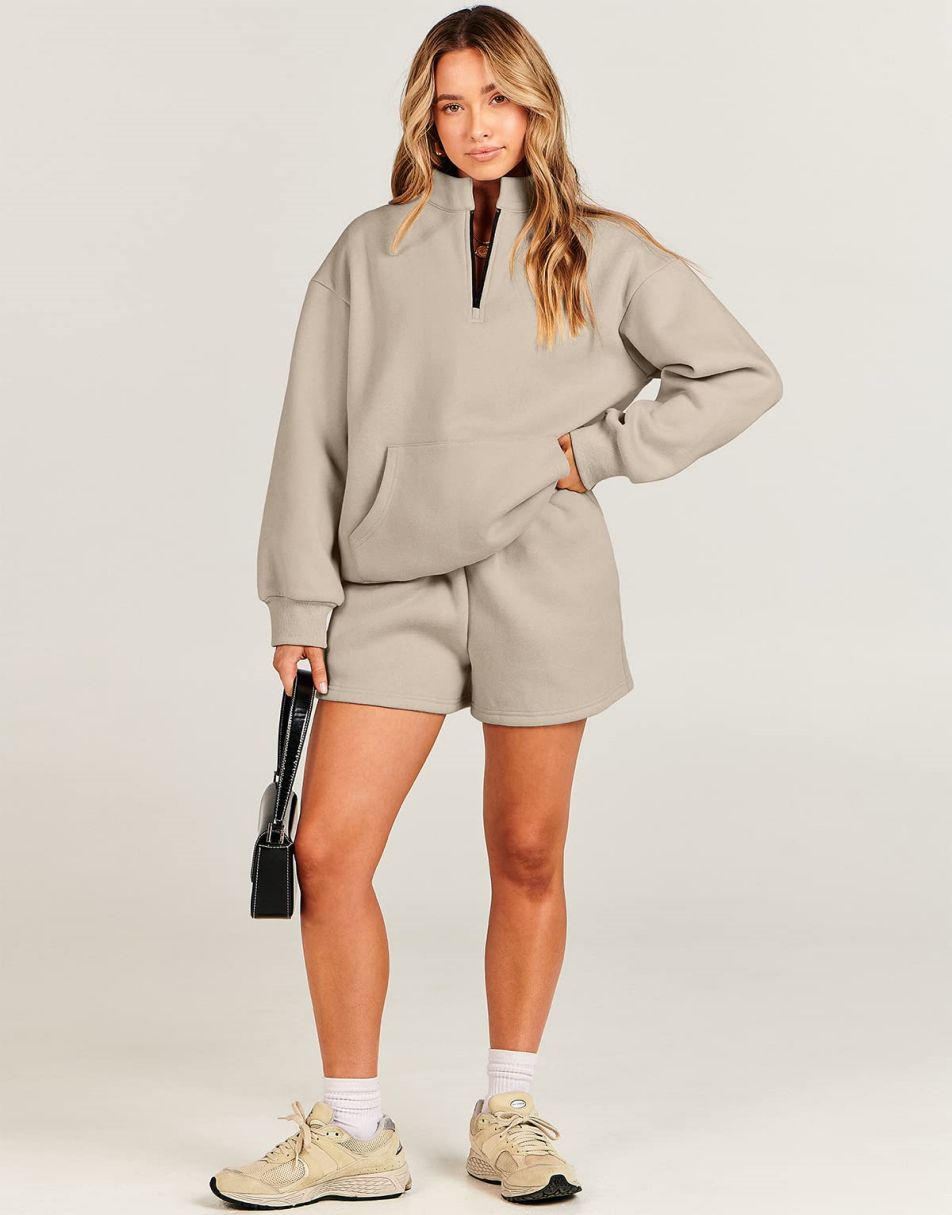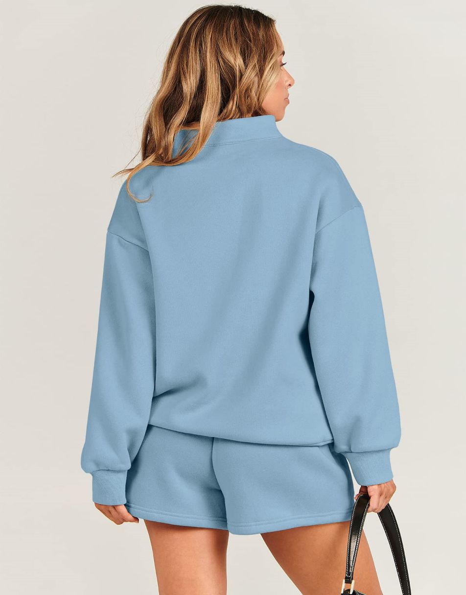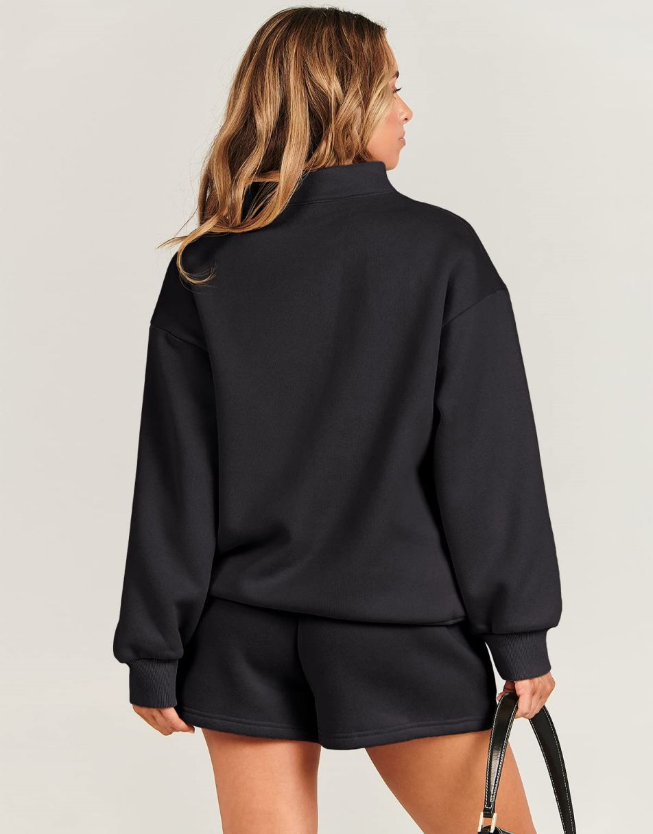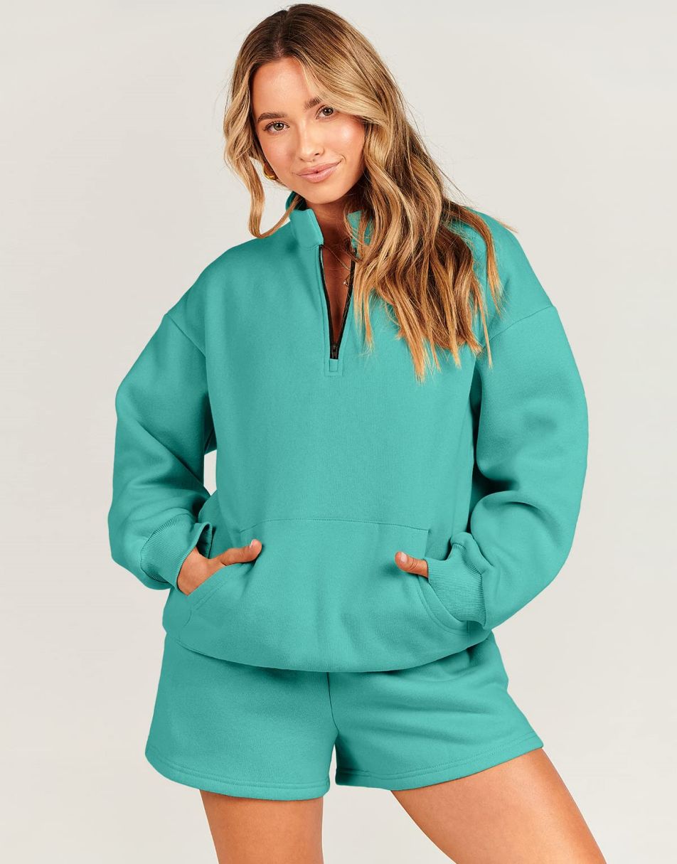 • Features - Long sleeve sweatshirt top and a high waist matching shorts, 1/4 zipped neckline, causal v-neck polo collared, ribbed cuffs, drop shoulder, and two side pockets on shorts. Super flattering and cozy while still looking cute and put together!