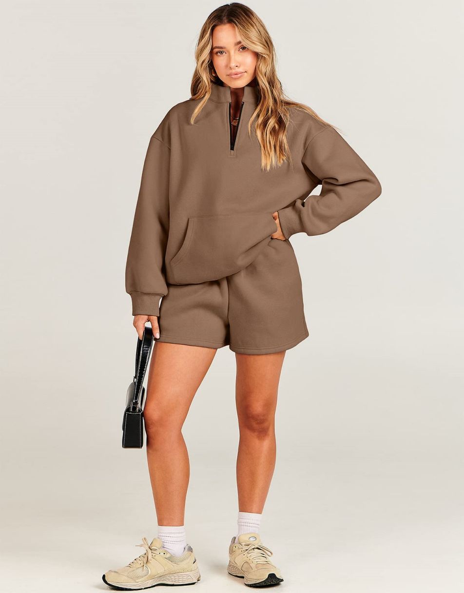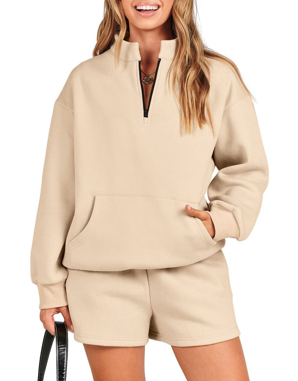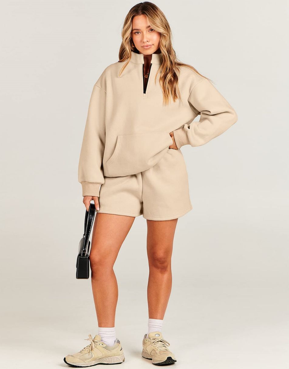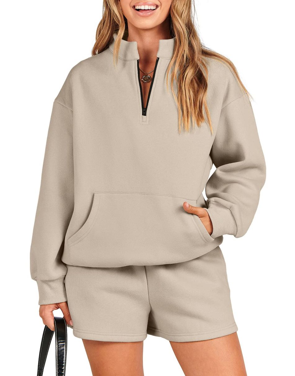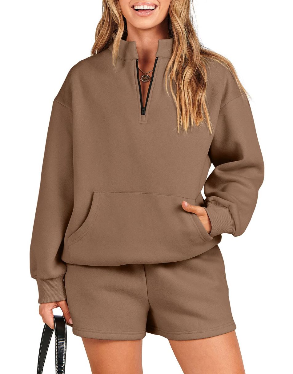• Features - Long sleeve sweatshirt top and a high waist matching shorts, 1/4 zipped neckline, causal v-neck polo collared, ribbed cuffs, drop shoulder, and two side pockets on shorts. Super flattering and cozy while still looking cute and put together!