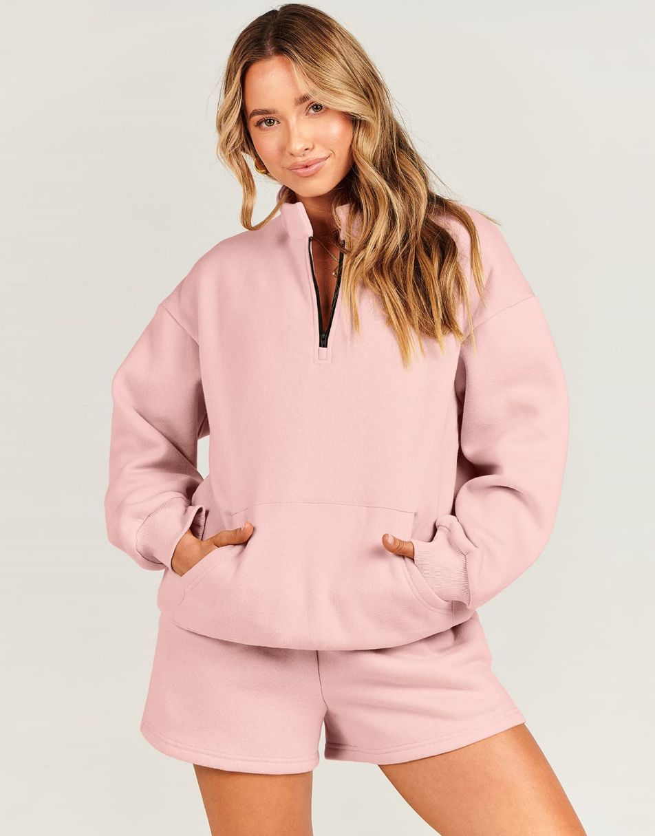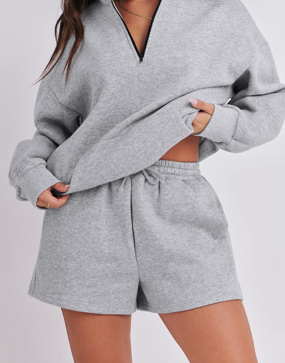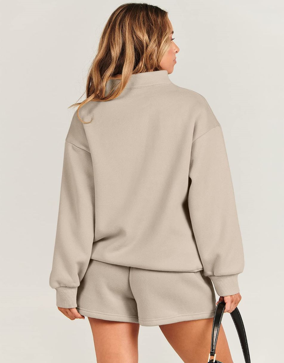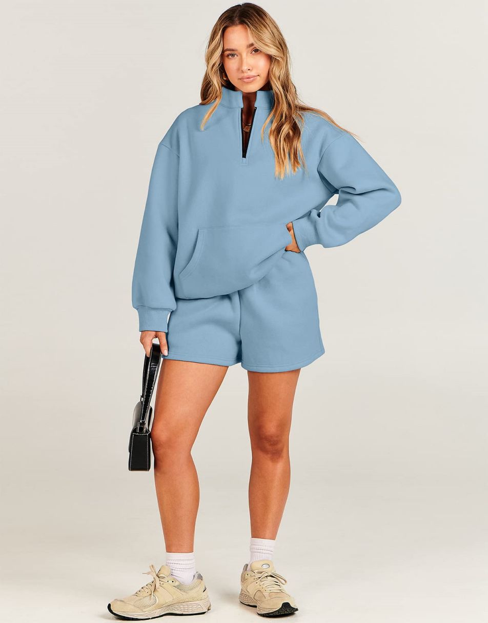 • Features - Long sleeve sweatshirt top and a high waist matching shorts, 1/4 zipped neckline, causal v-neck polo collared, ribbed cuffs, drop shoulder, and two side pockets on shorts. Super flattering and cozy while still looking cute and put together!