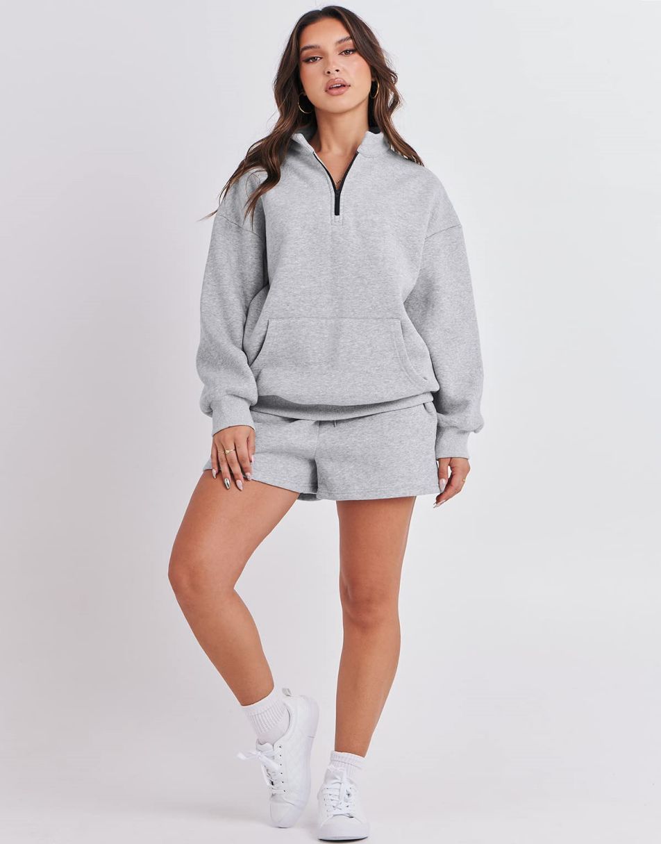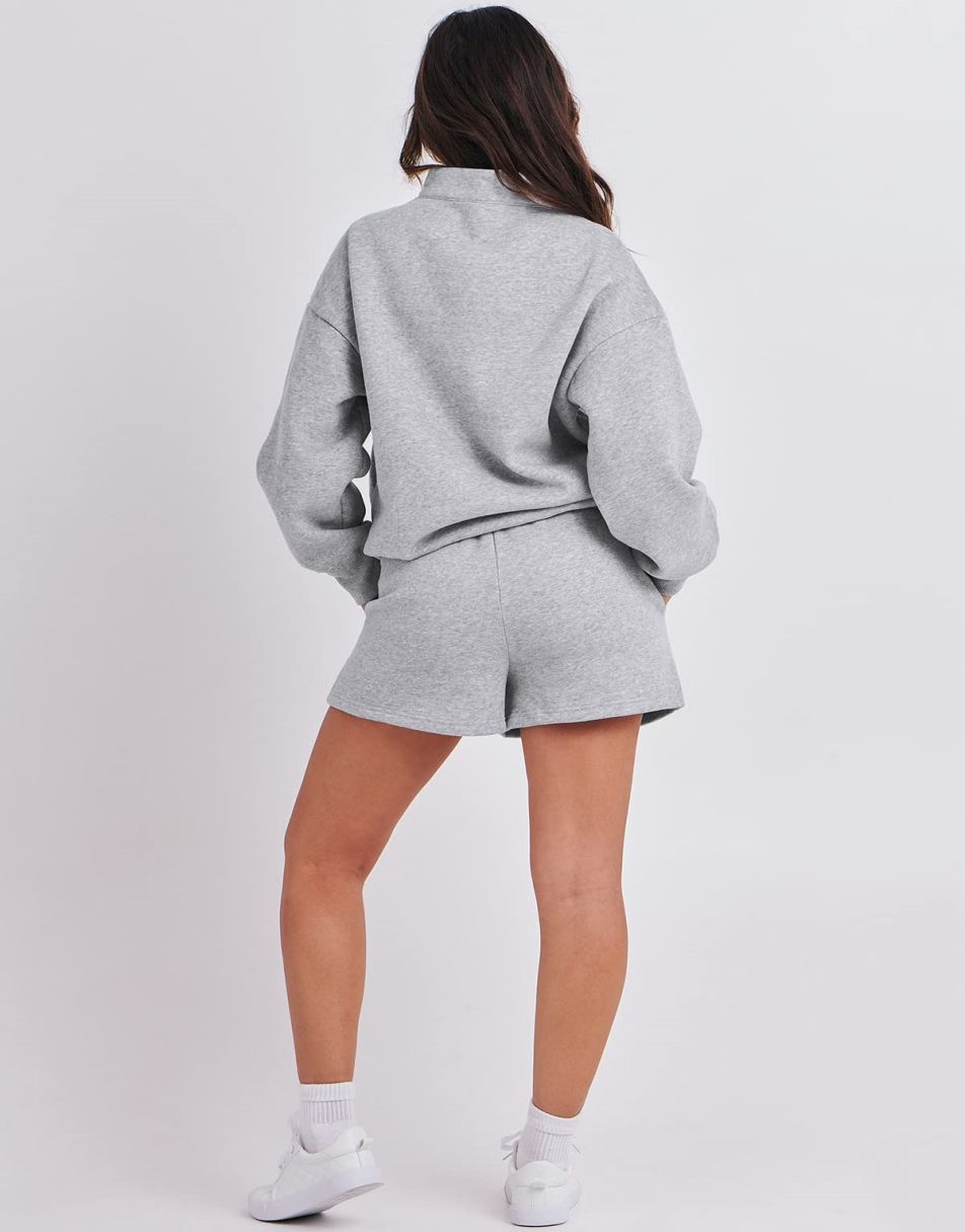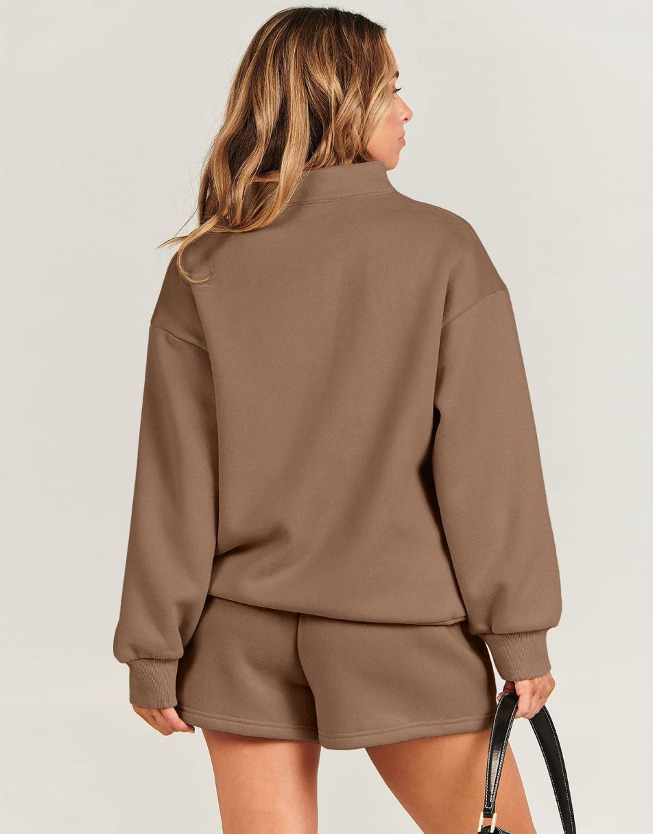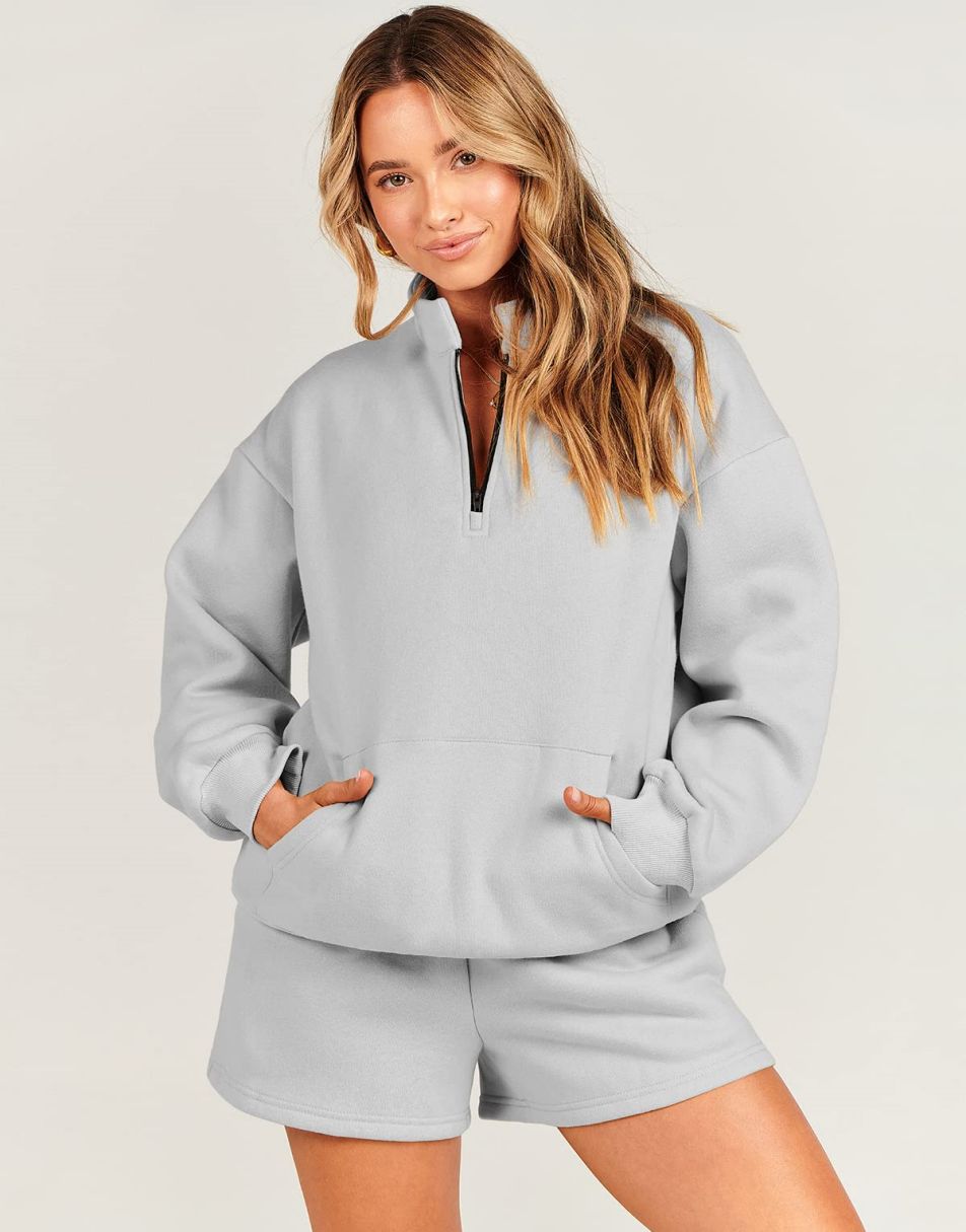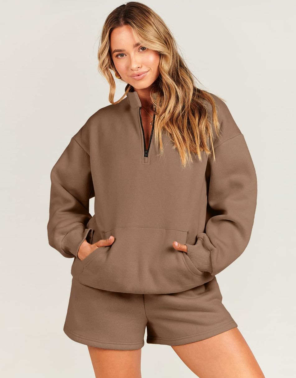 • Features - Long sleeve sweatshirt top and a high waist matching shorts, 1/4 zipped neckline, causal v-neck polo collared, ribbed cuffs, drop shoulder, and two side pockets on shorts. Super flattering and cozy while still looking cute and put together!