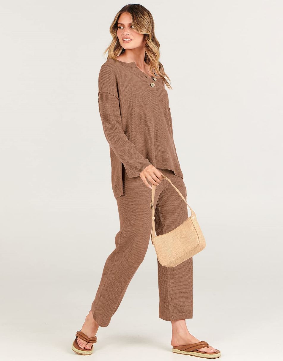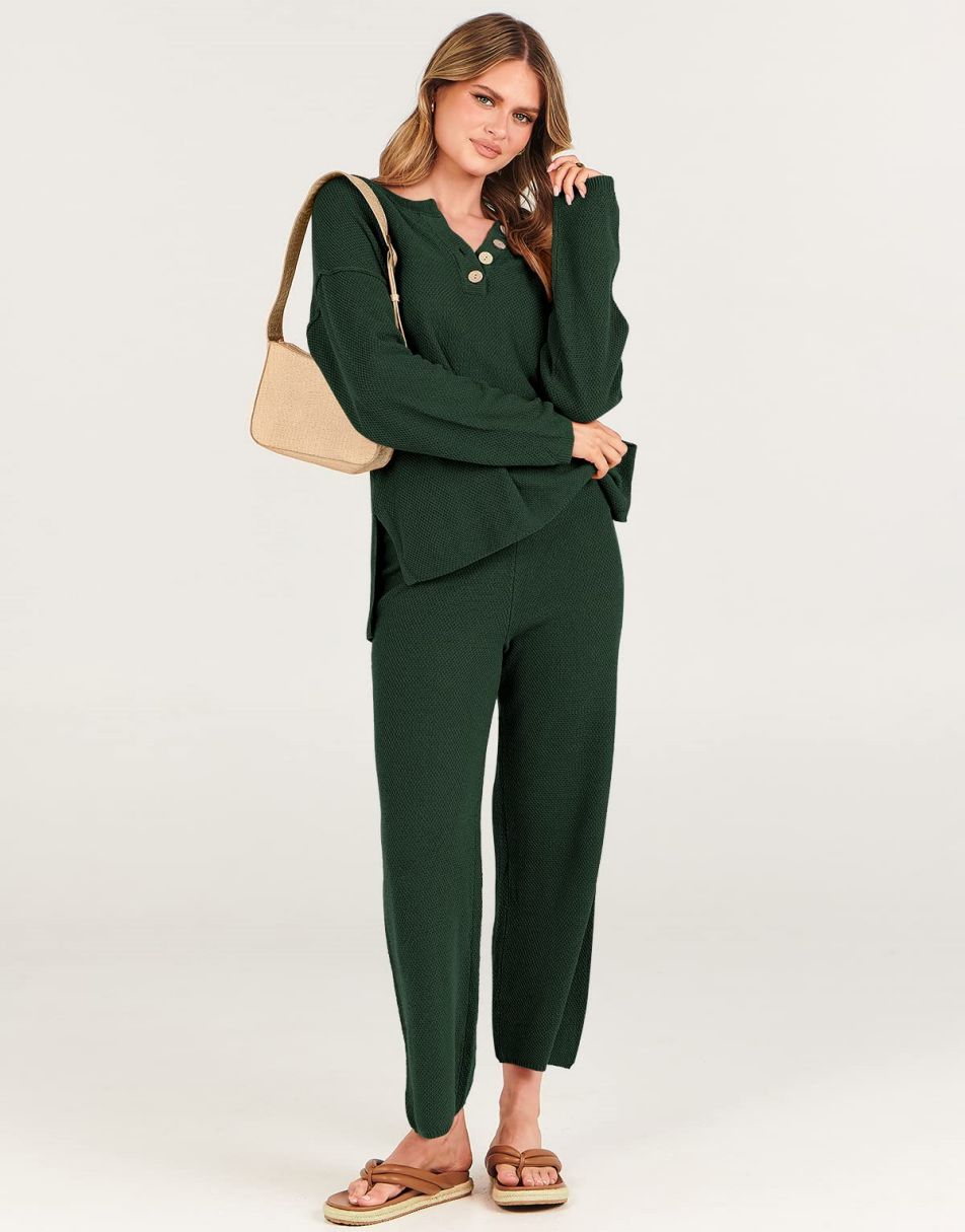 • Design -Top: crew neck, button design, oversized loose, side slit, dropped raglan sleeves; Pants: Elastic waistband, high-rise design, pull-on style. Worn as a set or separately to run errands or wear boots and wear it to dinner, it is so versatile you can wear it anyway you want.