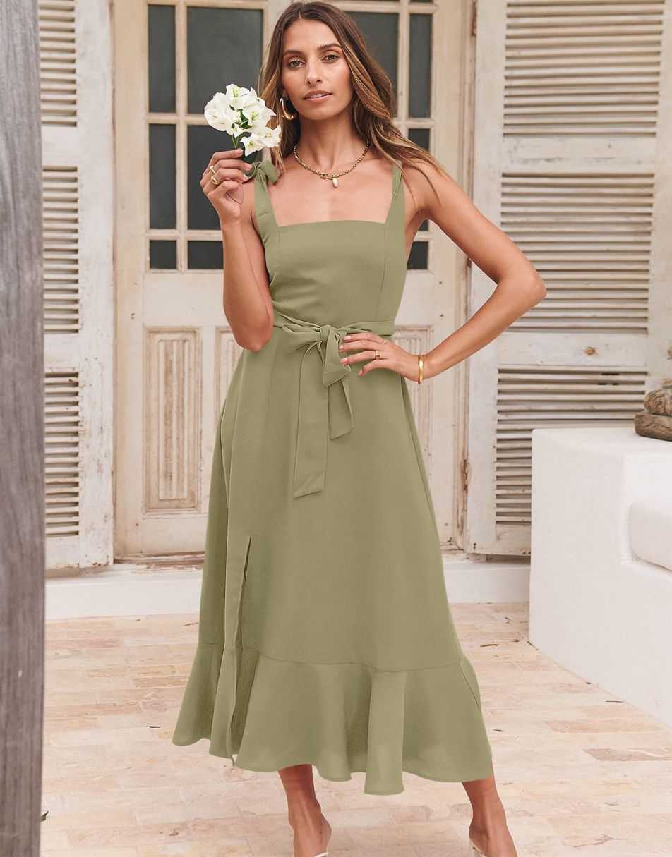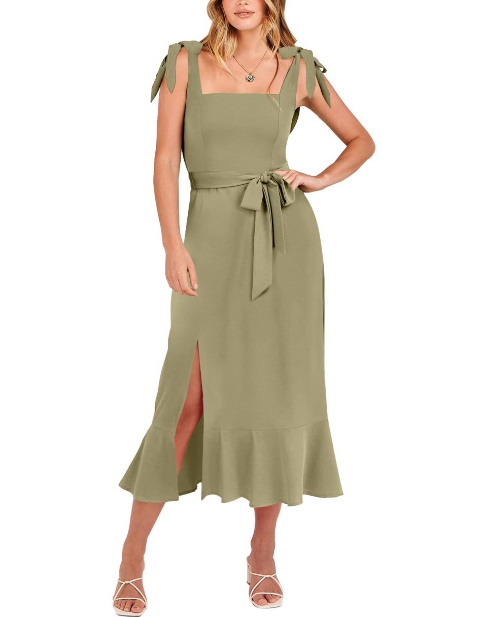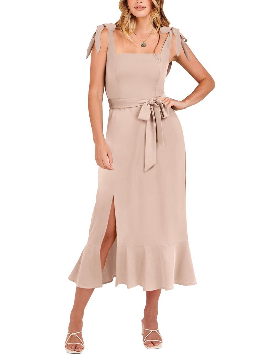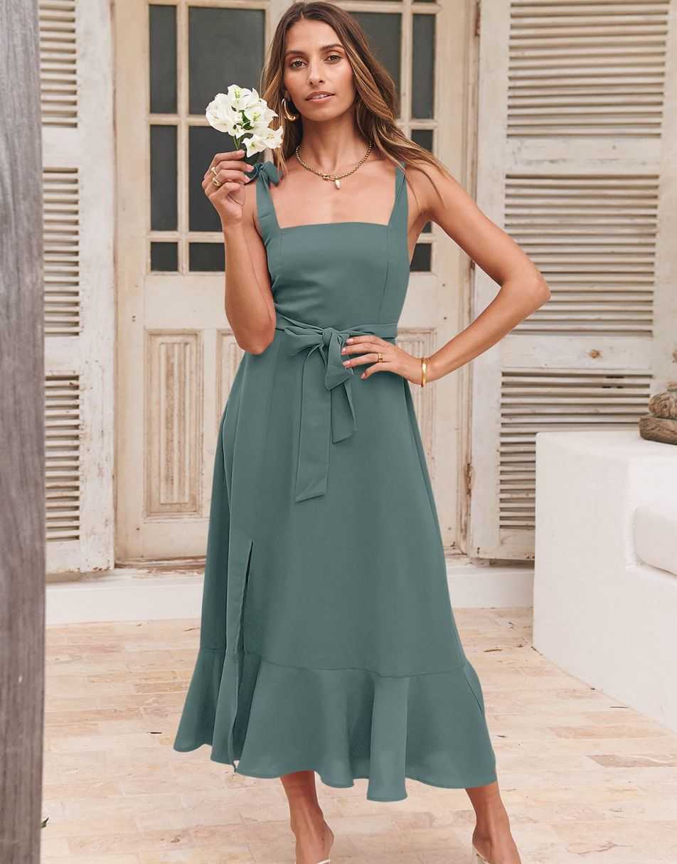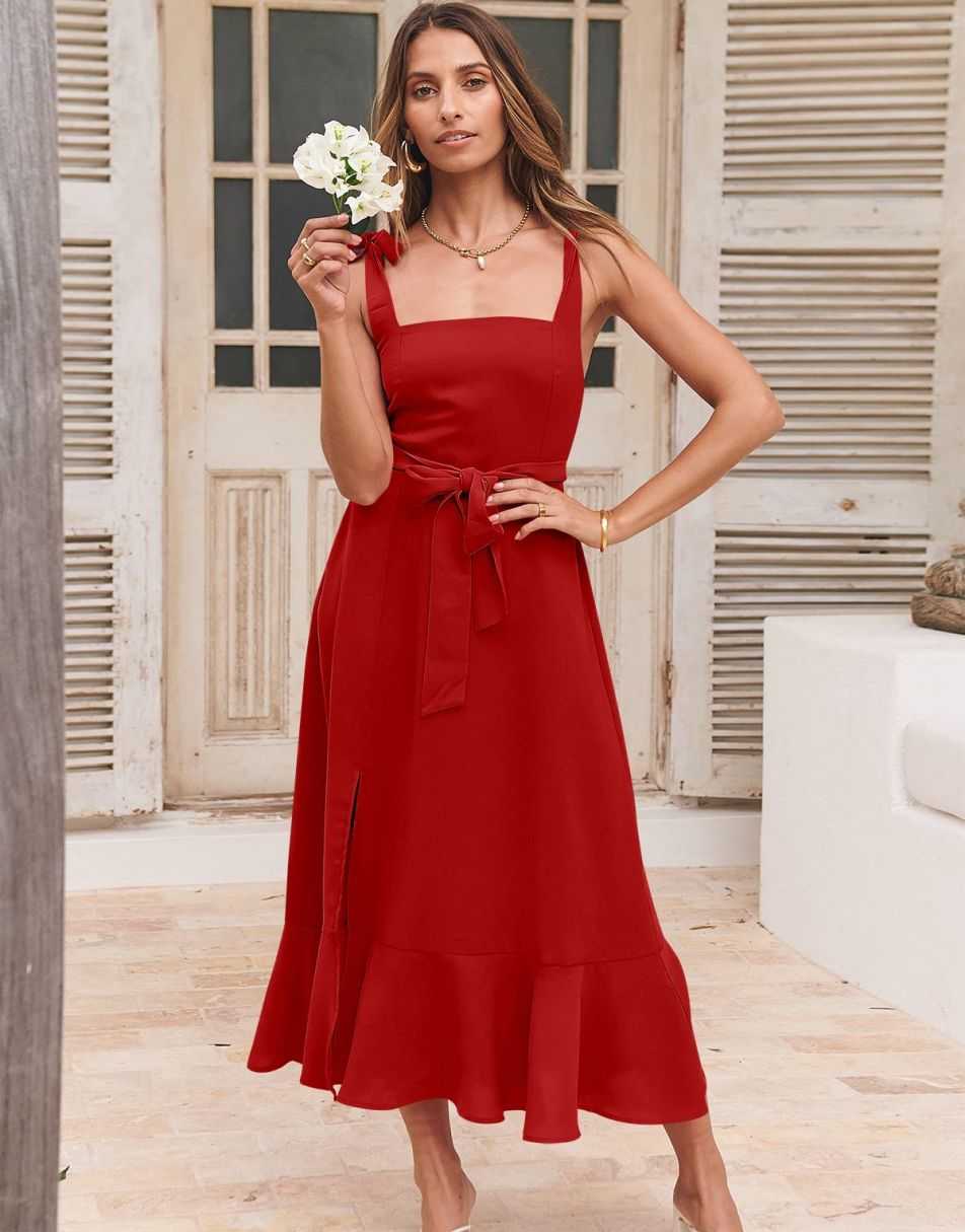 - Features - Shoulder Straps Tie, Solid Color, Sleeveless, Split Hem,Square Neck锛�Tie Waist Midi Dress for Women.