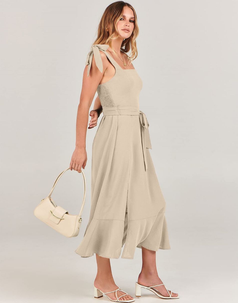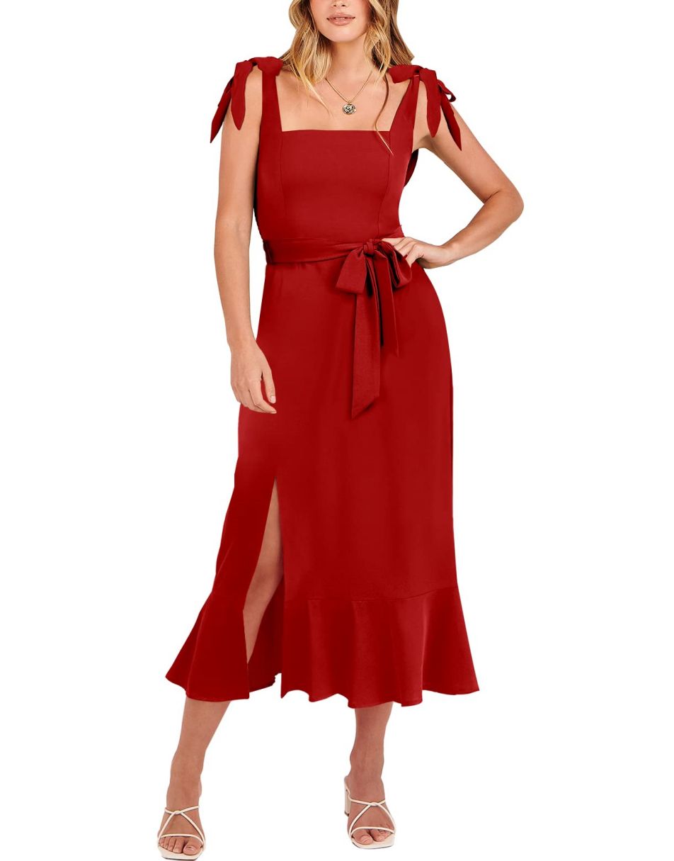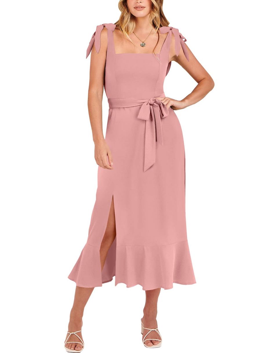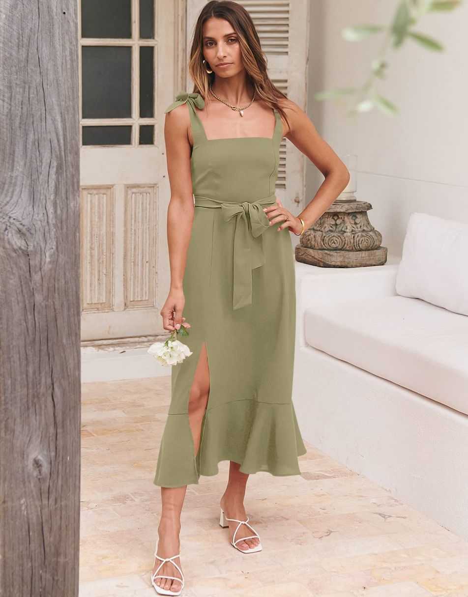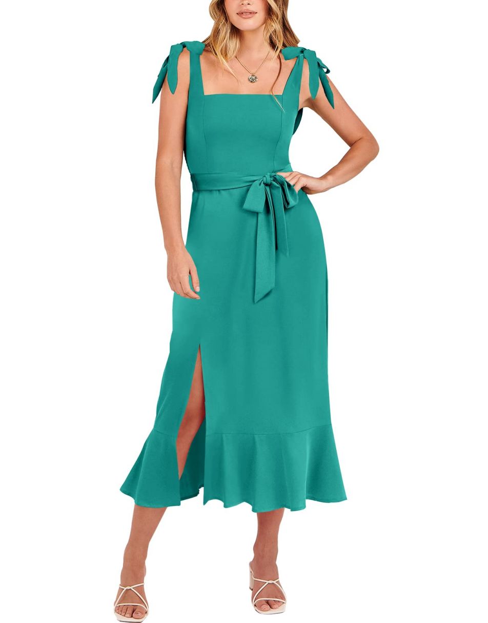 - Features - Shoulder Straps Tie, Solid Color, Sleeveless, Split Hem,Square Neck锛�Tie Waist Midi Dress for Women.
