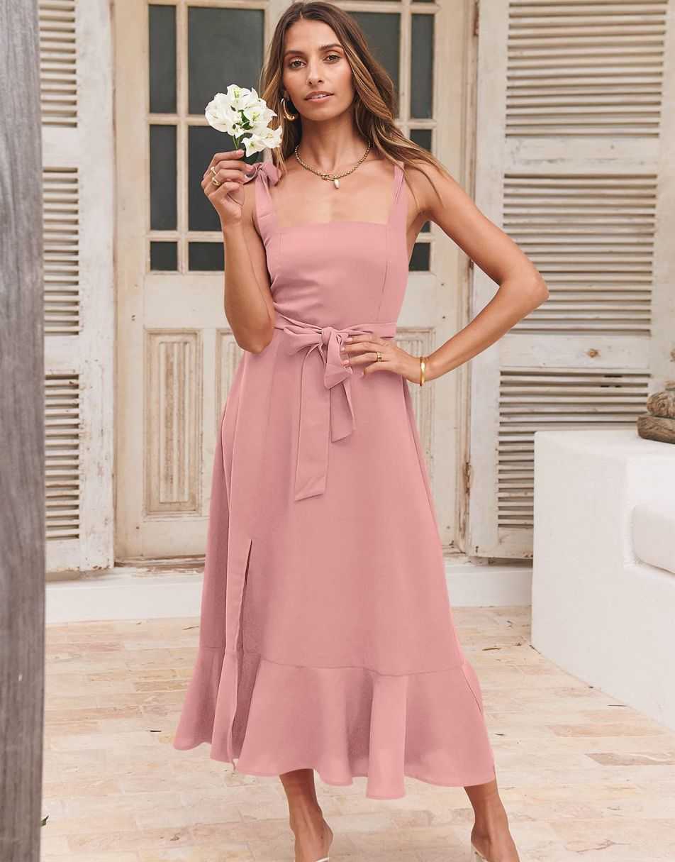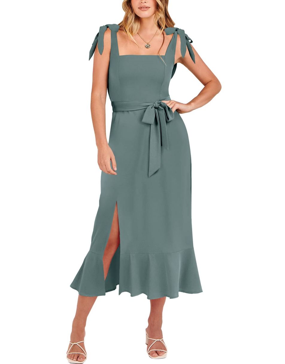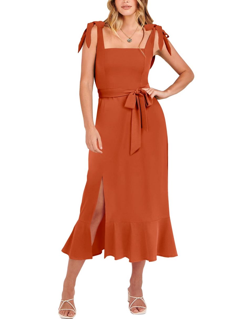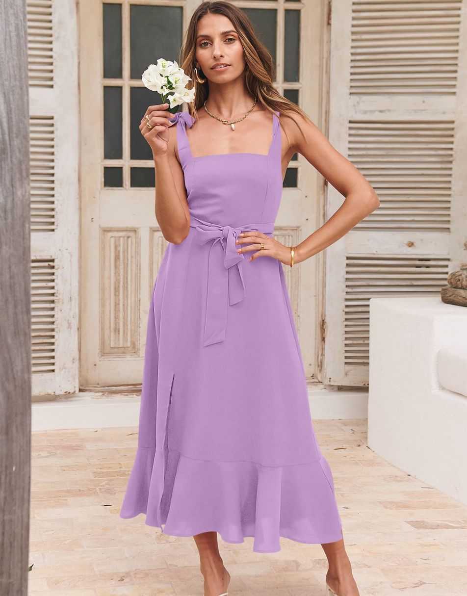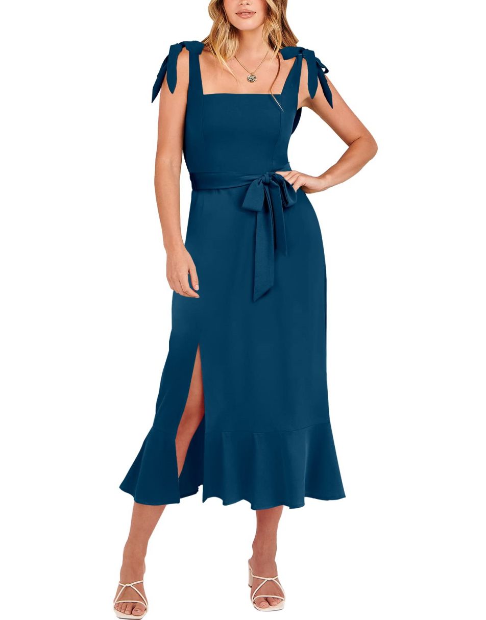 - Features - Shoulder Straps Tie, Solid Color, Sleeveless, Split Hem,Square Neck锛�Tie Waist Midi Dress for Women.