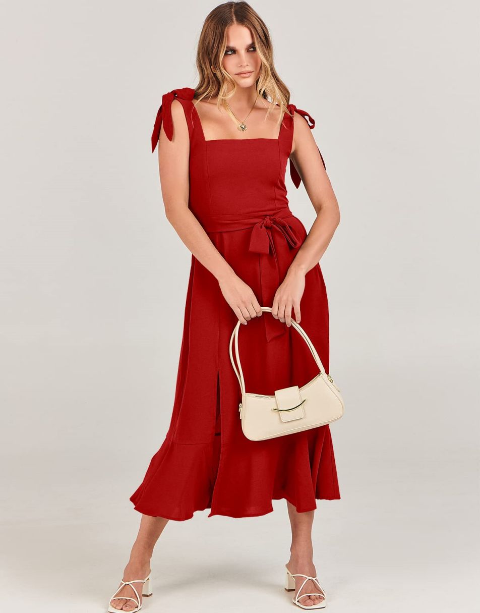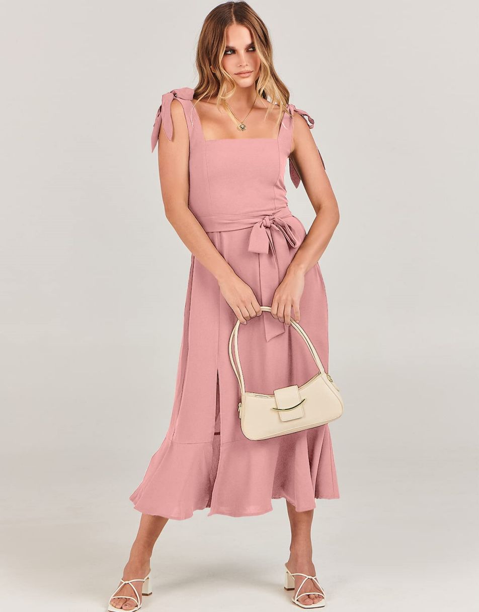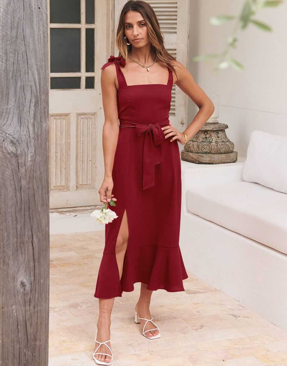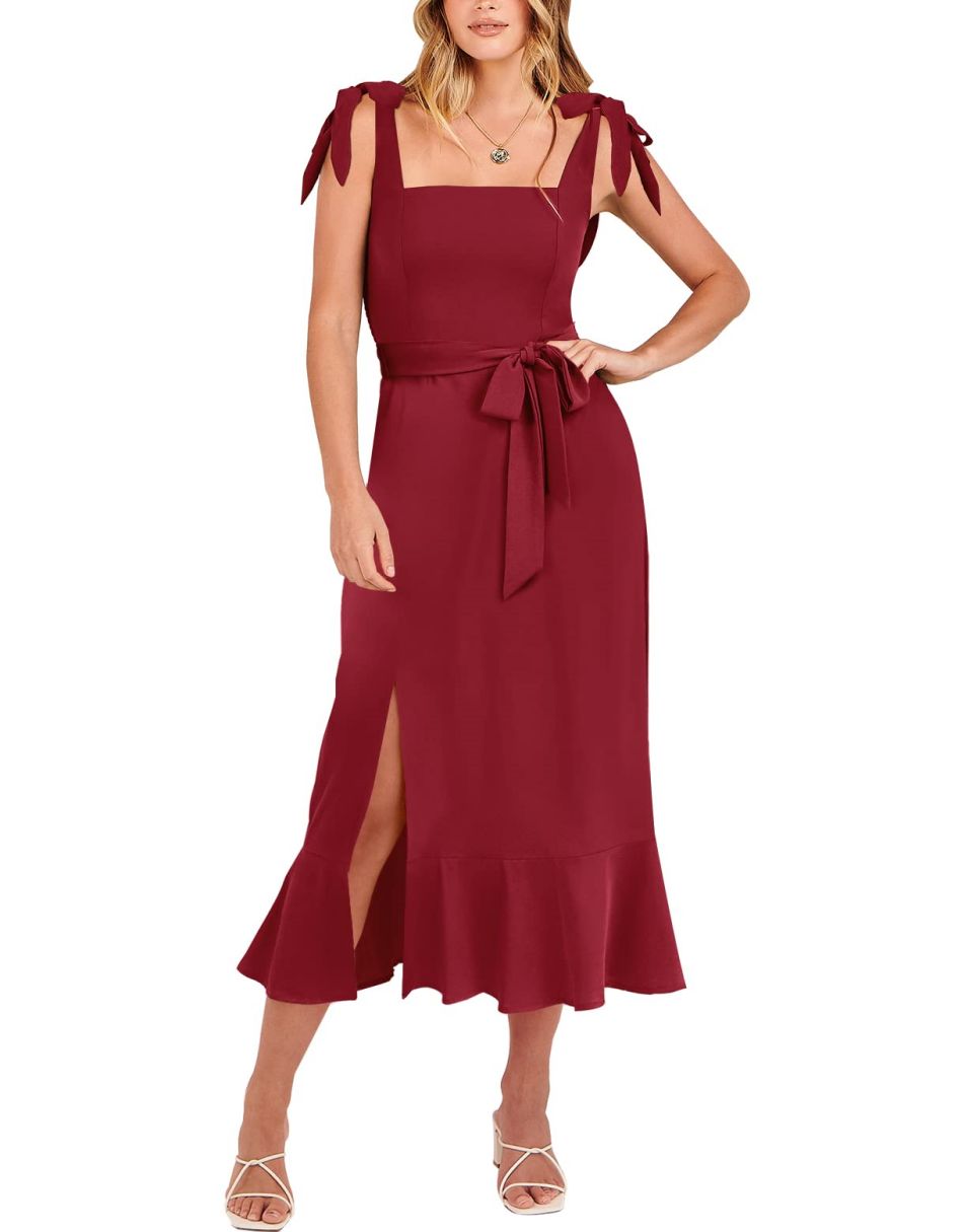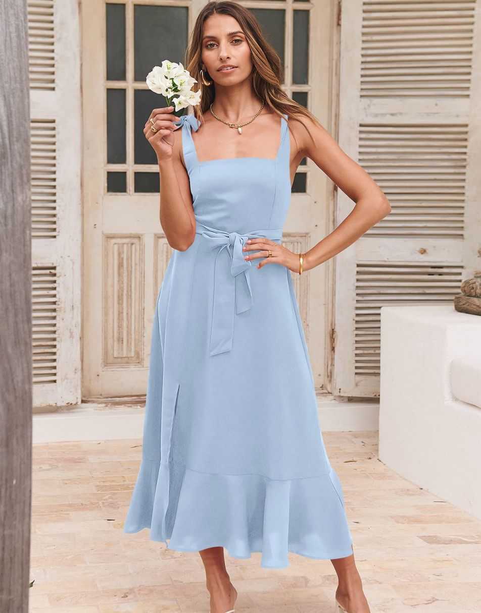 - Features - Shoulder Straps Tie, Solid Color, Sleeveless, Split Hem,Square Neck锛�Tie Waist Midi Dress for Women.