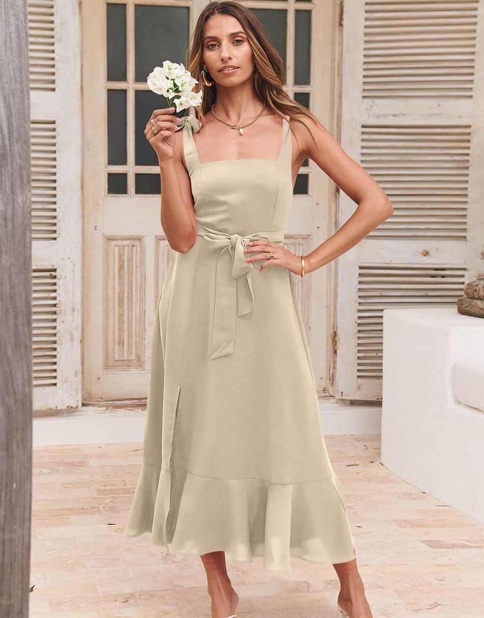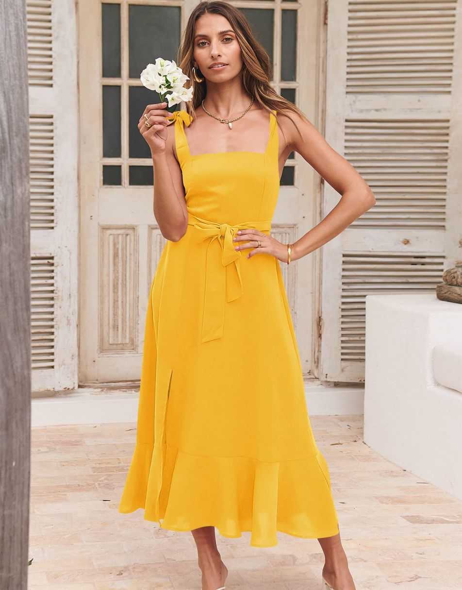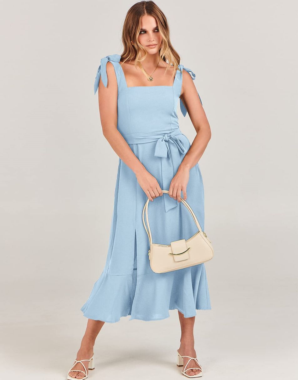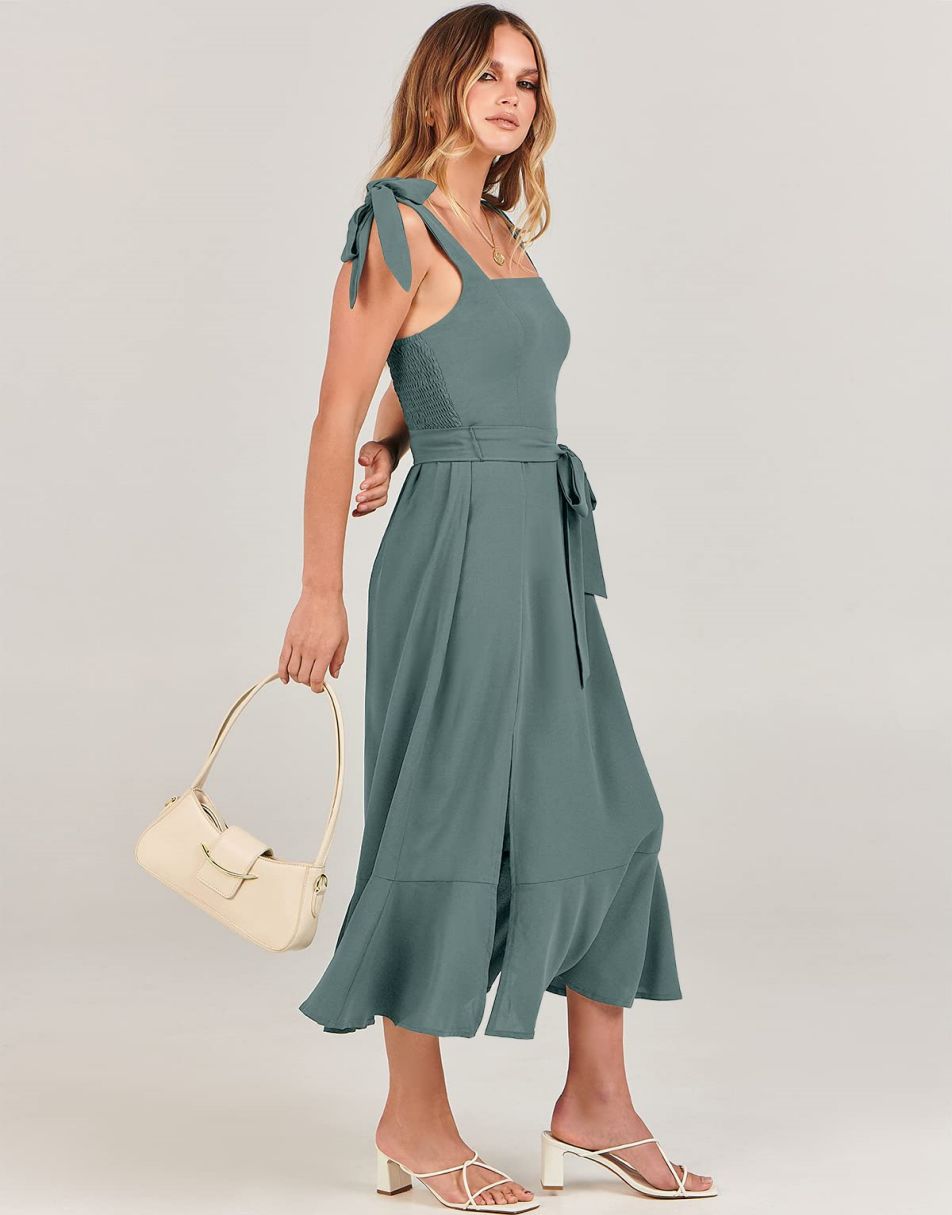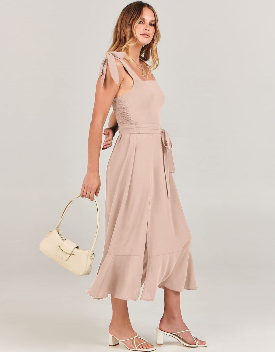 - Features - Shoulder Straps Tie, Solid Color, Sleeveless, Split Hem,Square Neck锛�Tie Waist Midi Dress for Women.