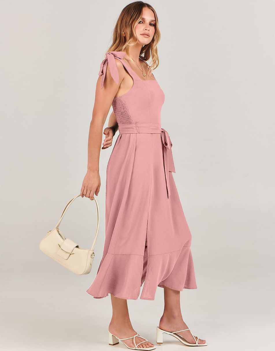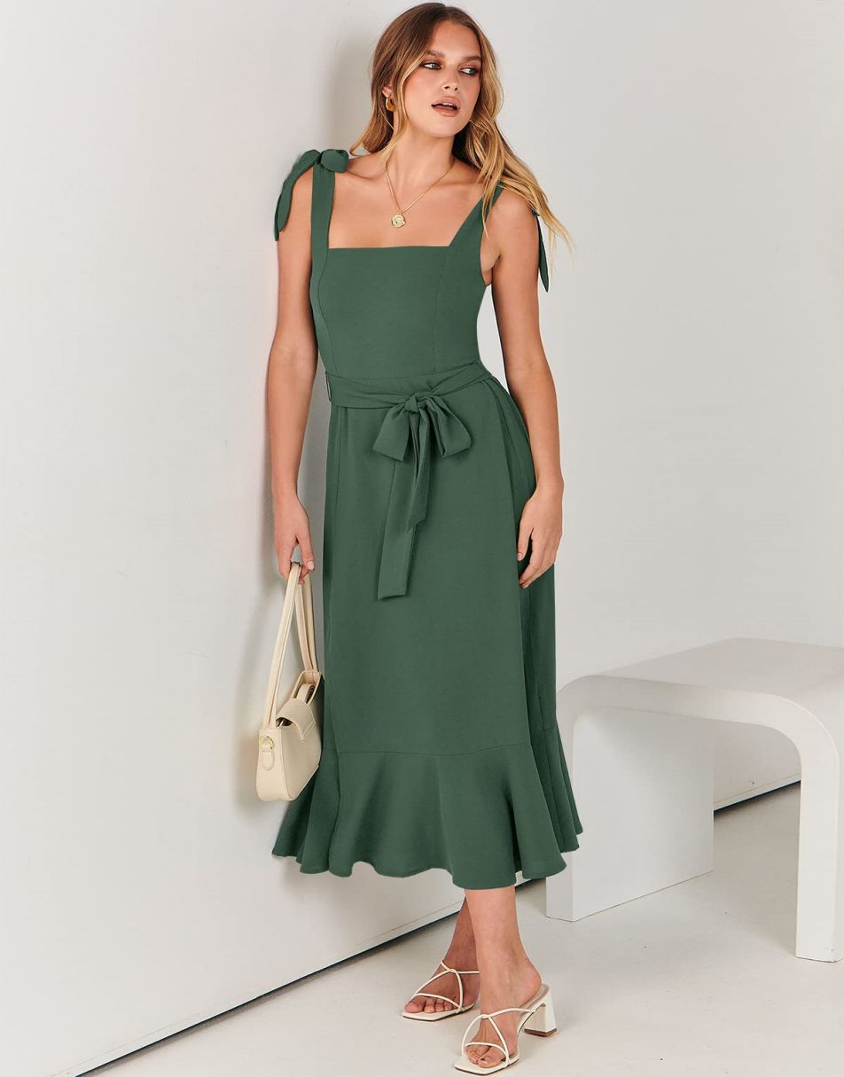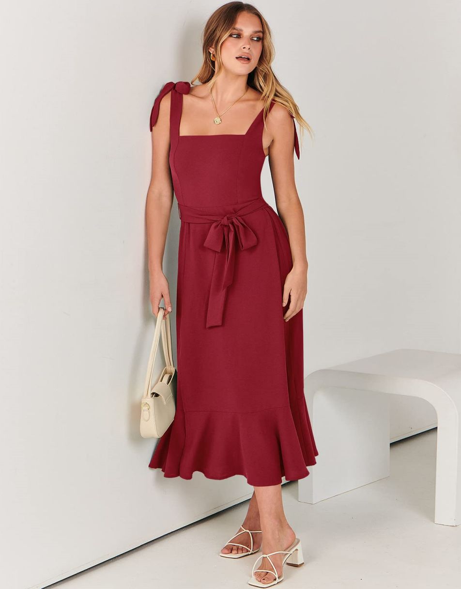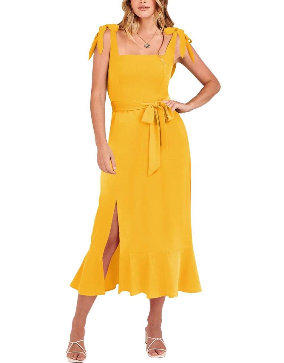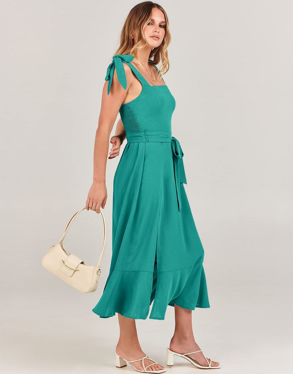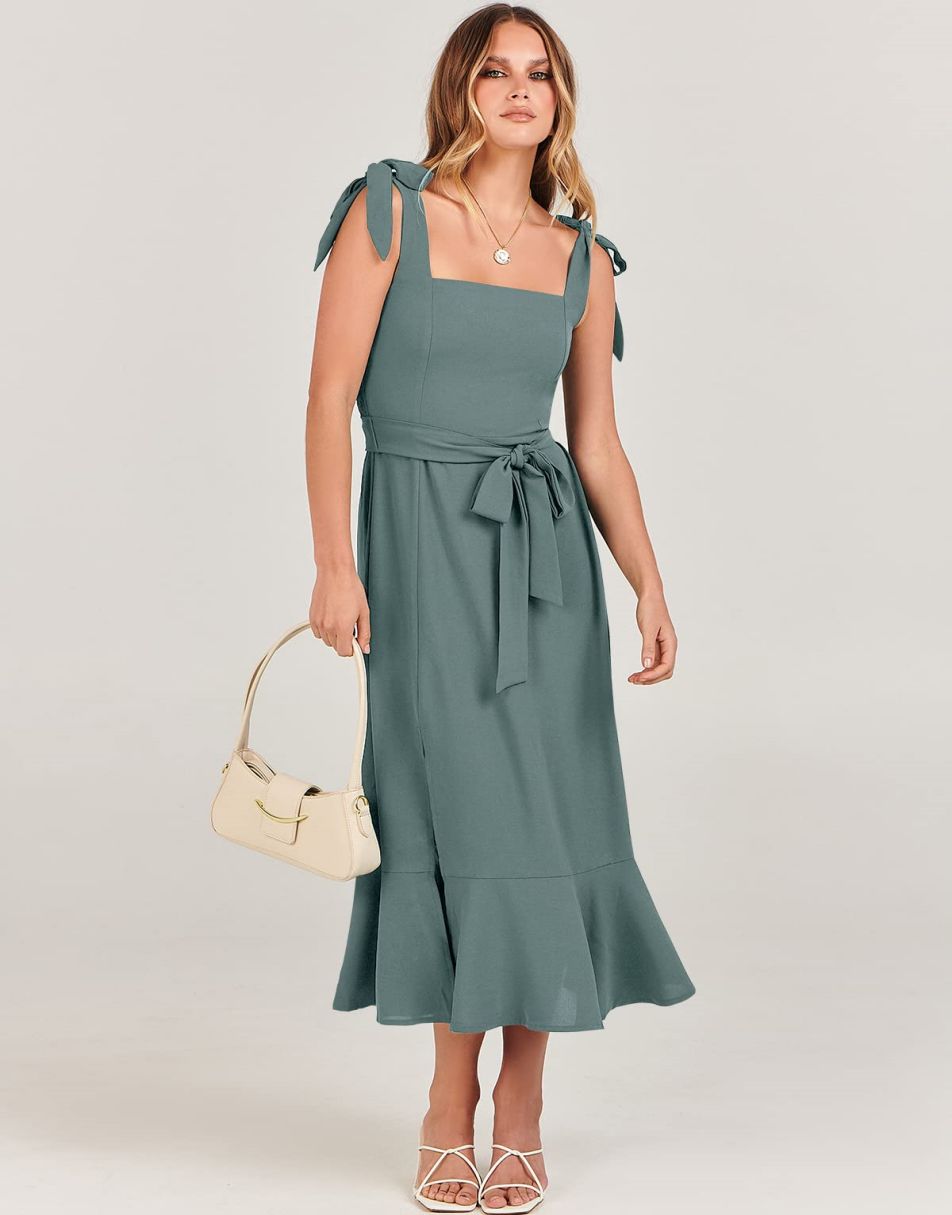 - Features - Shoulder Straps Tie, Solid Color, Sleeveless, Split Hem,Square Neck锛�Tie Waist Midi Dress for Women.