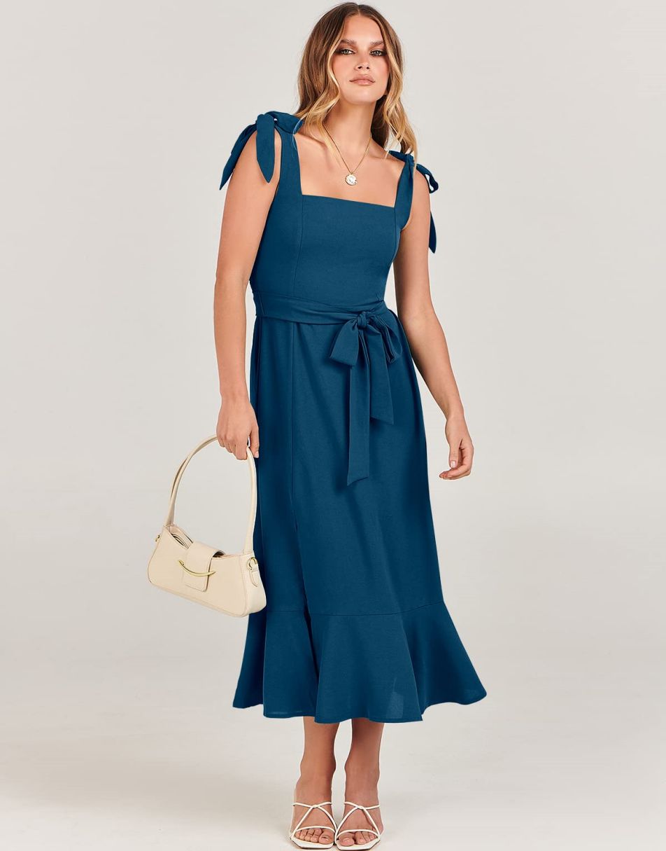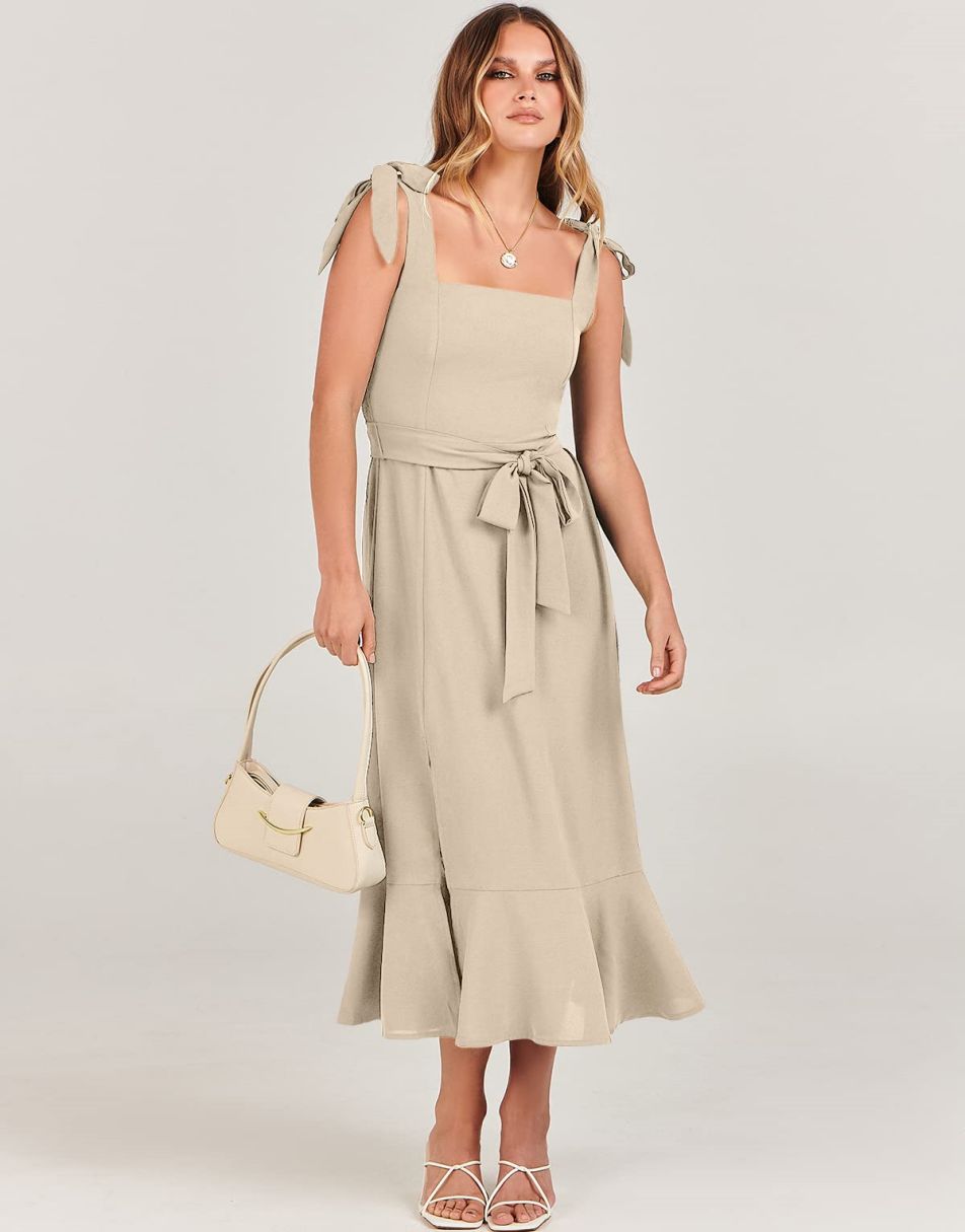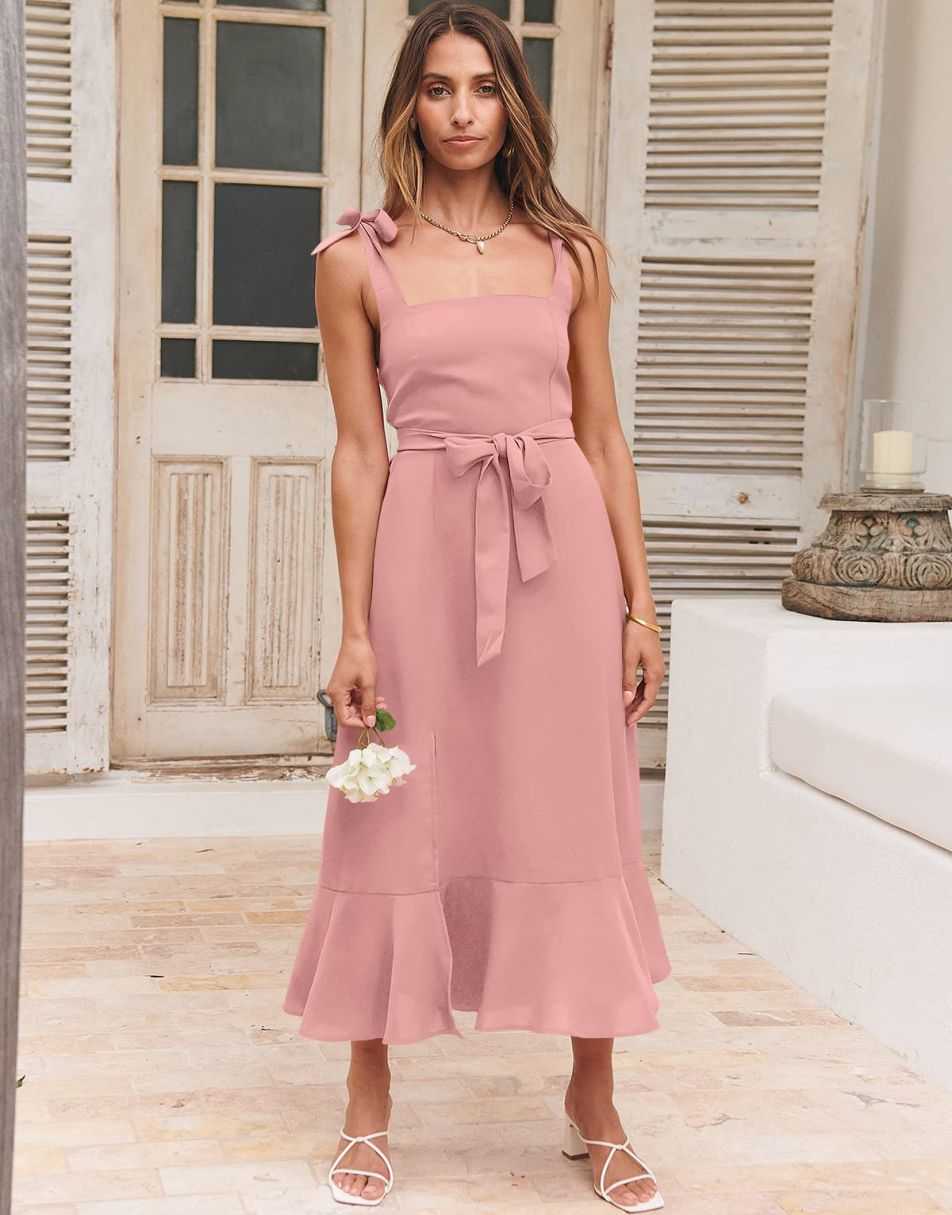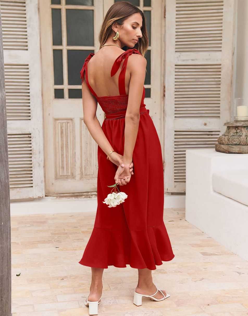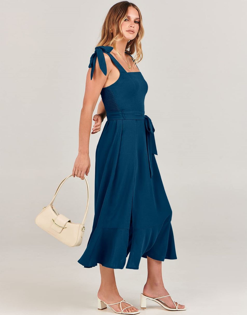 - Features - Shoulder Straps Tie, Solid Color, Sleeveless, Split Hem,Square Neck锛�Tie Waist Midi Dress for Women.