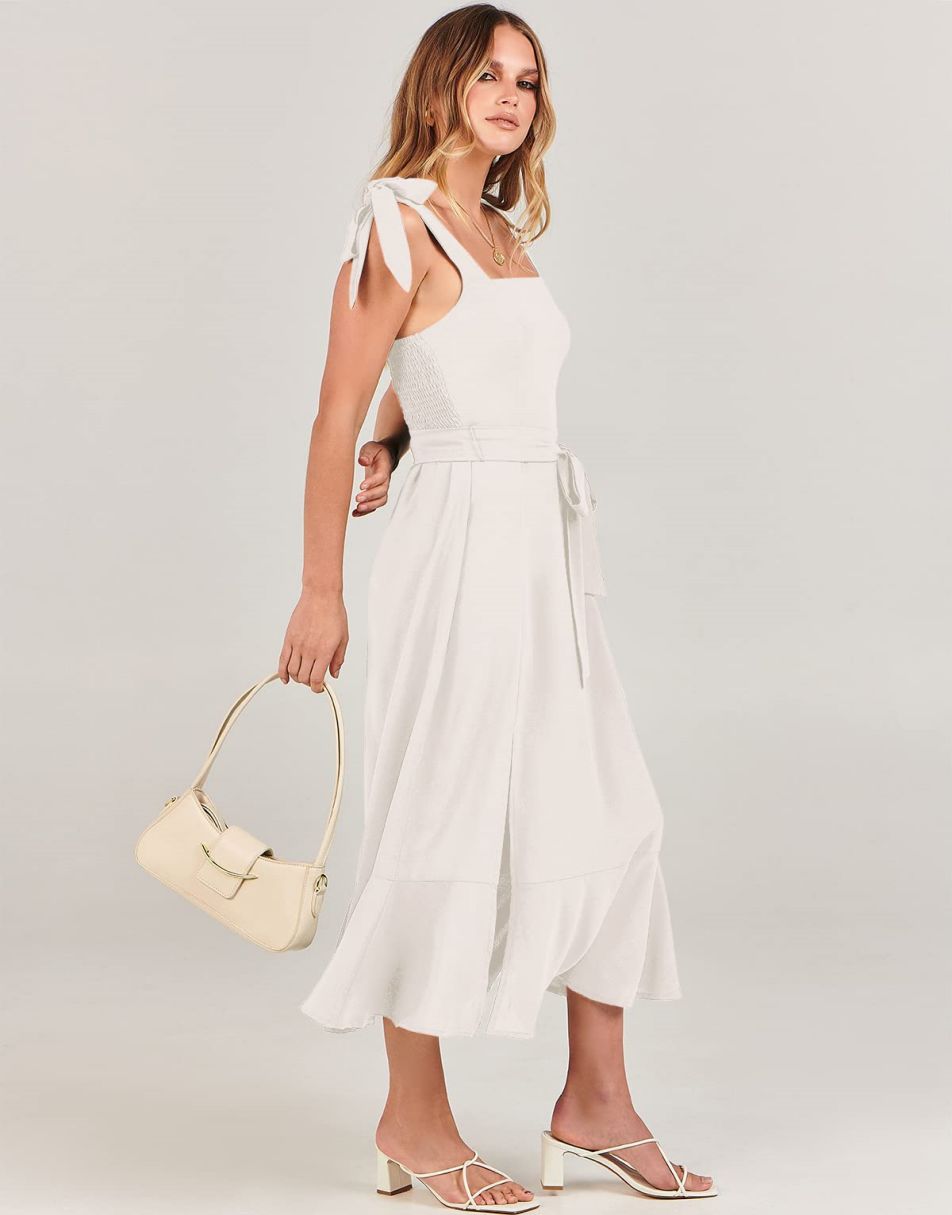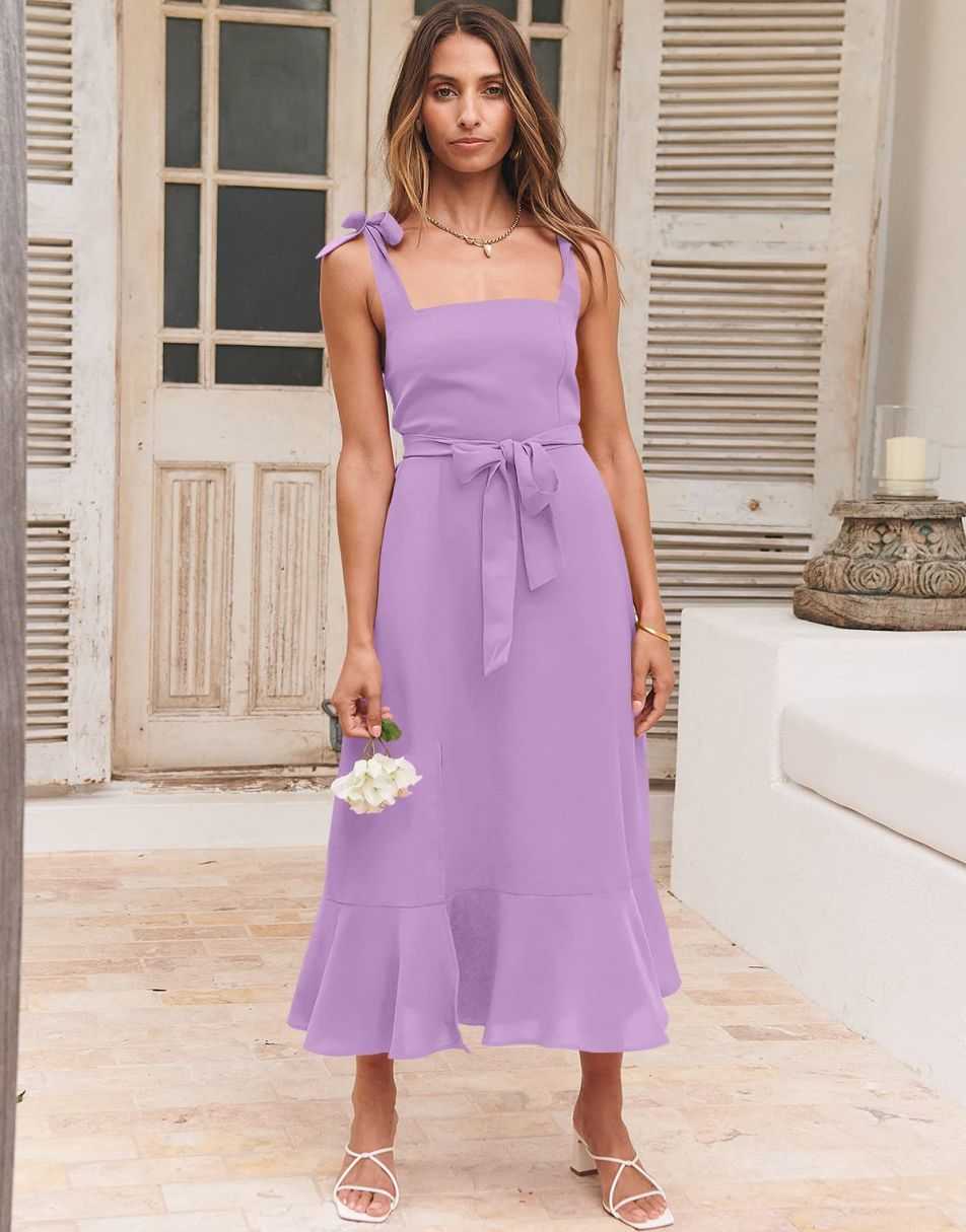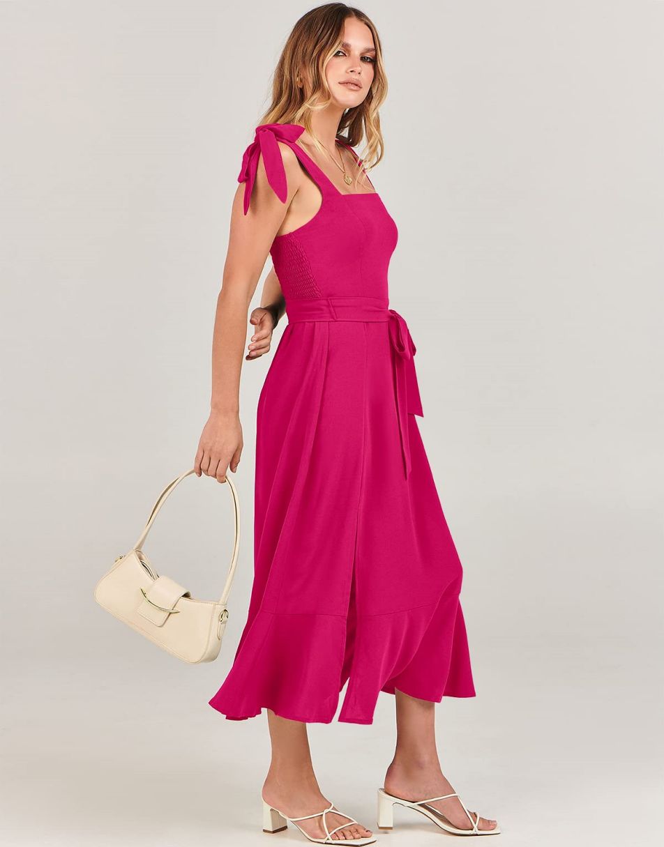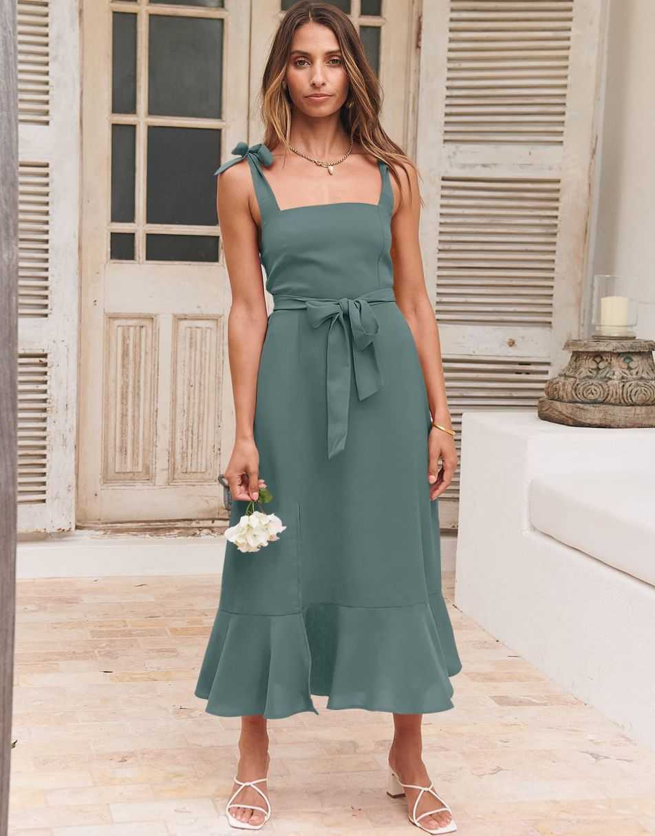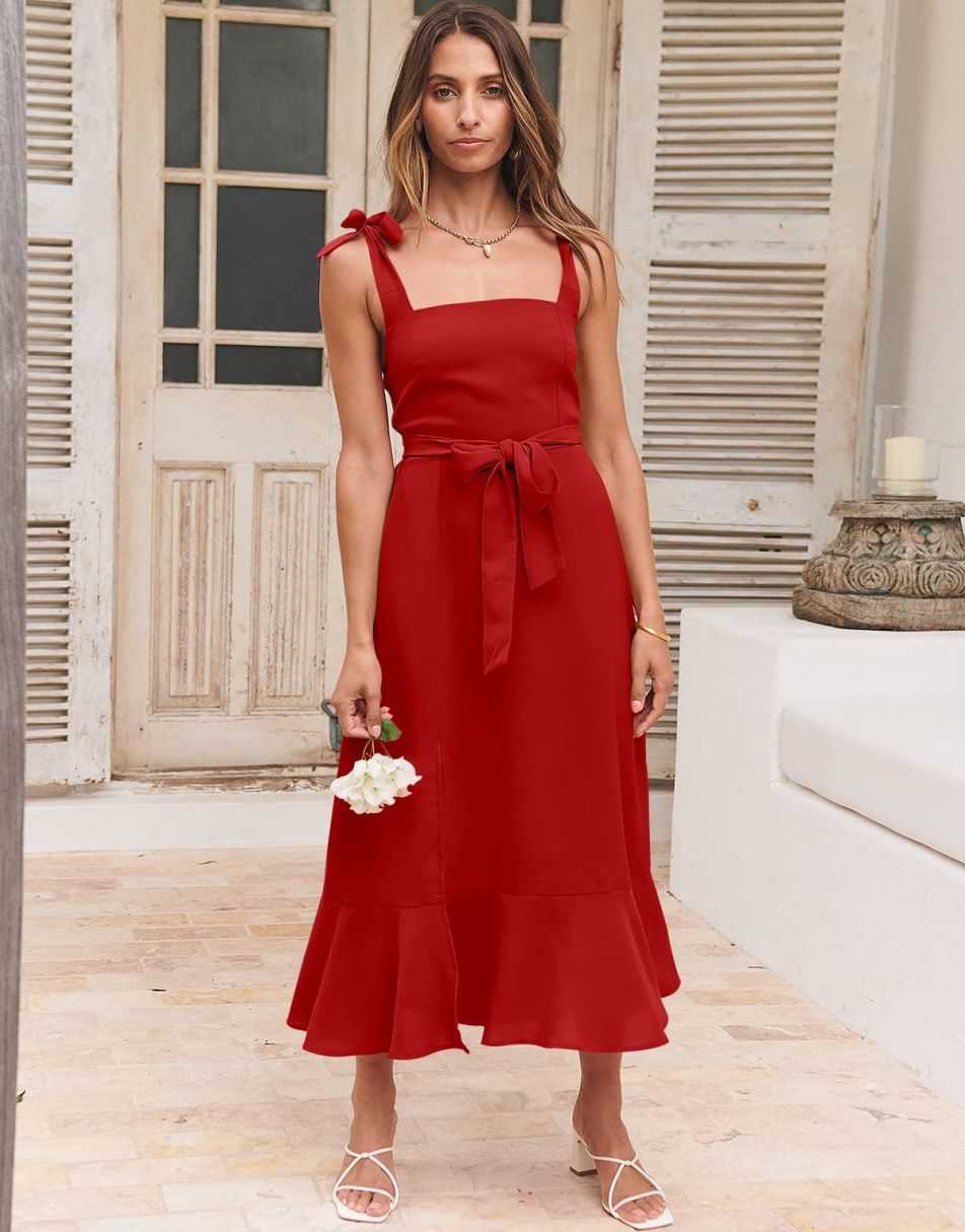 - Features - Shoulder Straps Tie, Solid Color, Sleeveless, Split Hem,Square Neck锛�Tie Waist Midi Dress for Women.