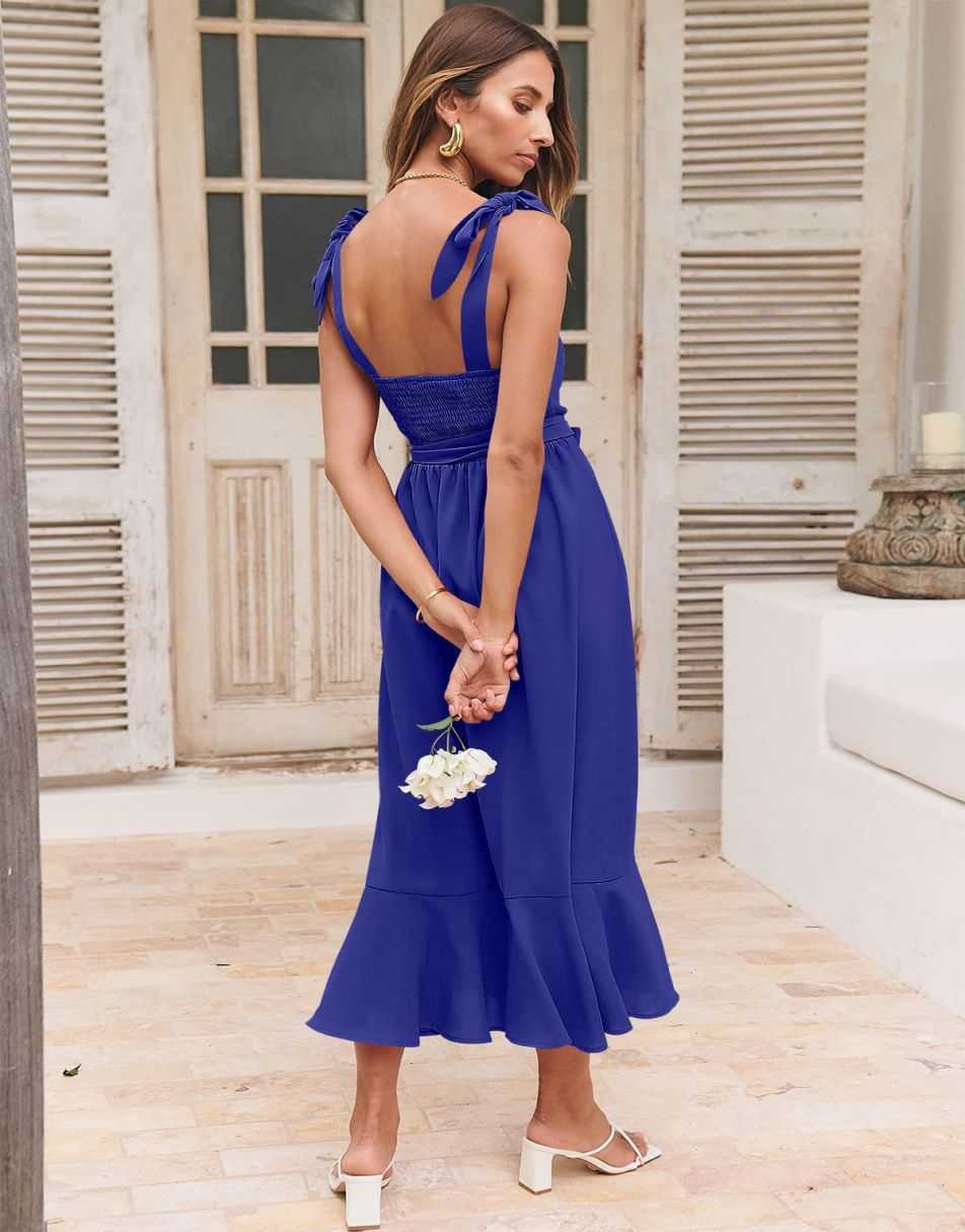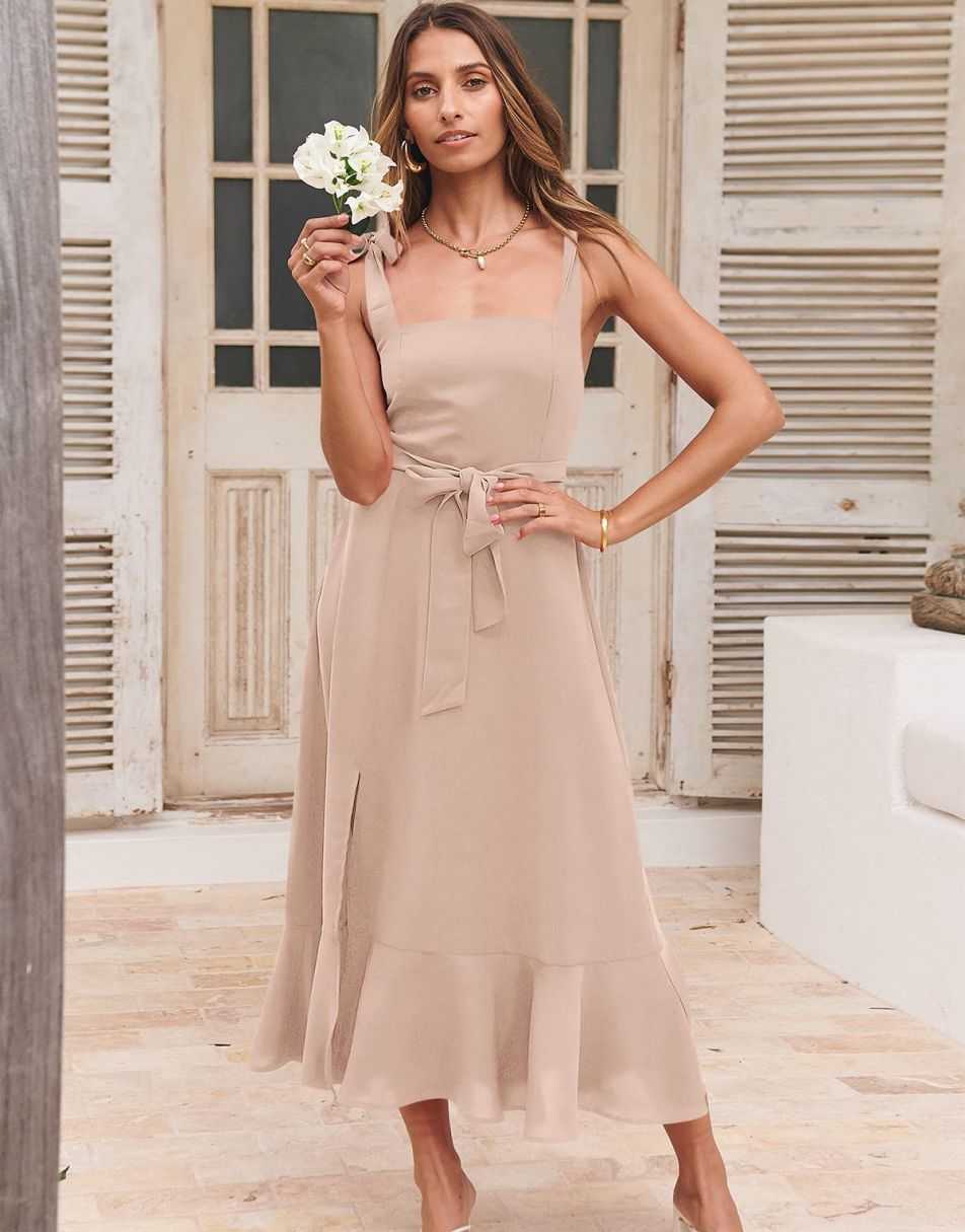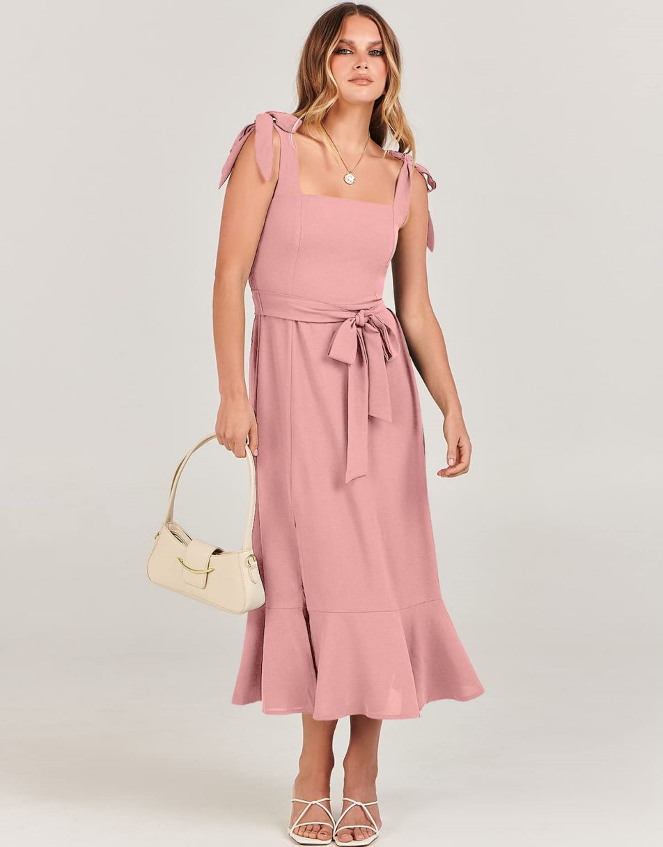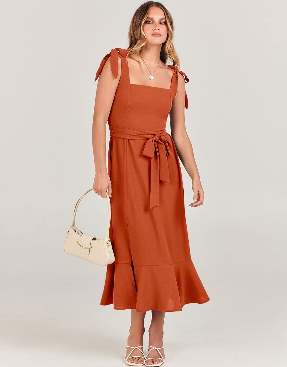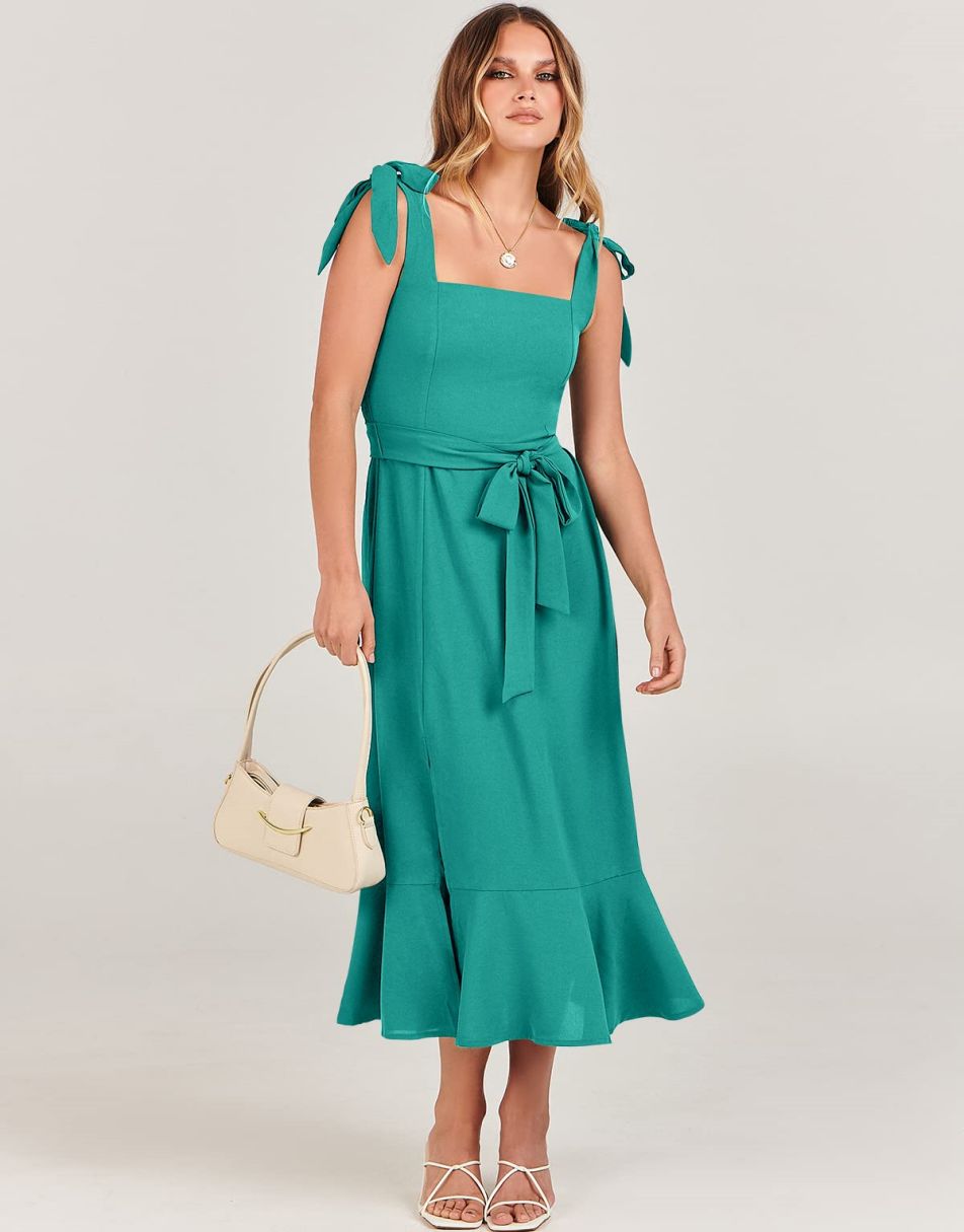 - Features - Shoulder Straps Tie, Solid Color, Sleeveless, Split Hem,Square Neck锛�Tie Waist Midi Dress for Women.