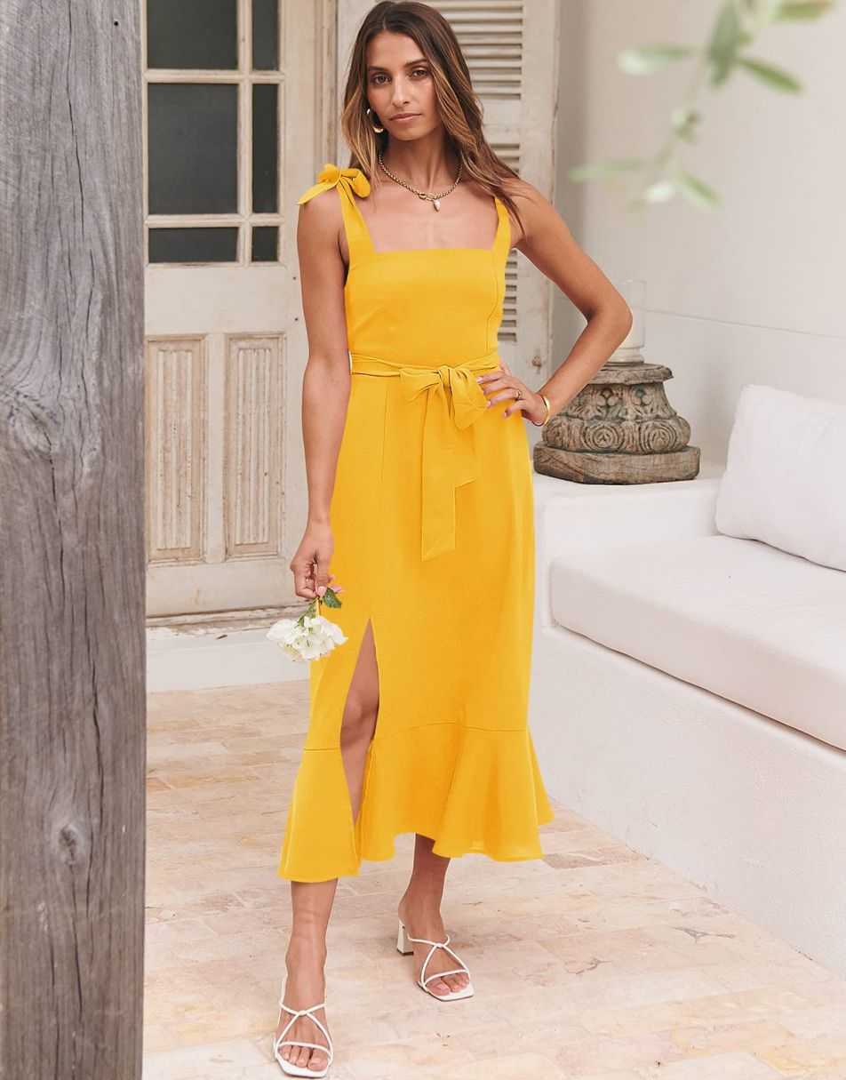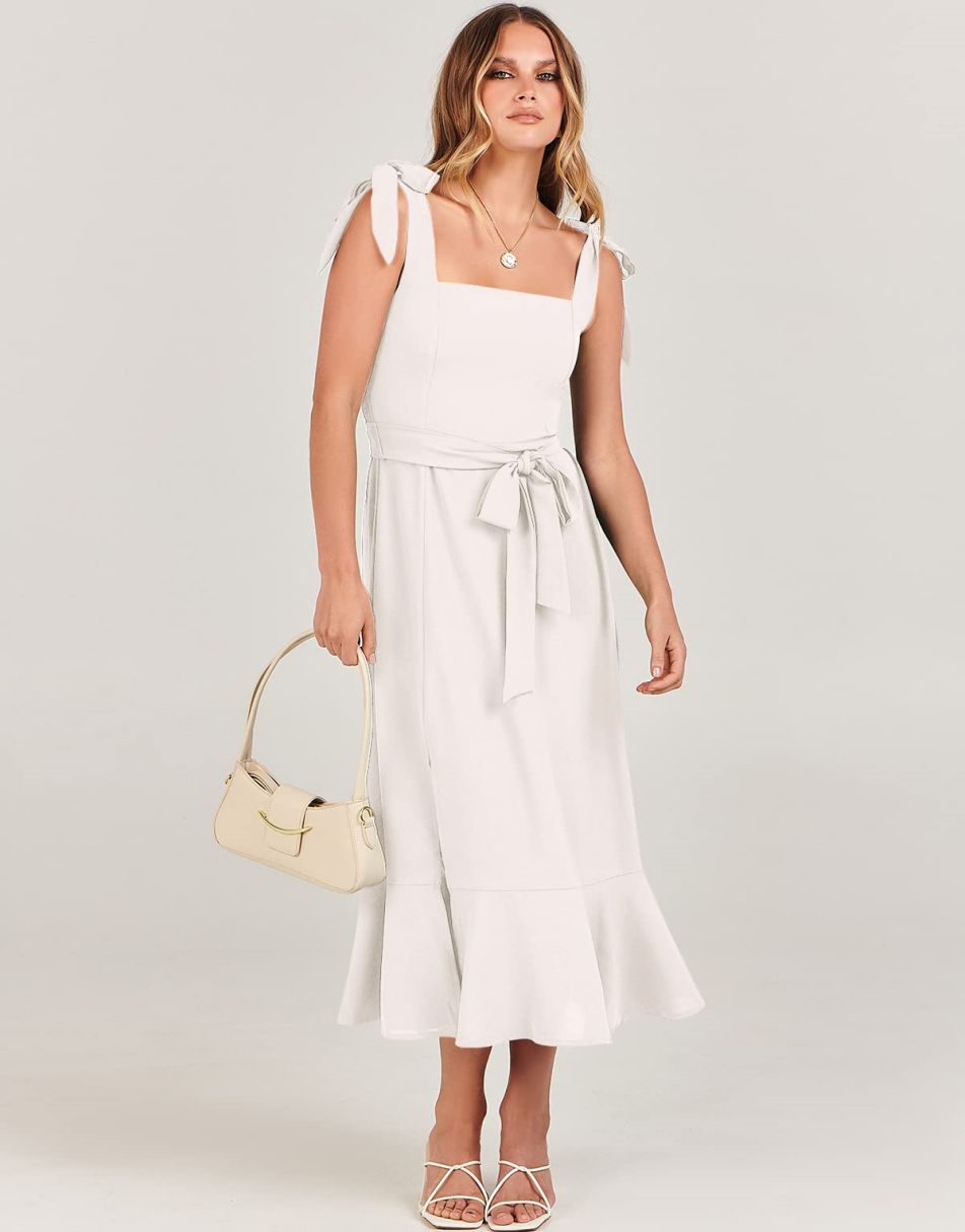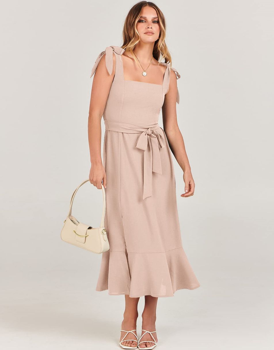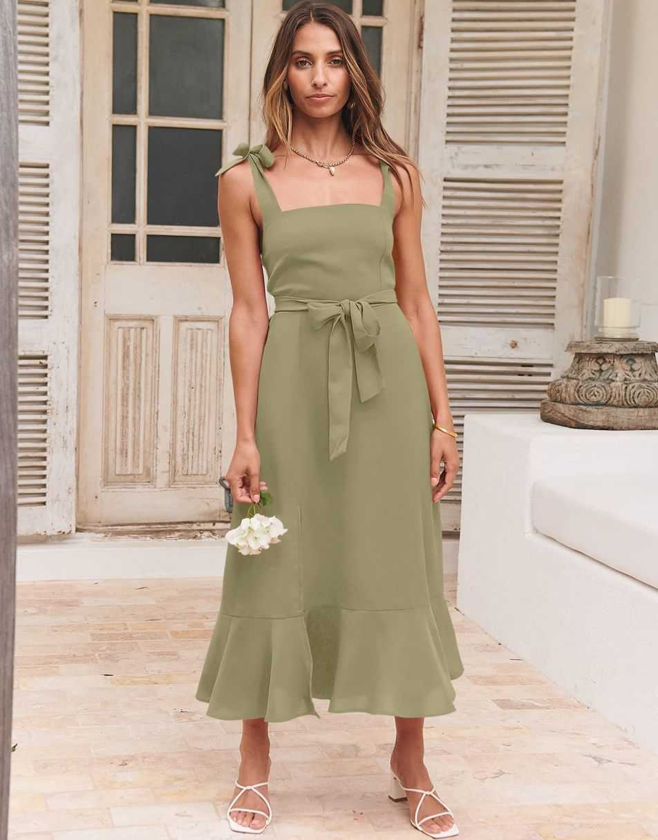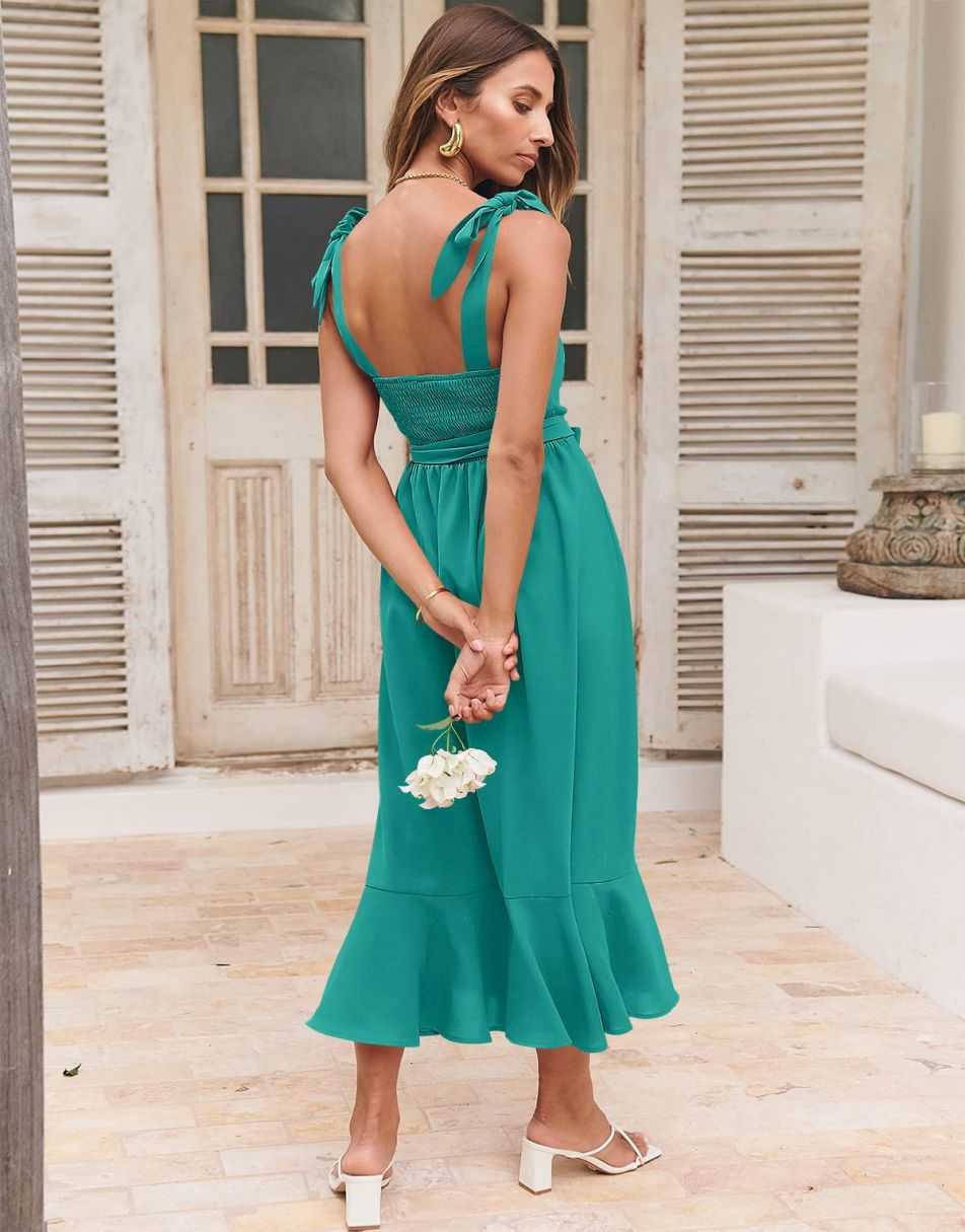 - Features - Shoulder Straps Tie, Solid Color, Sleeveless, Split Hem,Square Neck锛�Tie Waist Midi Dress for Women.