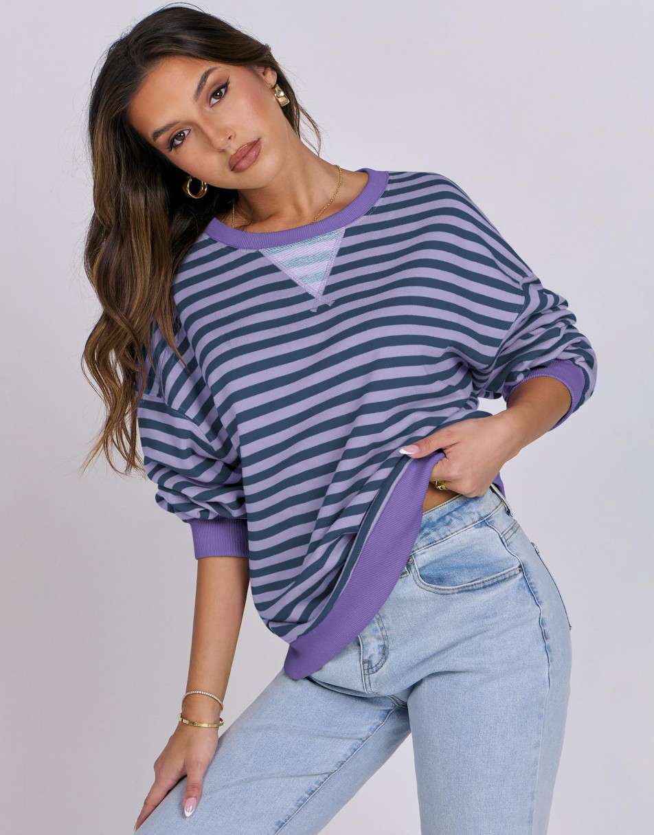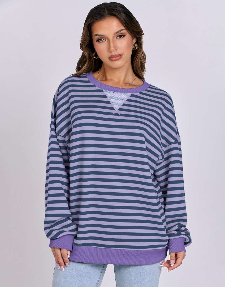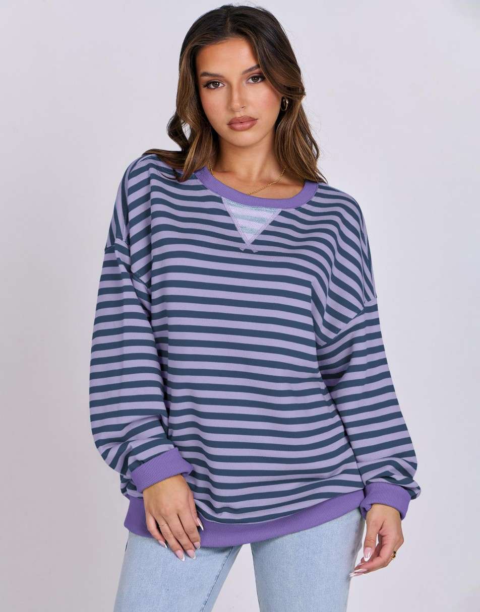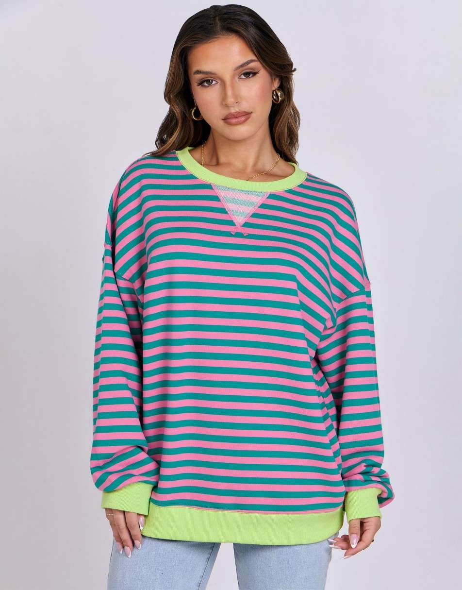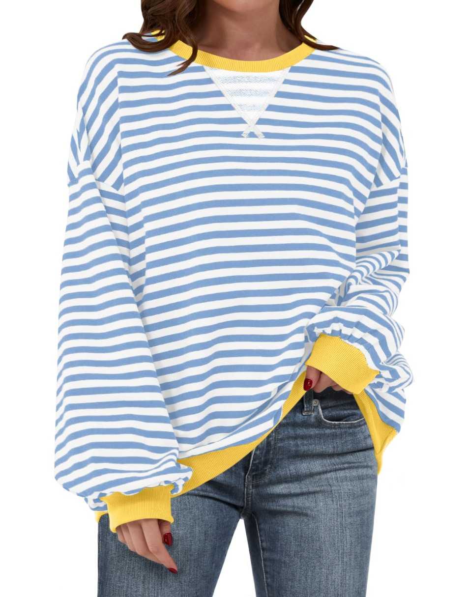 Features - Women's Oversized Sweatshirts, crew neck, long sleeve, Striped. The women Loose Pullover tops great for daily wear, school, office, work.