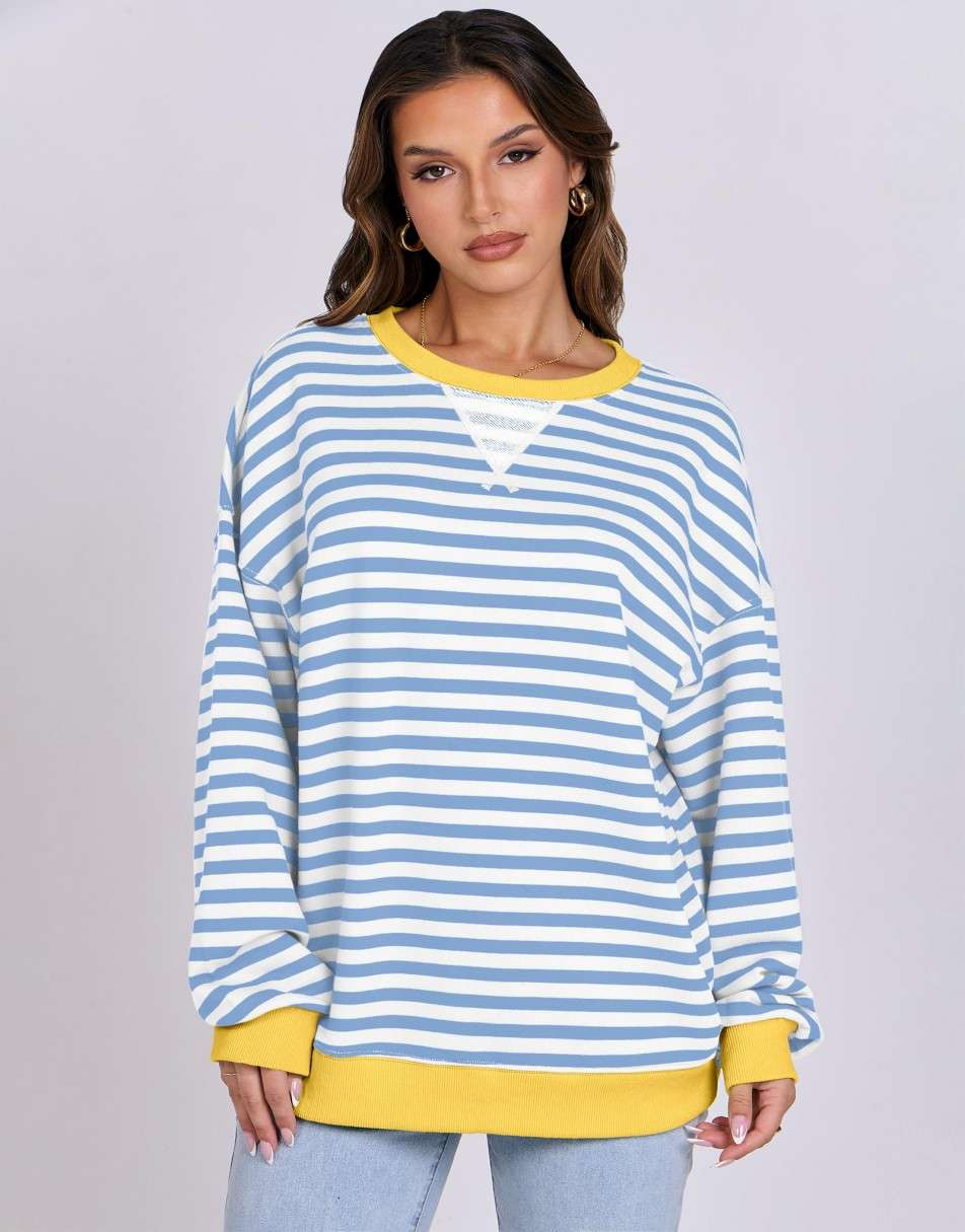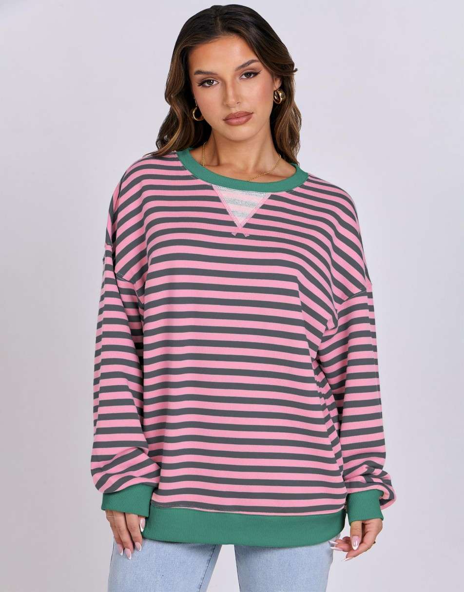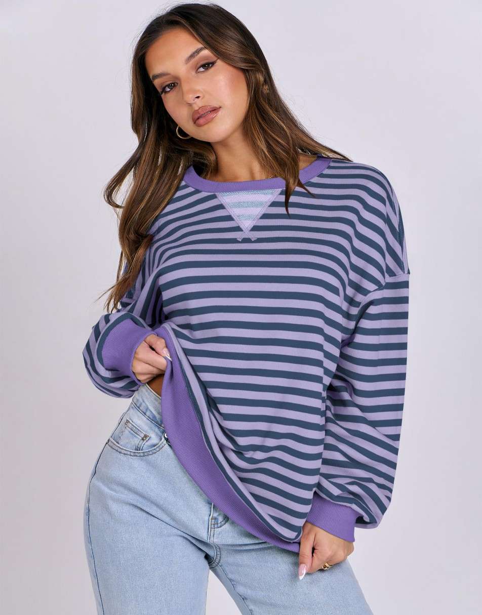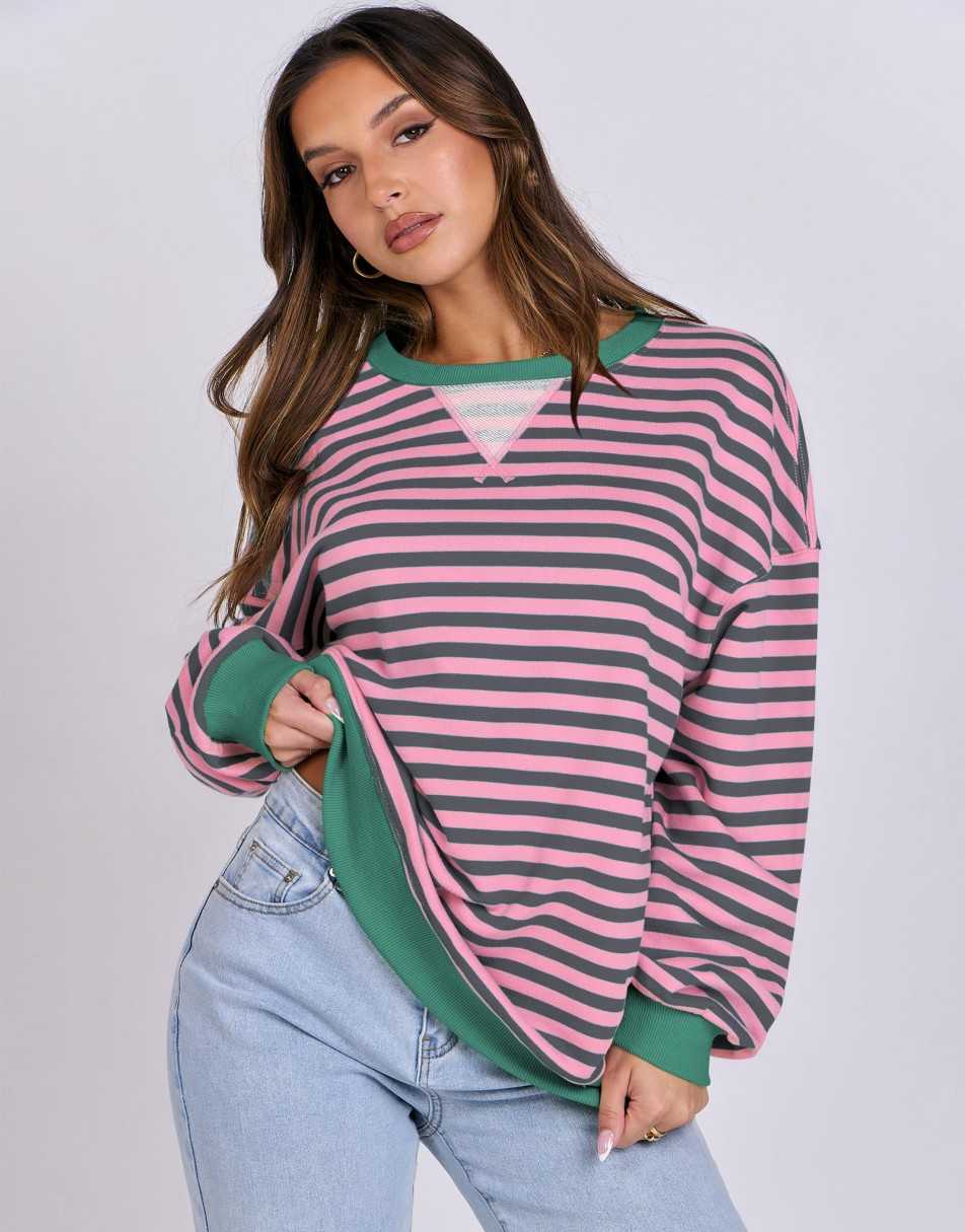 Features - Women's Oversized Sweatshirts, crew neck, long sleeve, Striped. The women Loose Pullover tops great for daily wear, school, office, work.