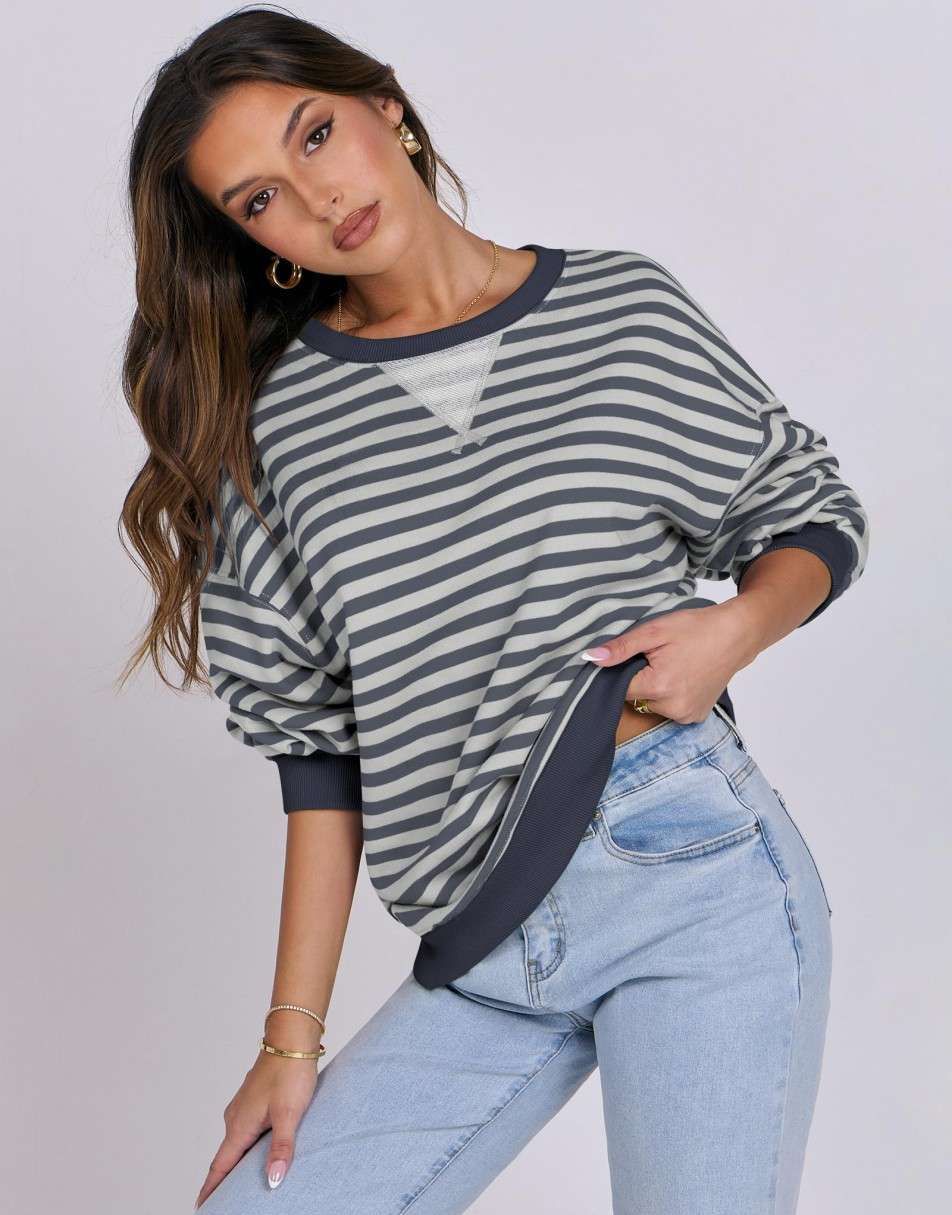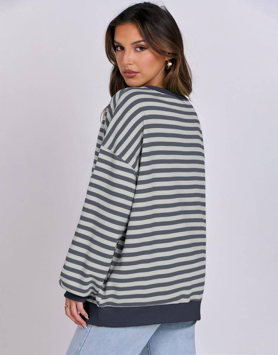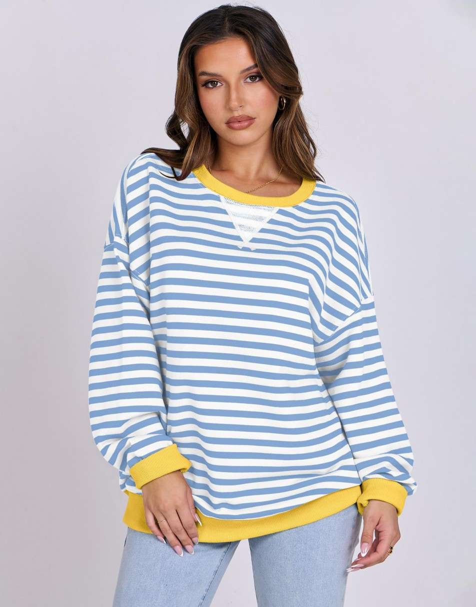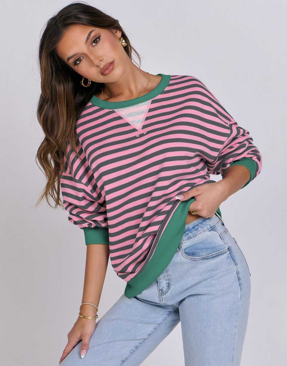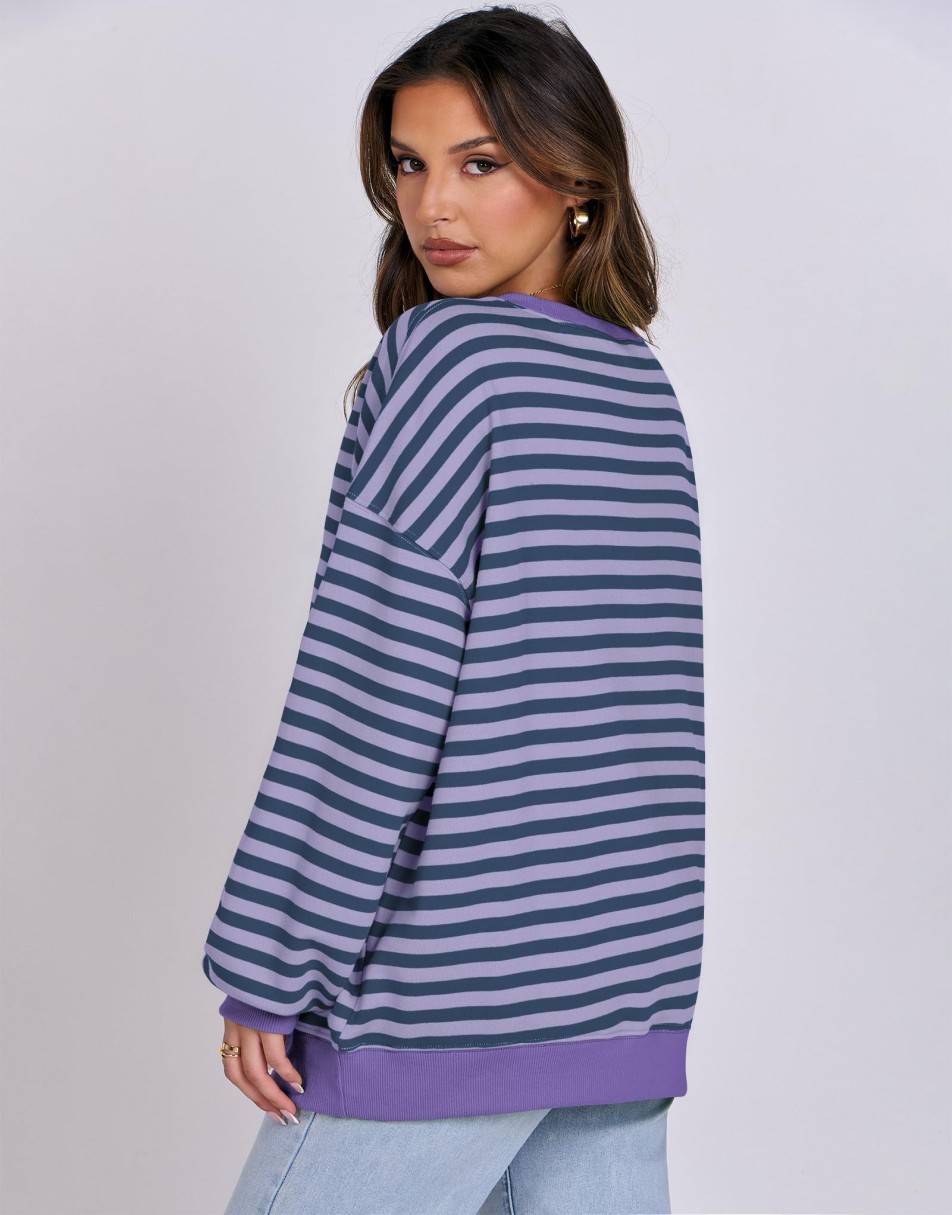 Features - Women's Oversized Sweatshirts, crew neck, long sleeve, Striped. The women Loose Pullover tops great for daily wear, school, office, work.