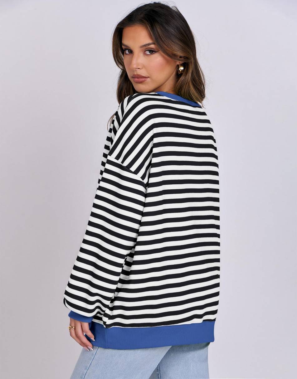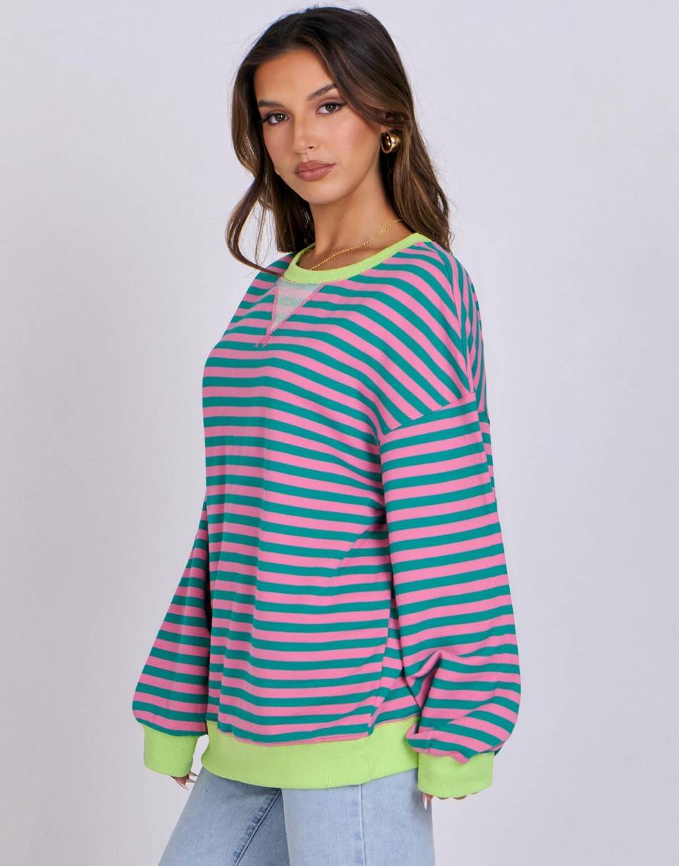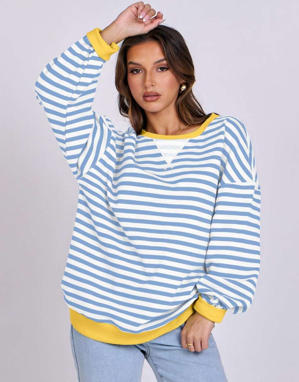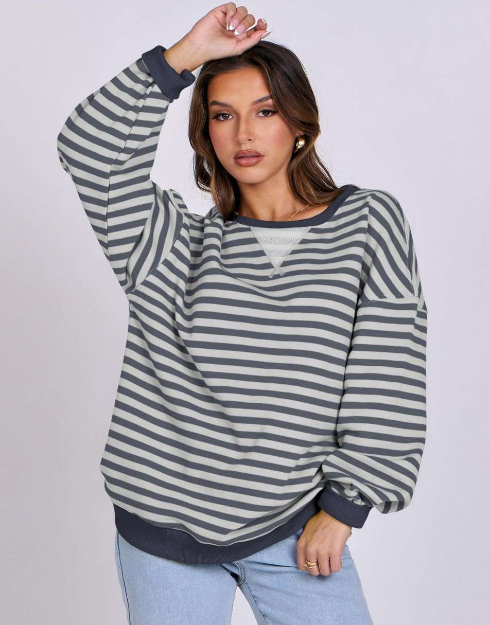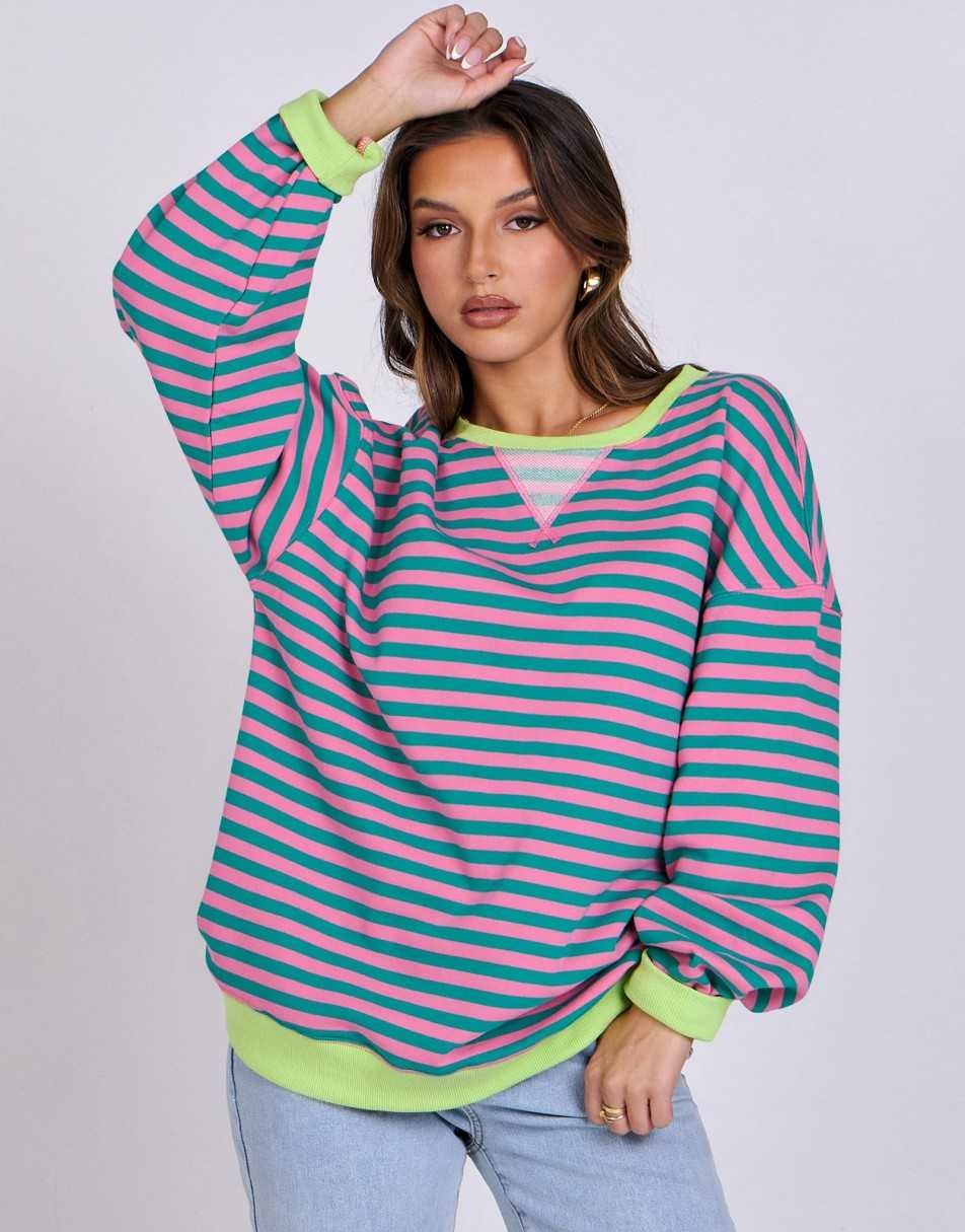 Features - Women's Oversized Sweatshirts, crew neck, long sleeve, Striped. The women Loose Pullover tops great for daily wear, school, office, work.