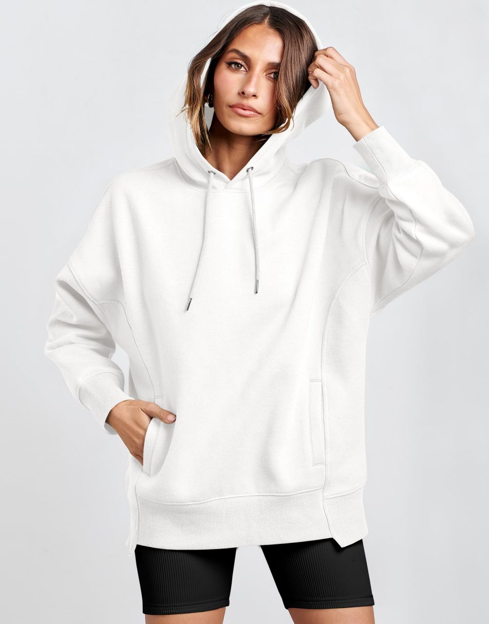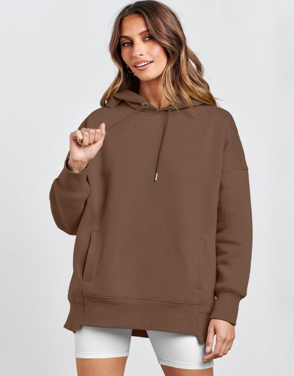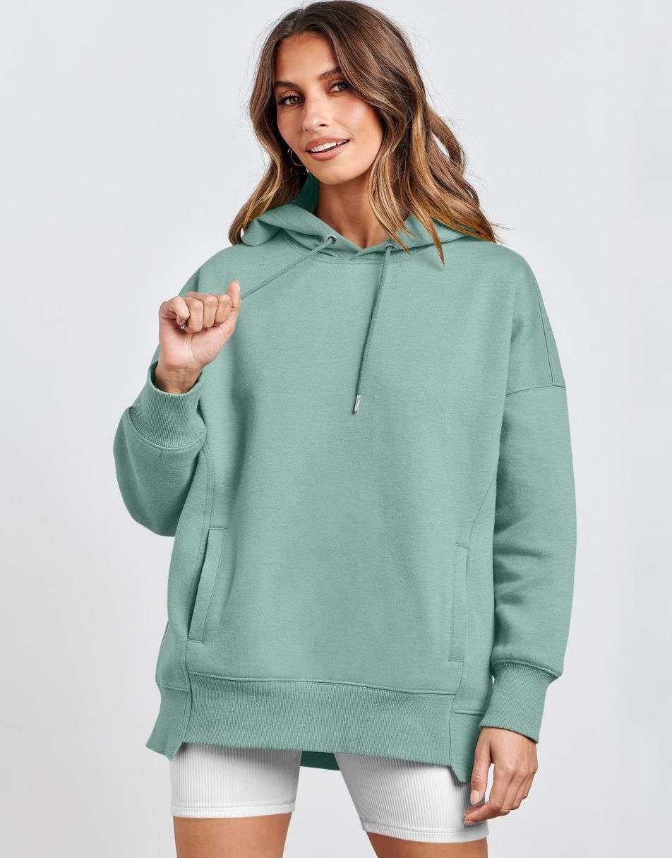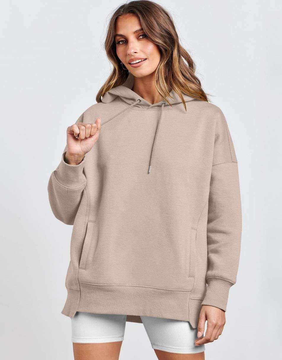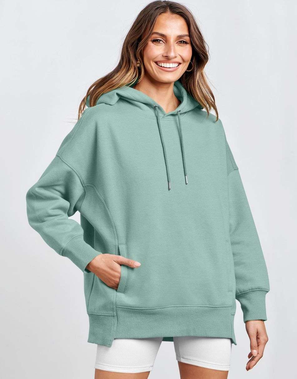 Design: Oversized hoodie with adjustable drawstrings, drop shoulder, ribbed hem and cuffs, fleece lining. Fall winter fashion clothes, and y2k fleece casual style.