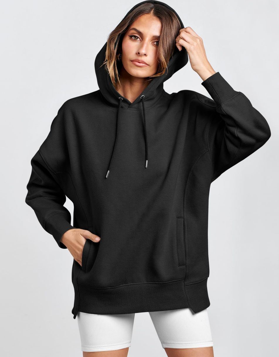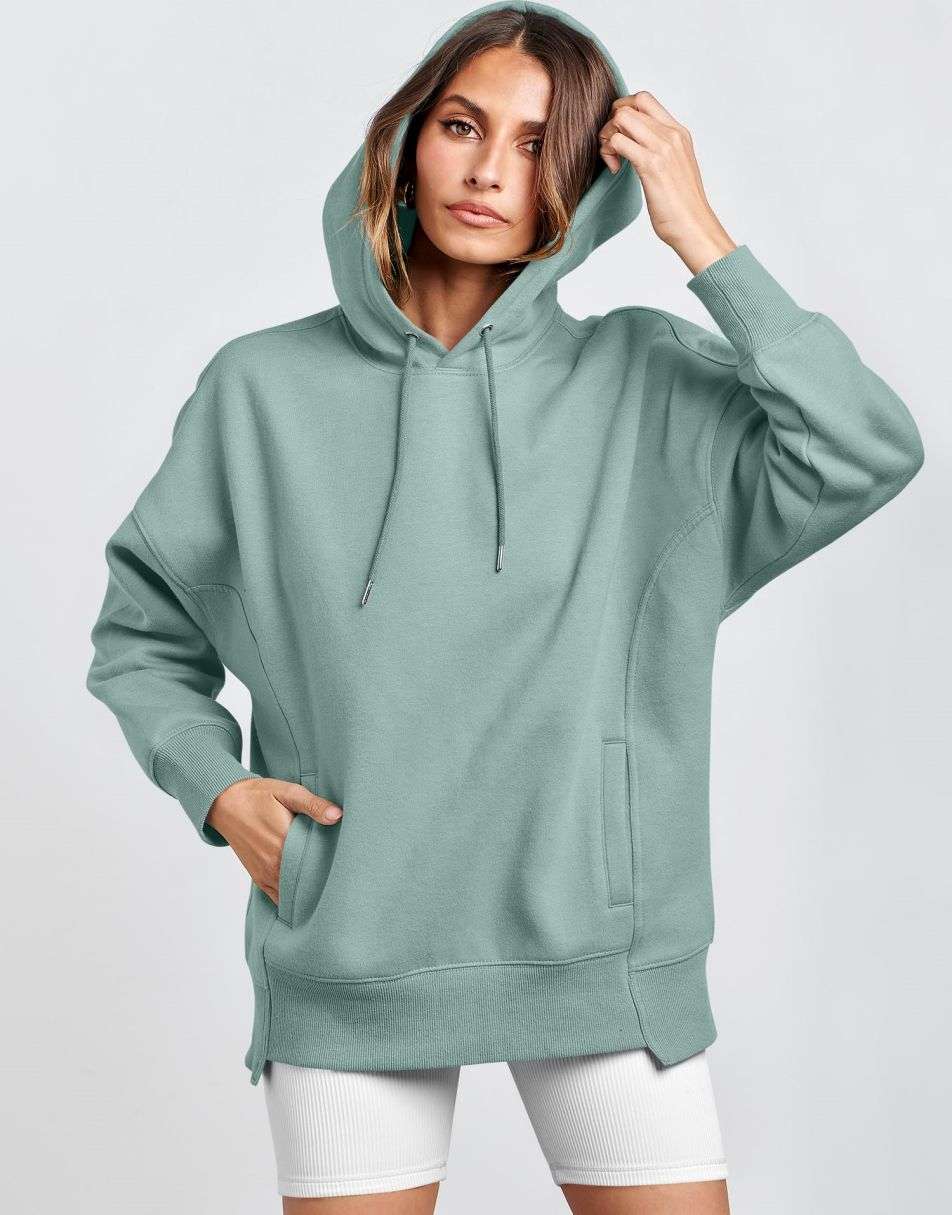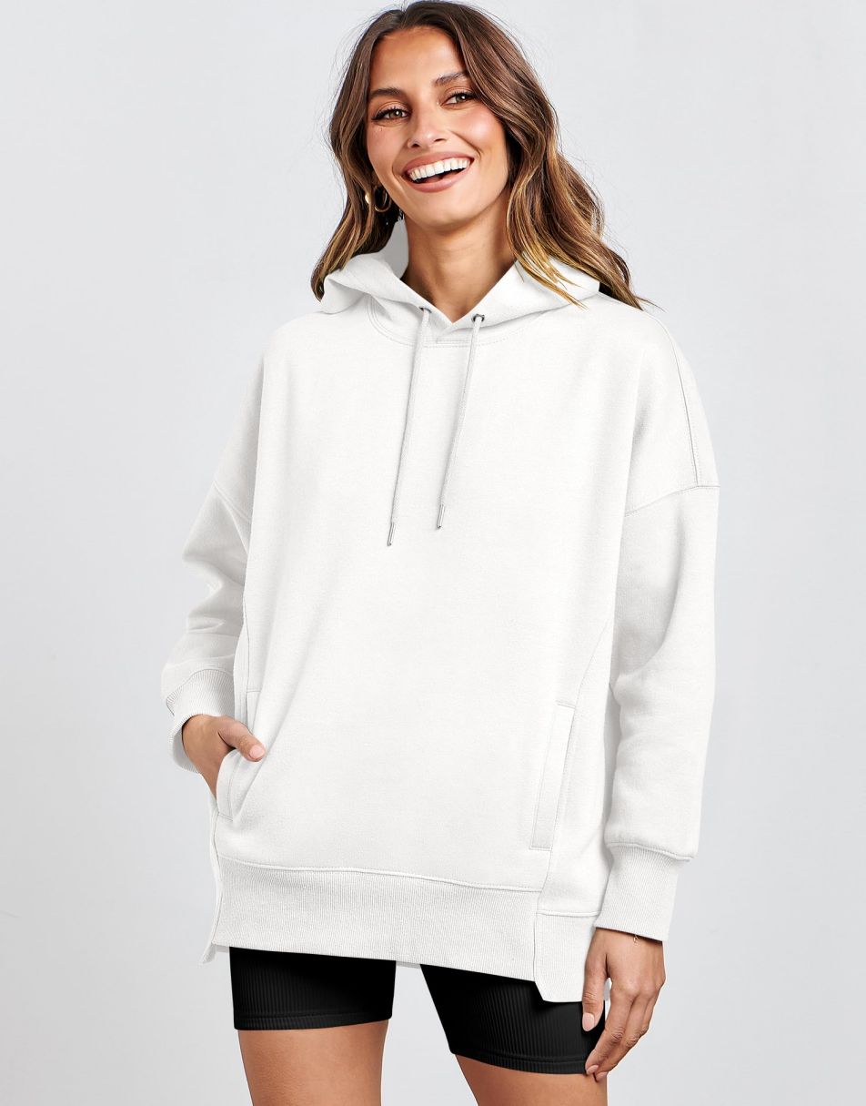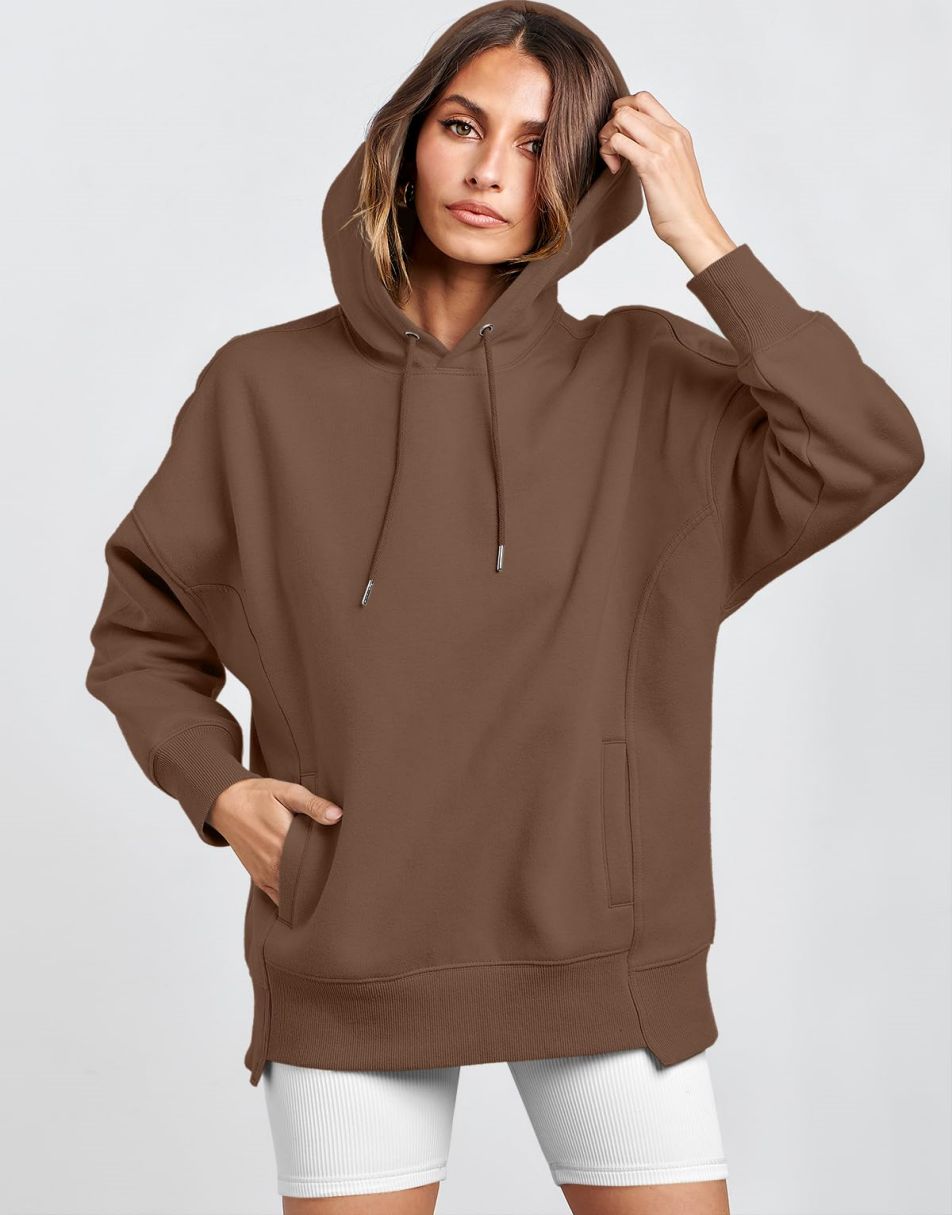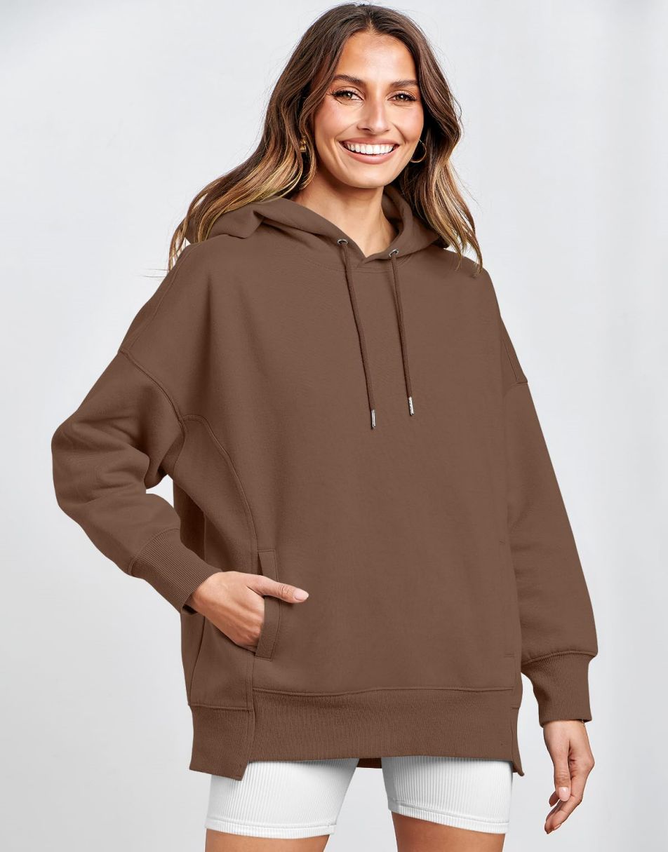 Design: Oversized hoodie with adjustable drawstrings, drop shoulder, ribbed hem and cuffs, fleece lining. Fall winter fashion clothes, and y2k fleece casual style.